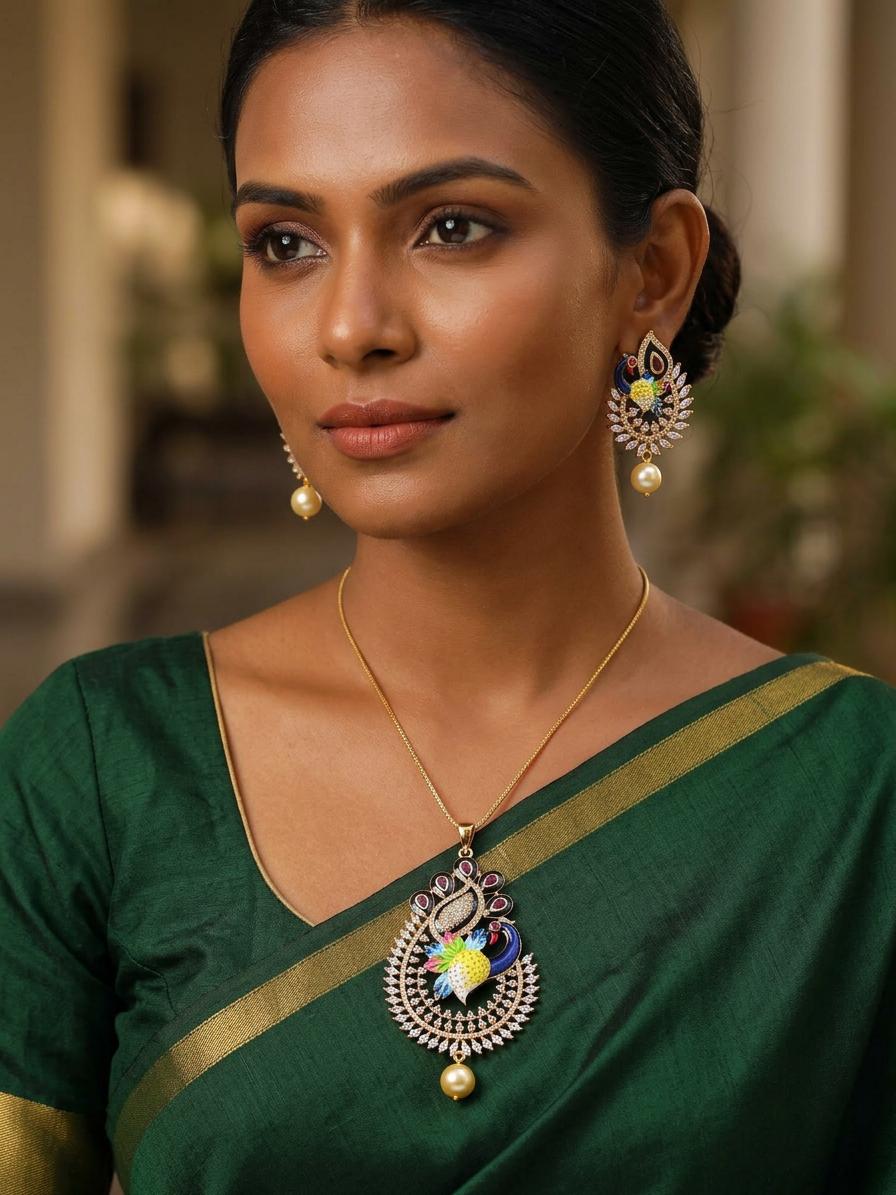 Designer Peacock Pendant and Earrings Set with Cubic Zirconia