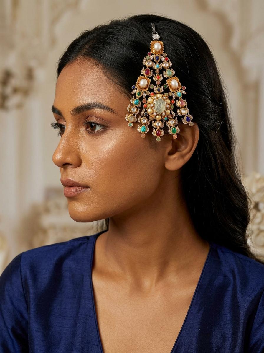 The Prajna Jhoomar is a masterpiece of craftsmanship, featuring a harmonious blend of colors and textures. The rich gold-tone alloy provides a luxurious backdrop for the dazzling array of stones. From shimmering pearls to vibrant rubies, emeralds, and sapphires, the piece is a true spectacle of color. The careful arrangement of the stones creates a visually striking effect, ensuring that this jhoomar will be the focal point of any outfit. The interplay of polished stones and delicate metalwork adds depth and complexity to the design, making it a truly unique and unforgettable piece.
