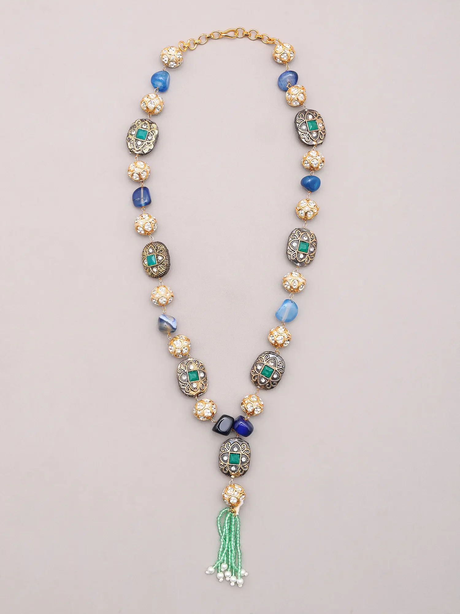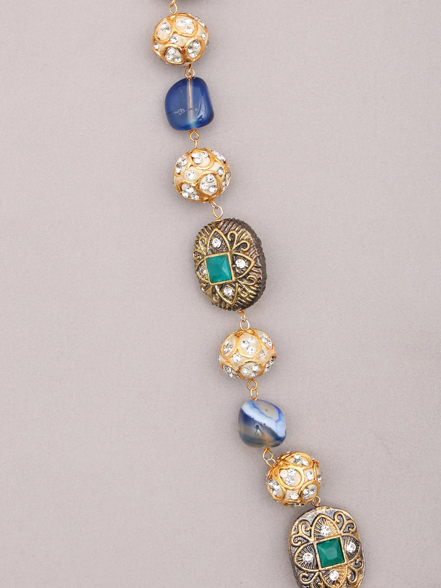 Each element of this ensemble is a testament to meticulous craftsmanship, sculpted from enduring brass. Skilled artisans have painstakingly selected and arranged a symphony of richly hued stones and intricately designed beadwork. The substantial feel and polished finish speak volumes about the dedication poured into its creation, ensuring a piece that feels as luxurious as it looks.