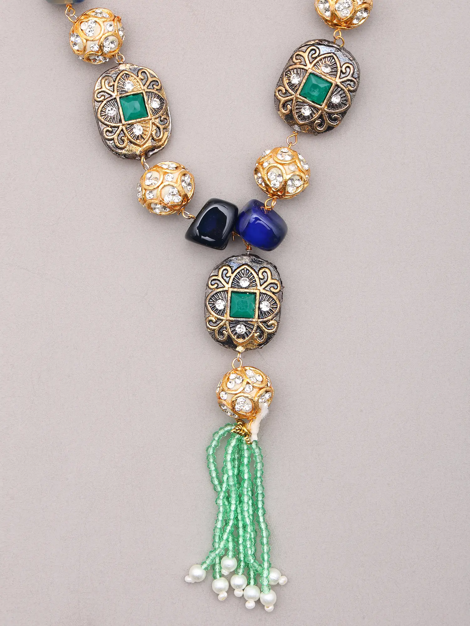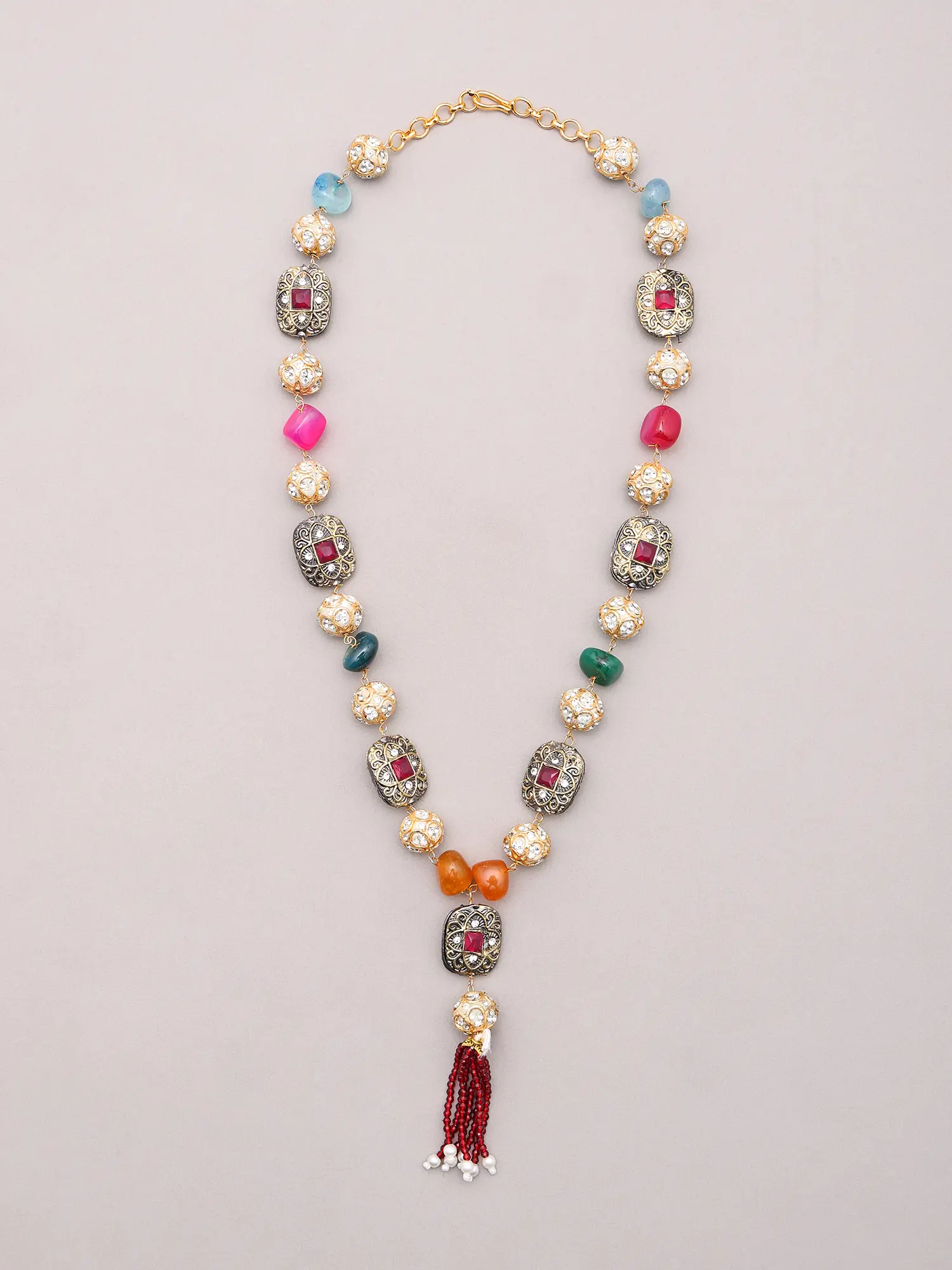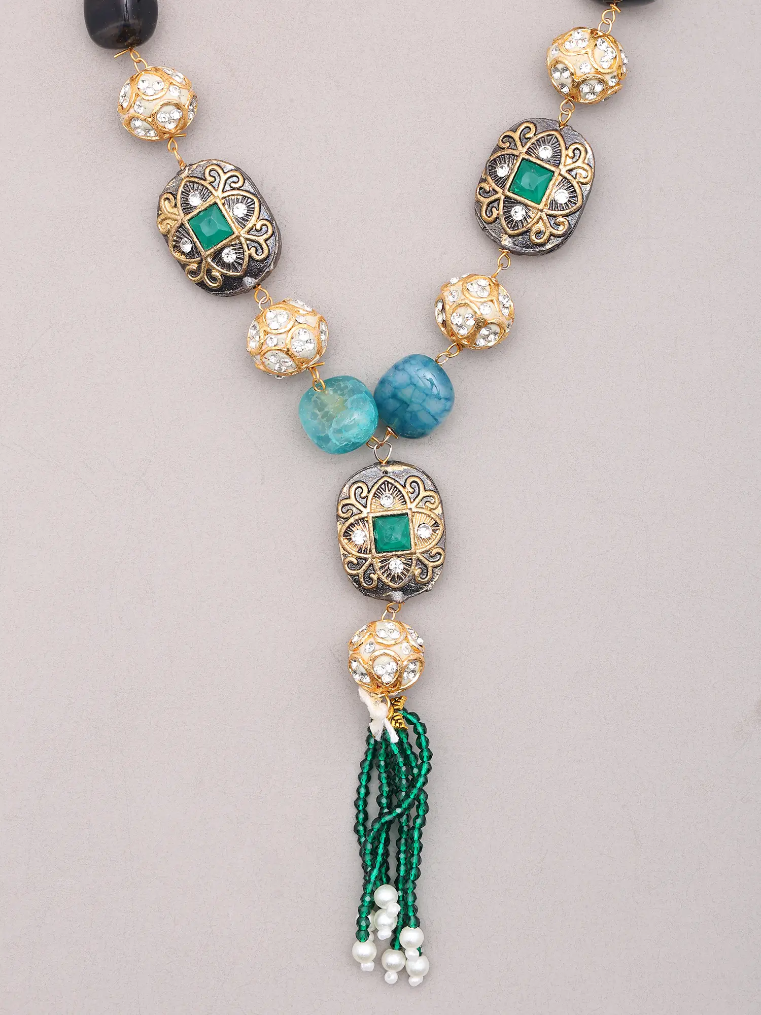 The necklace itself drapes gracefully, measuring a delicate 13 inches in length, perfectly accentuating the décolletage. It features a cascade of multicoloured stones, interspersed with ornate brass beads that gleam with intricate patterns. A stunning beaded tassel, adorned with pearls, adds a captivating flourish to the central pendant. The accompanying earrings echo this exquisite design, each measuring a graceful 1.7 inches in height and 0.4 inches in width, featuring a complementary stone and beaded sphere that mirrors the necklace's captivating aesthetic.