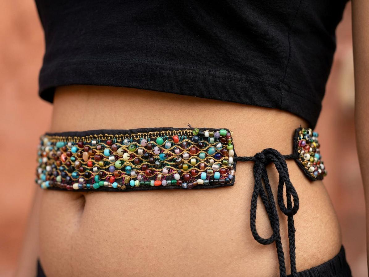 This Multicolour Waist Belt, a stunning Kamar Bandh, is a vibrant accessory adorned with an array of differently shaped stones meticulously sewn onto the fabric. The colorful stones create a striking contrast, enhancing its visual appeal. Golden threads intricately stitched in a wavy pattern between the stones add a touch of glamour. This accessory not only serves as a dazzling waist adornment but also showcases fine craftsmanship, making it a versatile and eye-catching piece to elevate traditional attire or add a touch of elegance to contemporary ensembles.