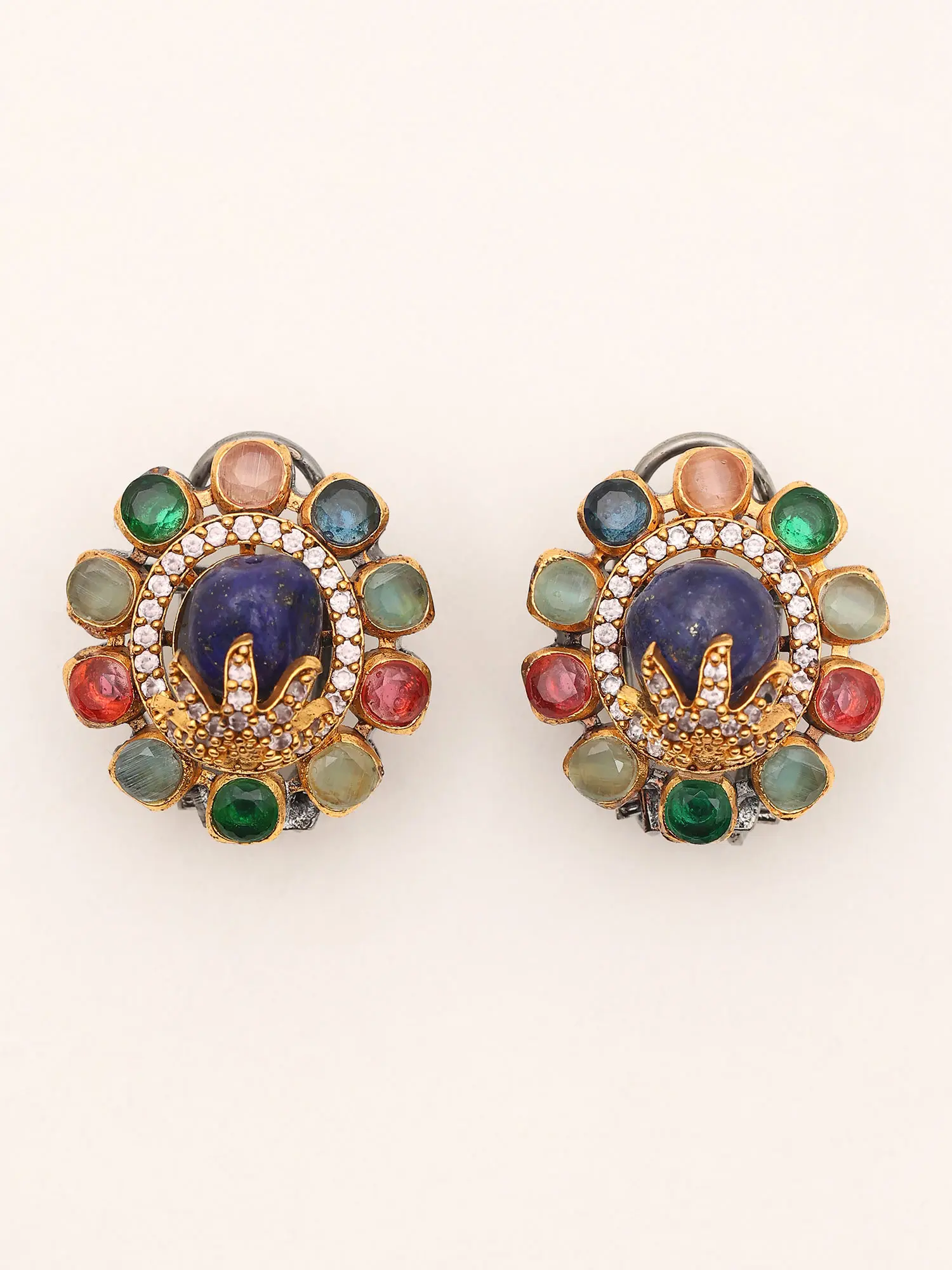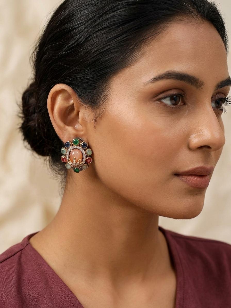 The earrings feature a captivating blend of gemstones, including vibrant emeralds, deep sapphires, rich rubies, and delicate moonstones. These stones are expertly set around a central sunstone, creating a dazzling floral pattern. The meticulous placement of each stone ensures a harmonious balance of color and light, creating a truly mesmerizing effect. The glistening sunstone at the center adds a touch of warmth and luminosity, enhancing the overall beauty of the piece.
