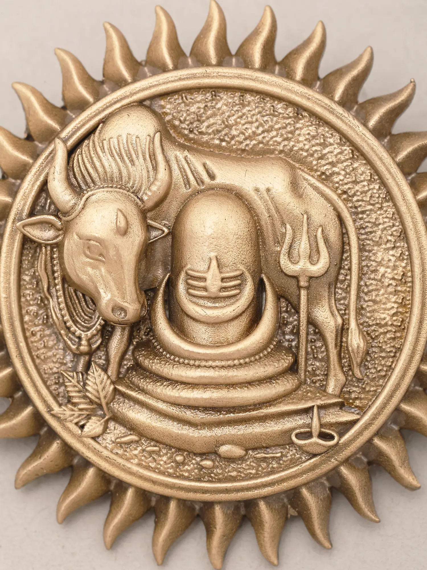 This imagery is deeply rooted in Hindu traditions, symbolizing the harmonious relationship between the divine and its devoted followers. The Shiva Lingam represents the formless aspect of Lord Shiva, the supreme being, while Nandi embodies unwavering faith and loyalty. The surrounding sun rays further amplify the sense of divine energy and universal presence, connecting the wearer or observer to a rich spiritual heritage.