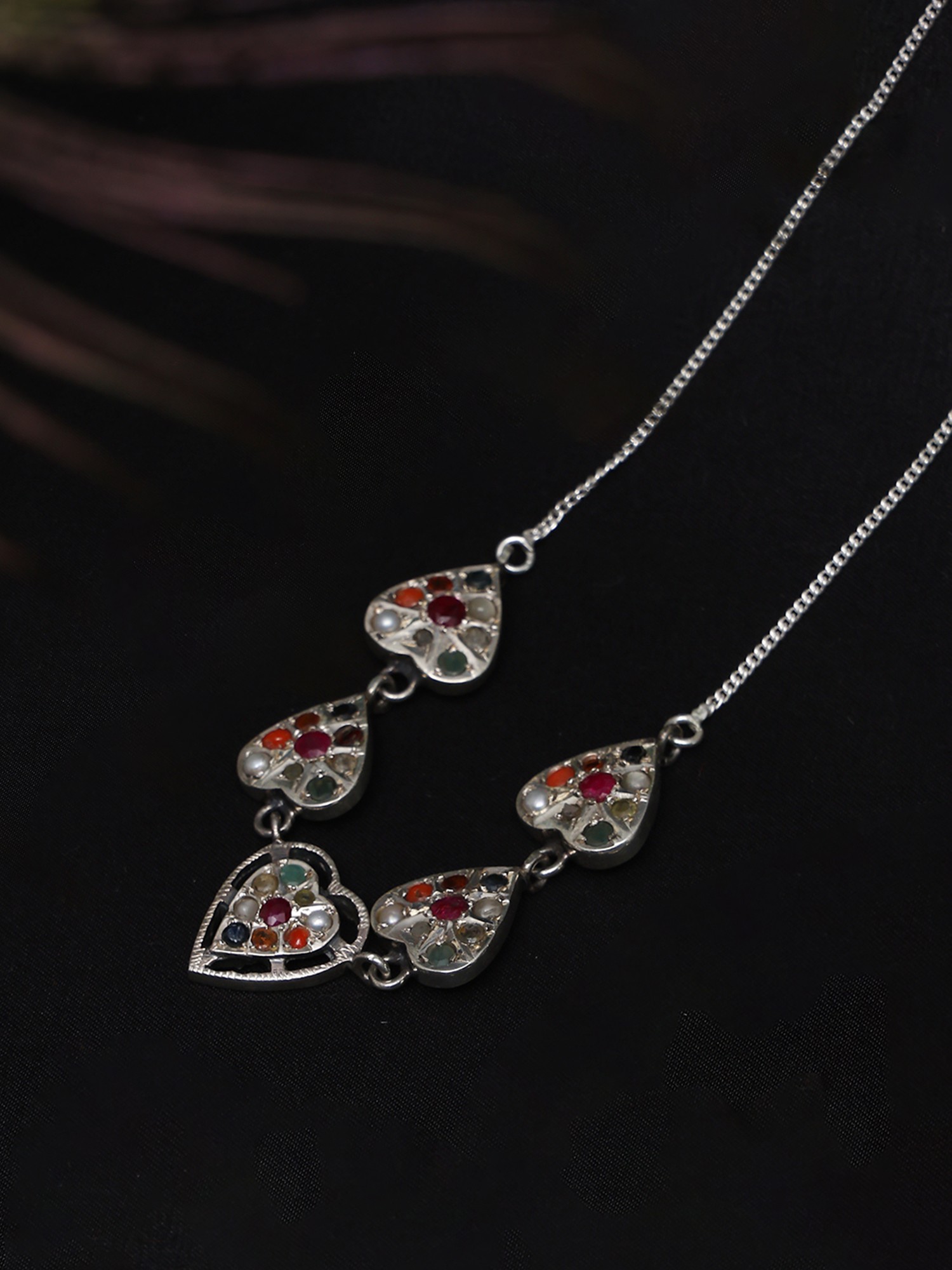 Discover a captivating blend of timeless tradition and modern aesthetics with this exquisite piece. A delicate creation, it effortlessly marries the classic charm of Navaratna jewelry with a universally adored symbol of love. This necklace offers a unique way to express affection, blending heartfelt sentiment with cultural richness. The shimmering silver setting provides a brilliant backdrop for the vibrant gemstones. It's more than just an accessory; it’s a conversation starter, a testament to refined taste, and a thoughtful gift for someone special.