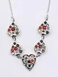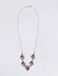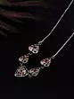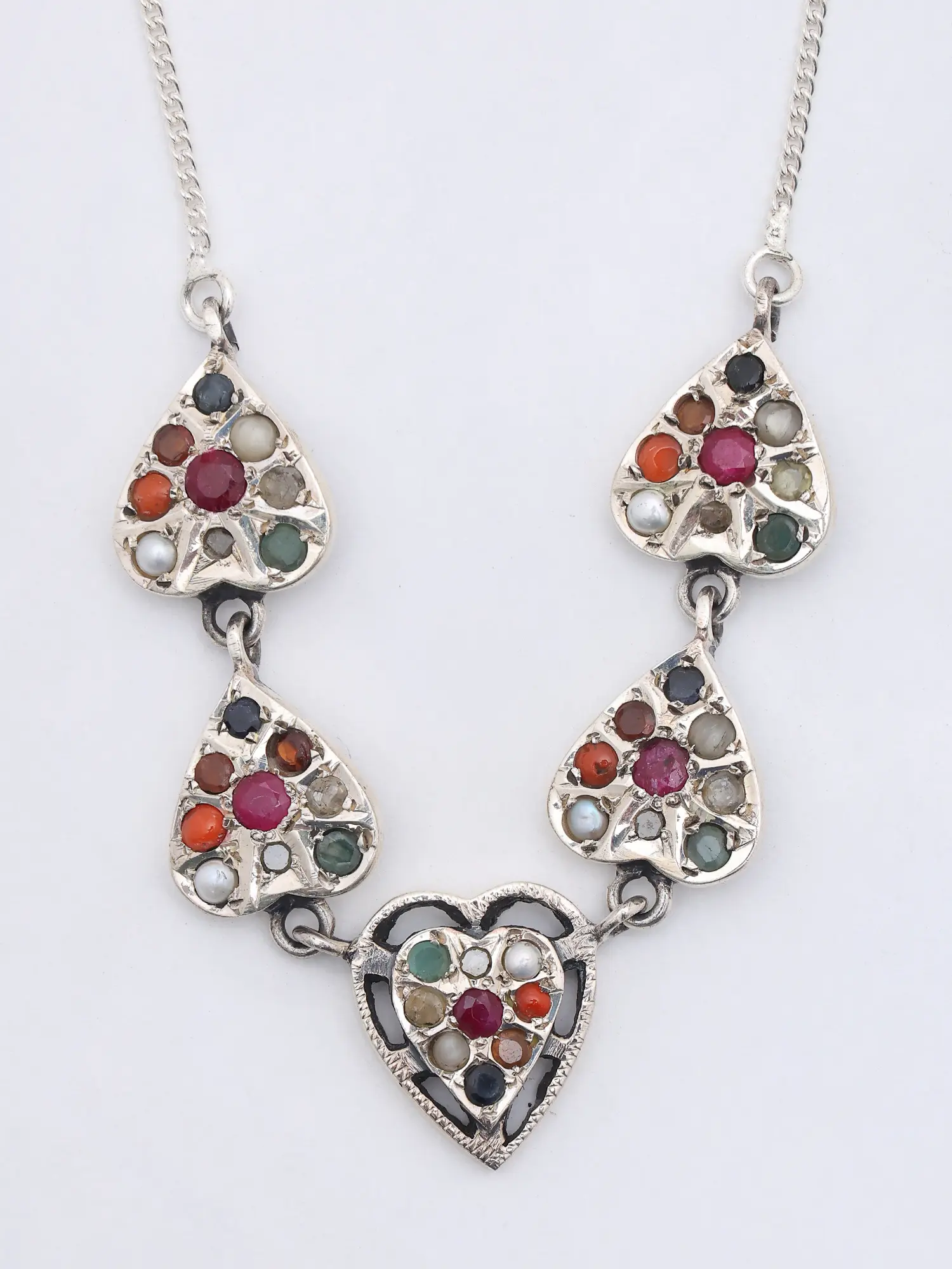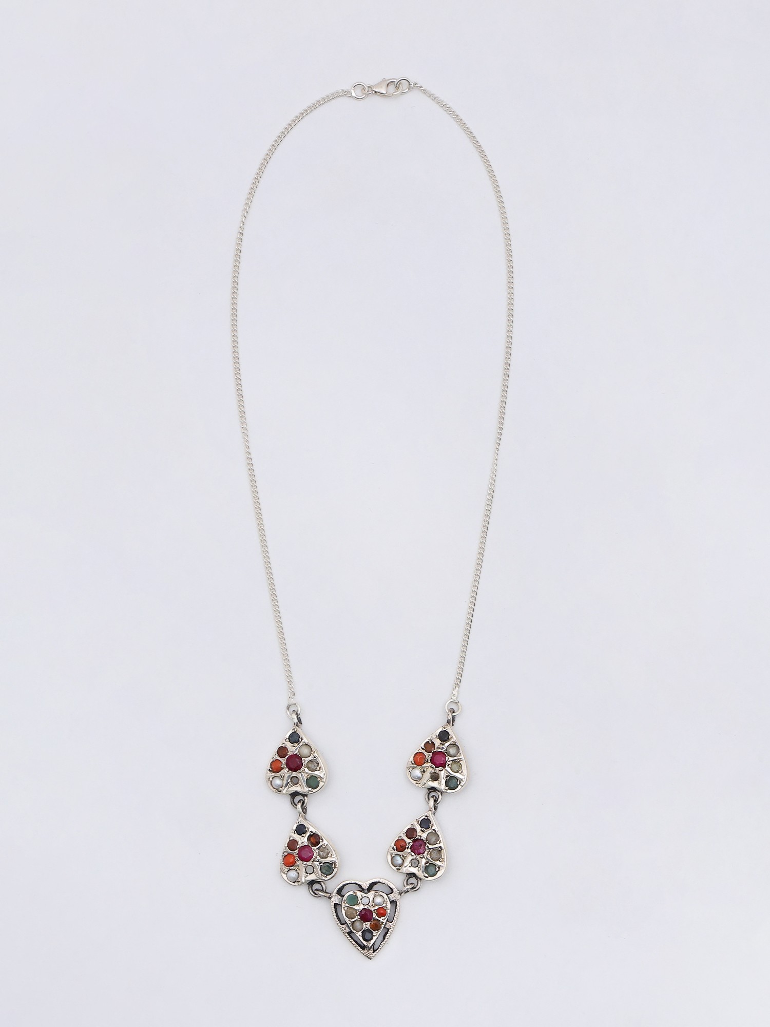 Meticulously crafted with attention to detail, this necklace features a gleaming sterling silver chain that adds a touch of understated luxury. The heart-shaped pendants are delicately arranged, each one holding a vibrant array of carefully selected gems. The use of sterling silver ensures durability and a lasting shine. The design speaks to the timeless elegance of traditional jewelry. The lightweight construction ensures a comfortable fit, making it suitable for all-day wear. Each stone is carefully set to maximize its brilliance and create a harmonious balance of colors and textures.