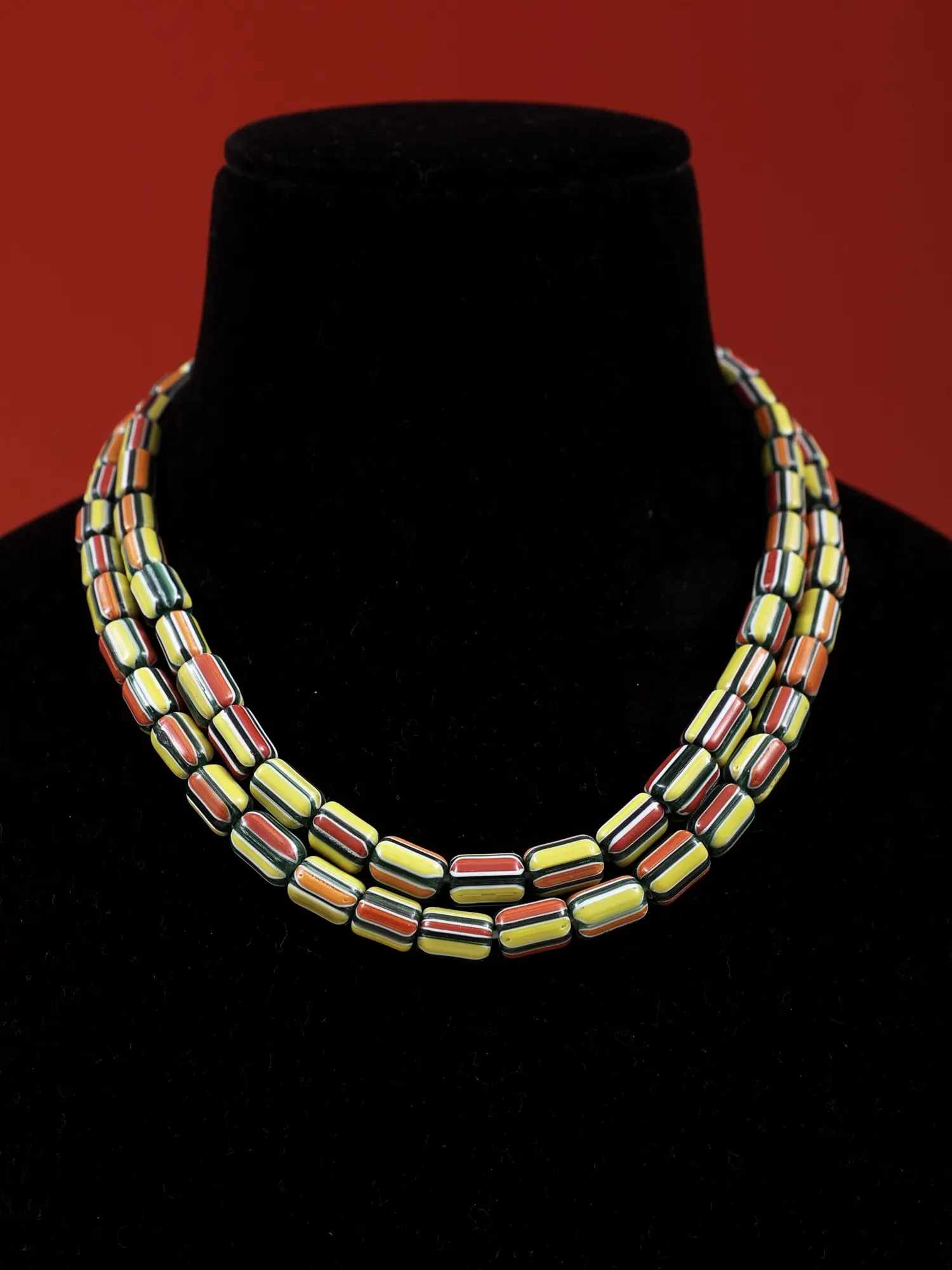This stunning necklace is a true testament to the artistry of Nepali lampwork beadmaking. The vibrant yellow and orange stripes, set against a deep black background, create a captivating visual effect. Each barrel-shaped bead is meticulously crafted, showcasing the skill and precision of the artisans. The warm, rich tones make this necklace a perfect accessory for adding a pop of color to any outfit. It’s a piece that's both eye-catching and elegant, perfect for adding a touch of bohemian flair to your style. The multiple strands create a beautifully layered look, offering a bold yet refined aesthetic.