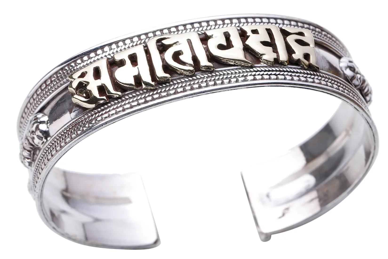 Discover a piece of spiritual elegance with this exquisite cuff bracelet, meticulously crafted from premium sterling silver. This captivating accessory is more than just jewelry; it’s a wearable testament to profound Buddhist wisdom, designed to bring a sense of calm and mindfulness to your everyday life. The center of the bracelet prominently features the revered Sanskrit mantra, "Om Mani Padme Hum," rendered in a striking gold-tone inlay that beautifully contrasts with the cool silver. Each syllable of this powerful mantra is deeply significant, representing compassion, universal harmony, and spiritual awakening.