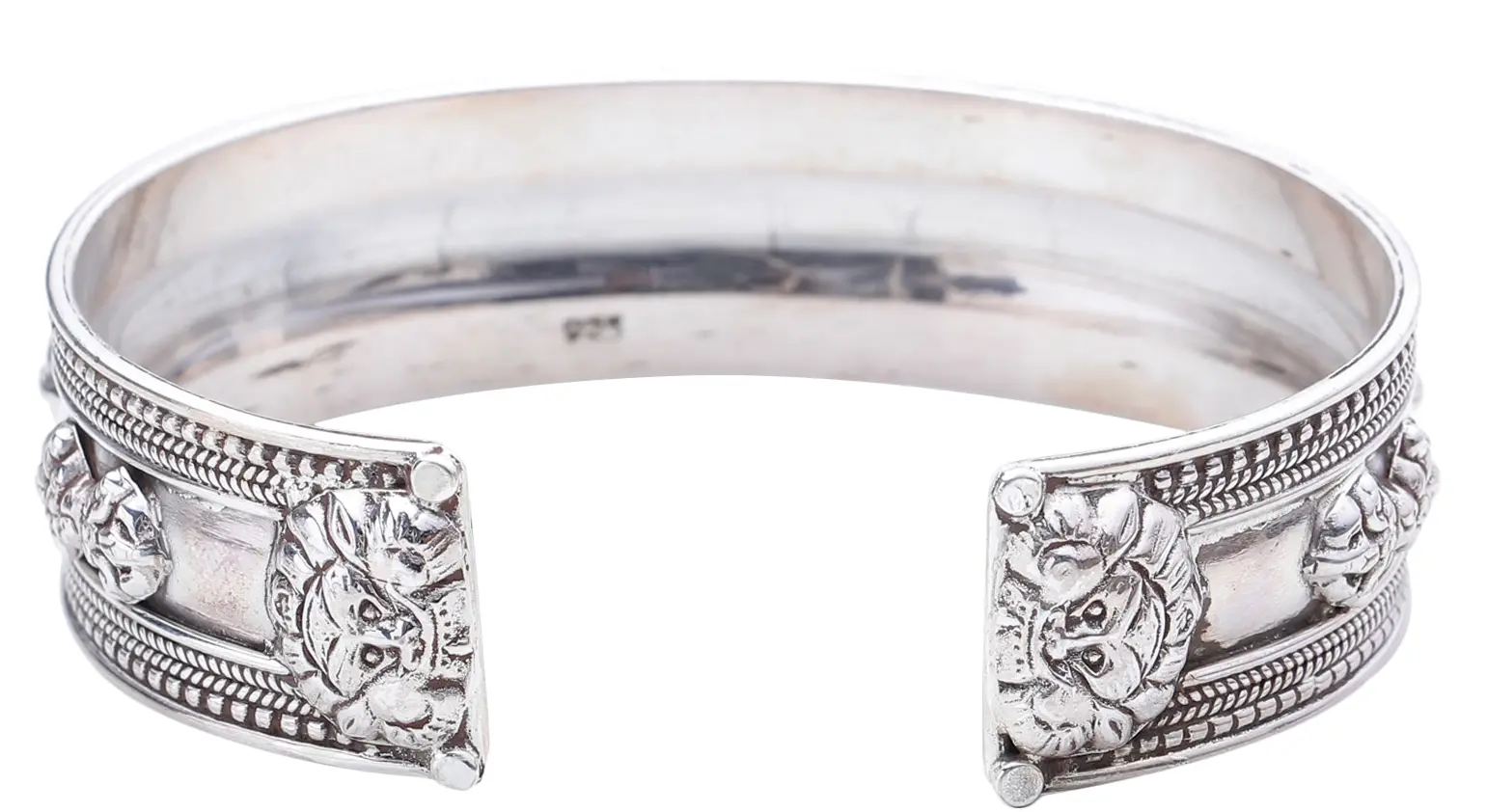 The sterling silver band itself is a work of art. It is intricately detailed with a textured rope-like border that adds depth and visual interest. Flanking the central mantra are delicately embossed lion heads, a powerful symbol in Tibetan Buddhism representing courage, strength, and the dispelling of fear. These symbolic elements, combined with the sacred mantra, create a truly meaningful and aesthetically pleasing piece. The adjustable nature of the cuff ensures a comfortable and personalized fit for a variety of wrist sizes, making it a versatile addition to any jewelry collection.