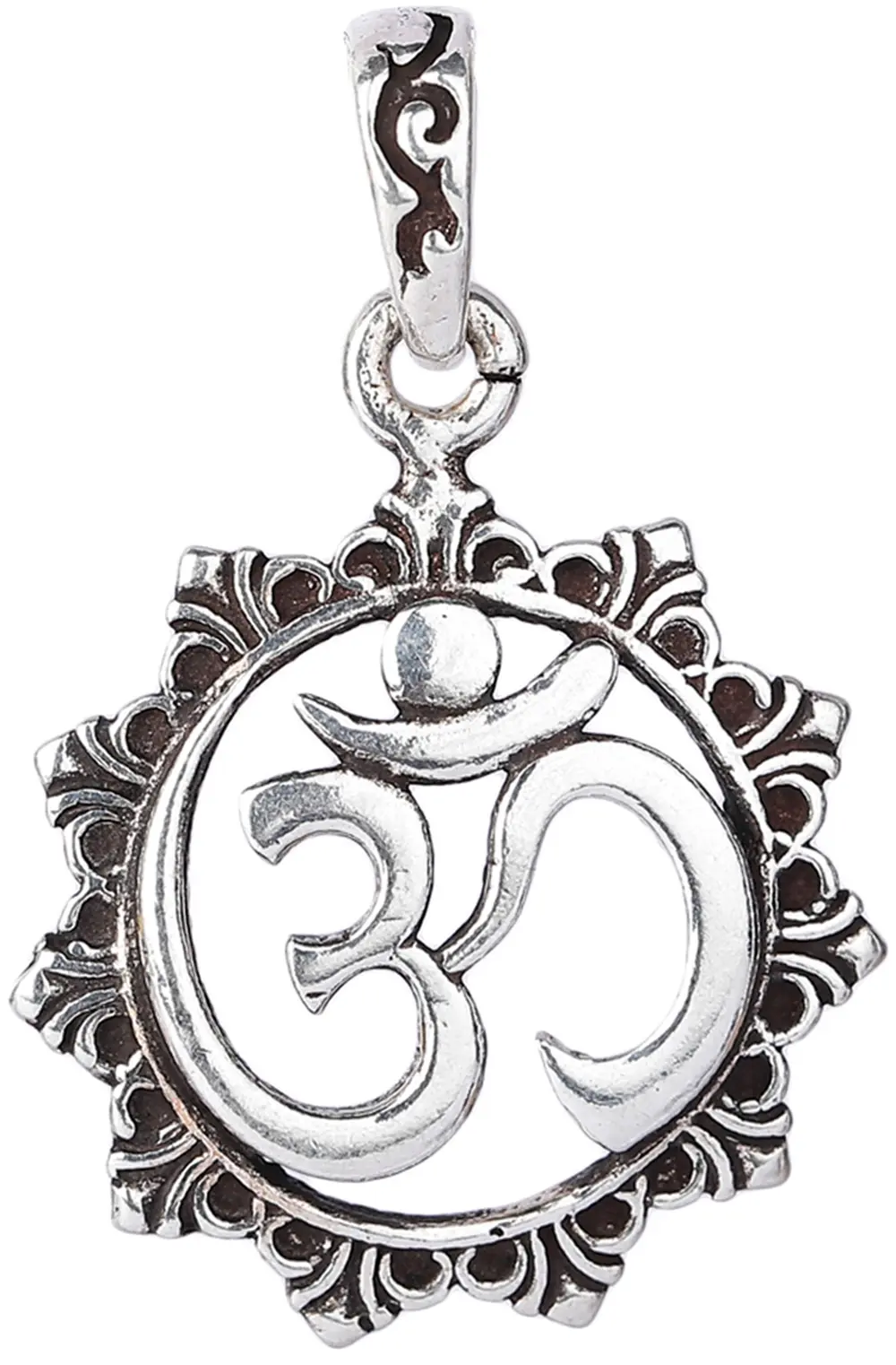 The Om symbol, pronounced "Aum," is more than just a letter; it is a mantra and a sacred invocation that resonates with peace, harmony, and spiritual awakening. It is believed to be the sound from which all creation emanates and to which all eventually returns. Paired with the mandala, a spiritual and ritual symbol in Hinduism and Buddhism representing the universe, this pendant becomes a powerful amulet for inner peace and connection to the divine. Each detail of this pendant speaks to the skilled craftsmanship, with the sterling silver reflecting a bright, polished finish that highlights the delicate curves of the Om and the complex patterns of the mandala. The slightly antiqued finish within the etched areas of the mandala adds a touch of depth and character, making the design truly pop.