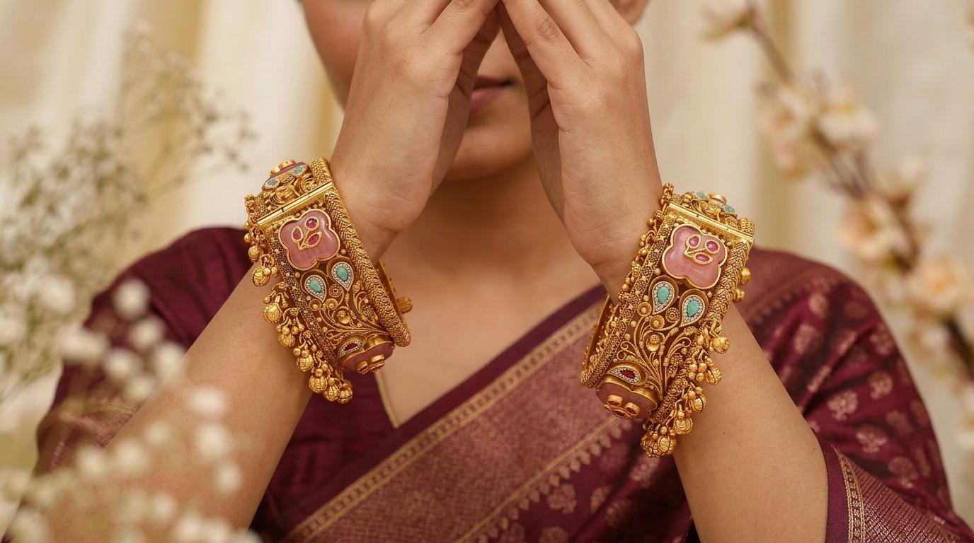 Set includes two ornate bangles, perfect for enhancing traditional or contemporary ensembles.