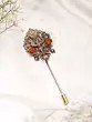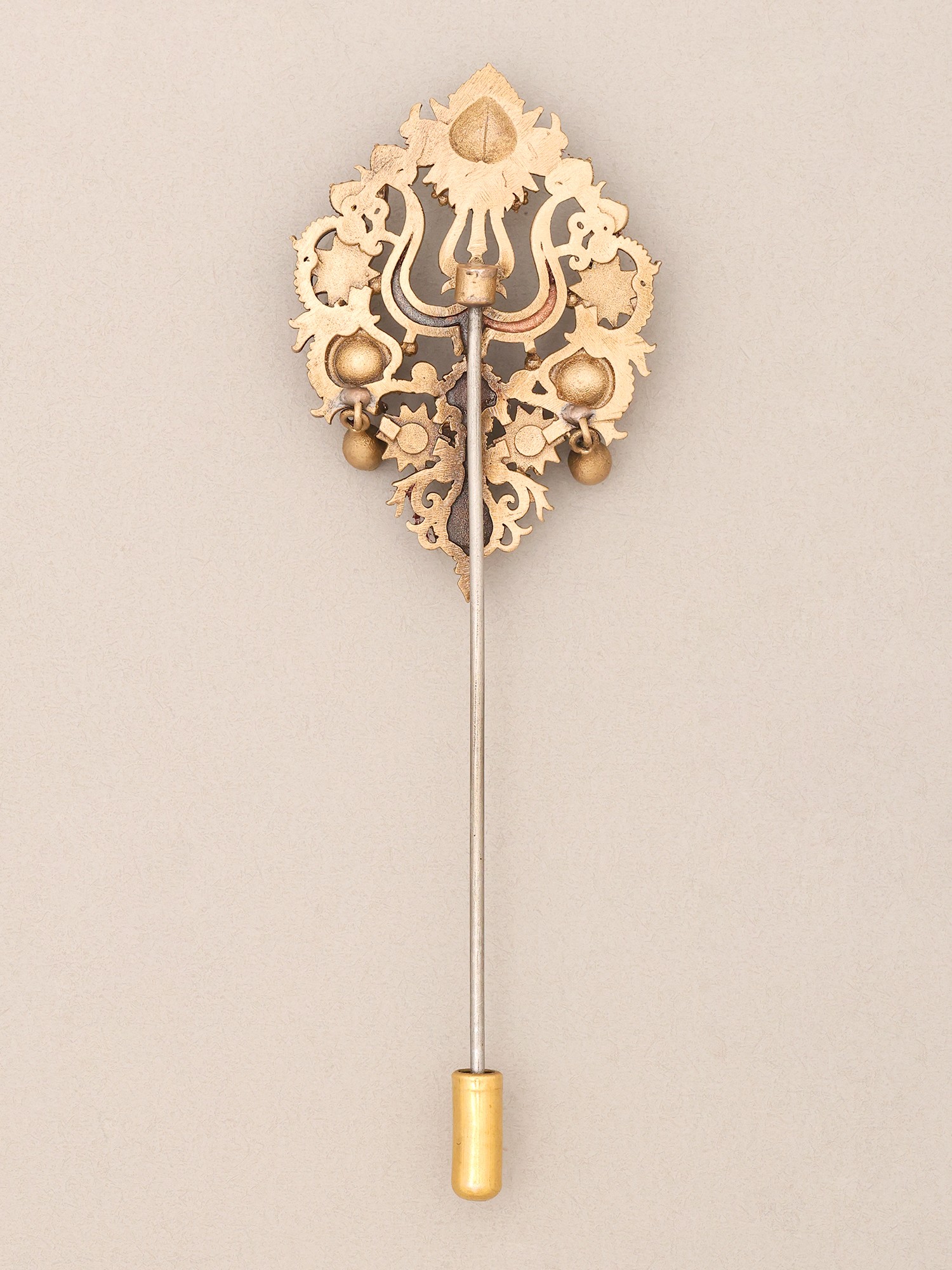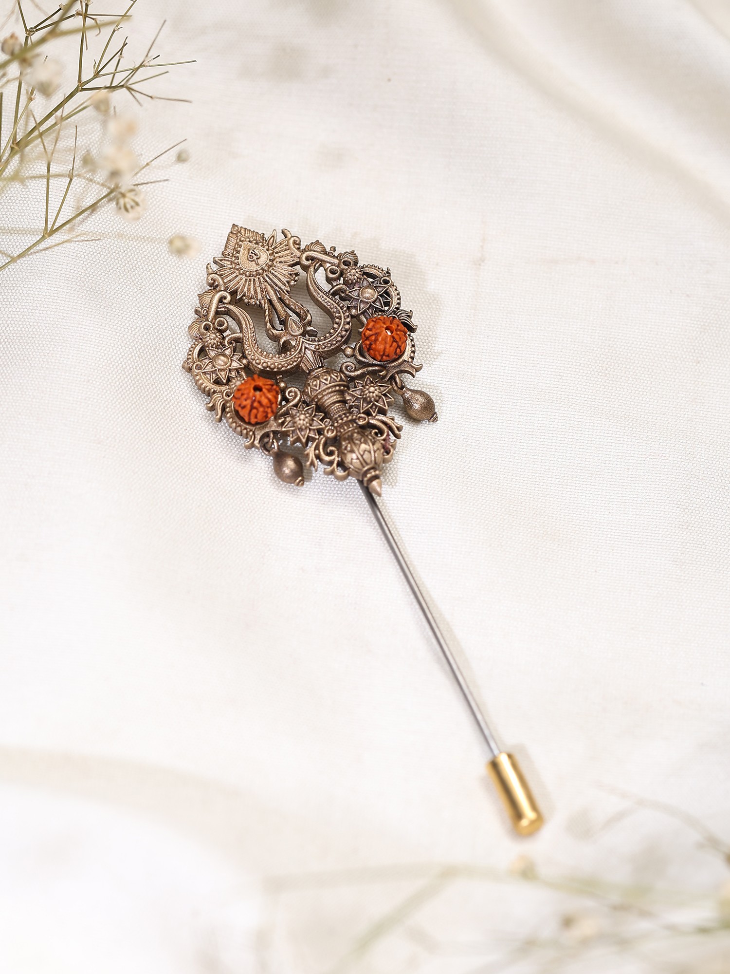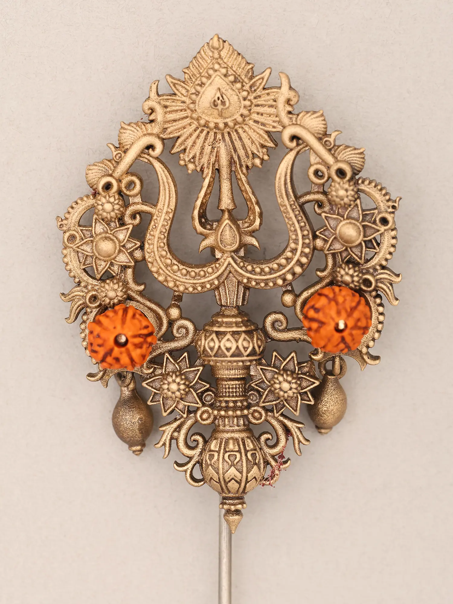 Ornate Trishul Brass Lapel Pin (Stick Brooch) with Rudraksha