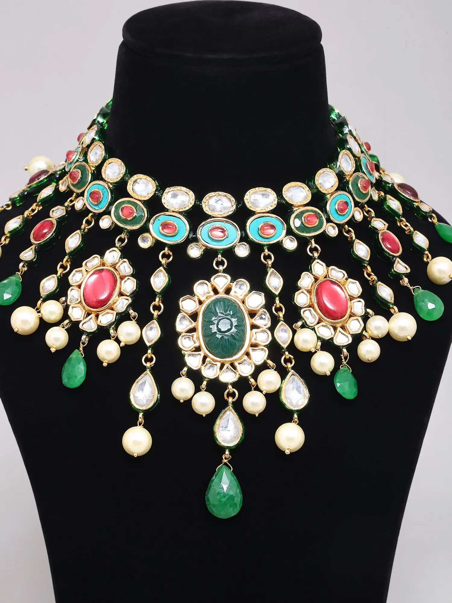 Kundan Lacquer Necklace Set with Emerald and Red Gemstone Drops