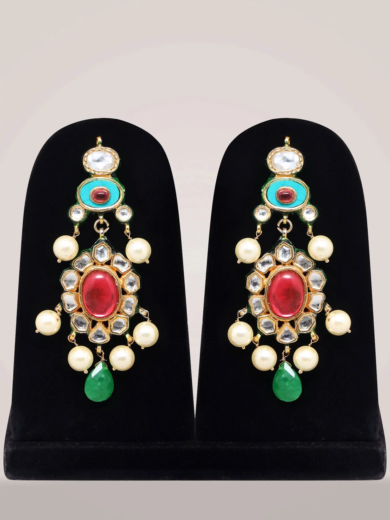 Adorn yourself with a breathtaking arrangement of oval-cut stones, each carefully selected for its rich color and clarity. Deep emerald green stones, vibrant ruby reds, and serene turquoise accents are artfully interspersed, creating a visual feast. Lustrous pearls cascade gracefully, their soft glow complementing the vibrant gemstones, while clear, faceted stones add a final touch of dazzling sparkle. The necklace, measuring approximately 16 inches in length and 6.2 inches in width, is finished with an adjustable dori, allowing for a personalized fit. Complementing earrings, measuring 3.4 inches in height and 1 inch in width, echo the necklace’s stunning design.