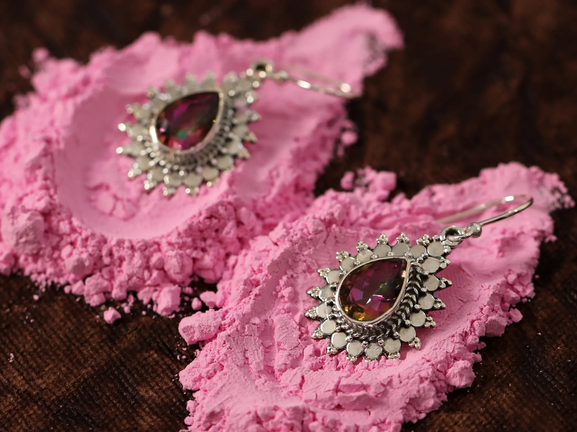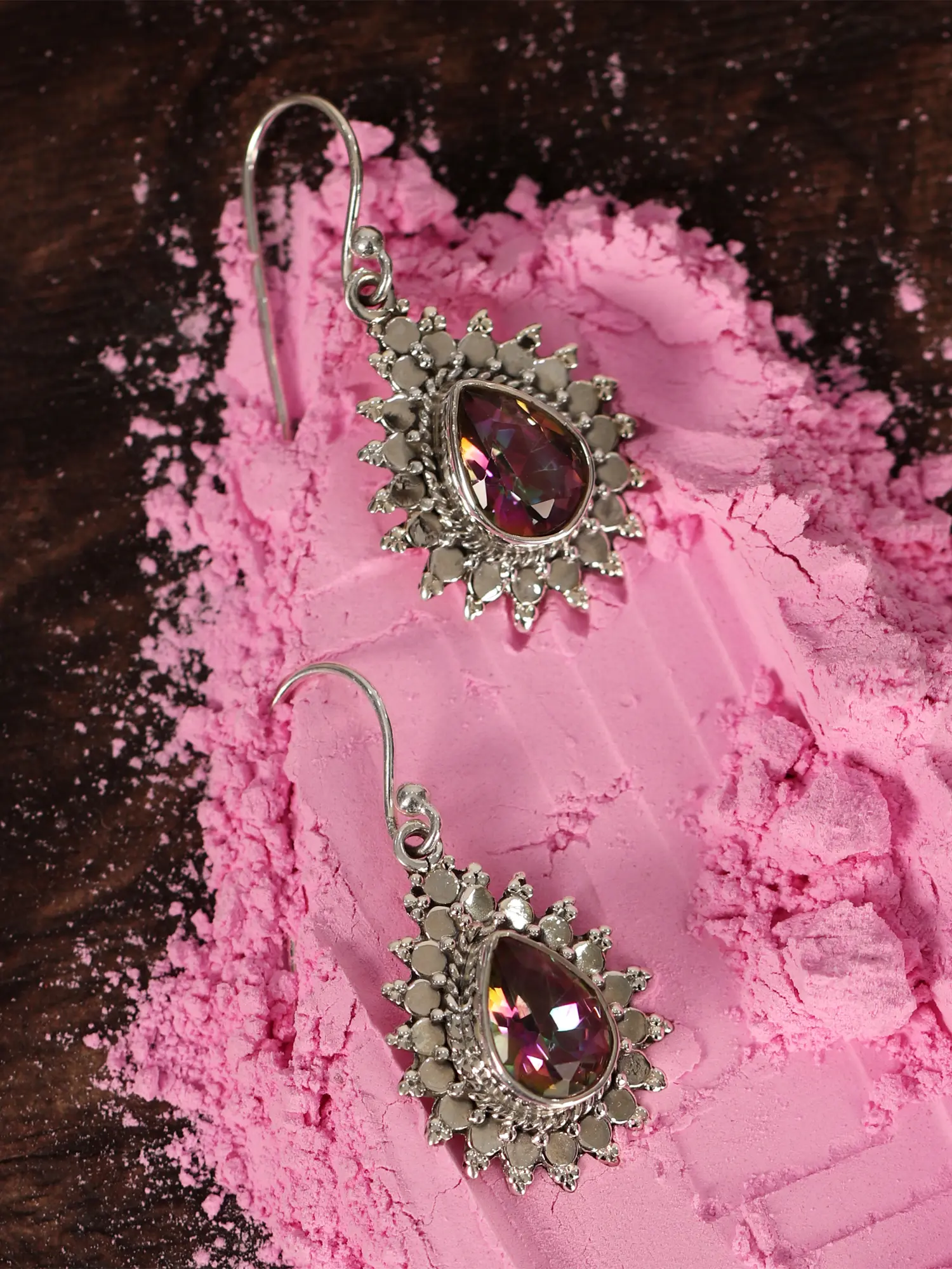 The earrings featured are crafted with oval-shaped sun mystic topaz stones set in sterling silver. Mystic Topaz is reputed for its shimmering colors and is believed to foster the fulfillment of pursuits. It is also thought to enhance interpersonal connections by fostering clarity, facilitating communication, and fostering understanding. The influence of mystic topaz is said to encourage introspection, leading to a profound comprehension of oneself and fostering personal development and growth. These earrings elegantly capture the gemstone's essence while providing a sophisticated accessory choice.