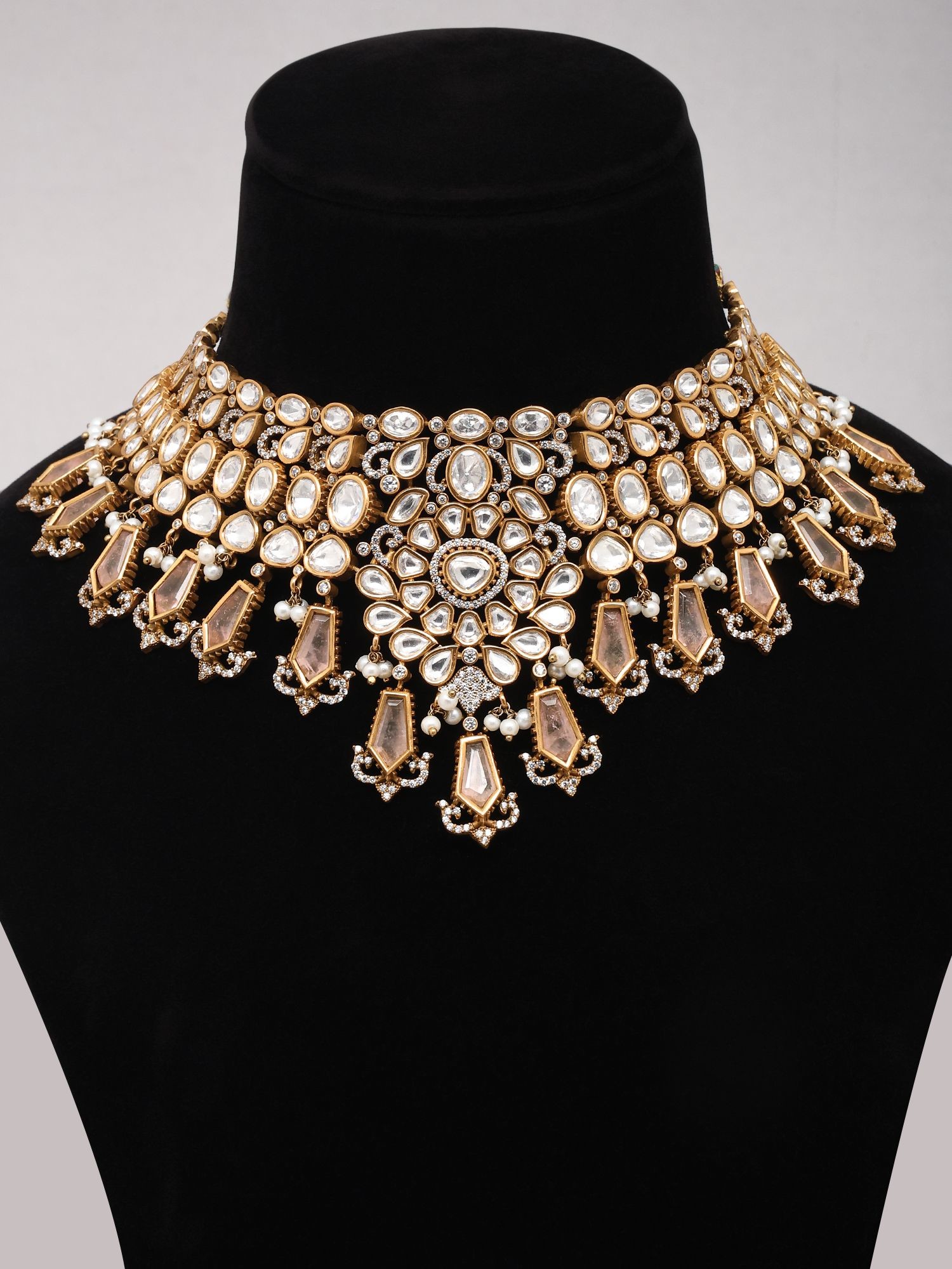 • Features shimmering peach drop stones intricately set within the Kundan design.