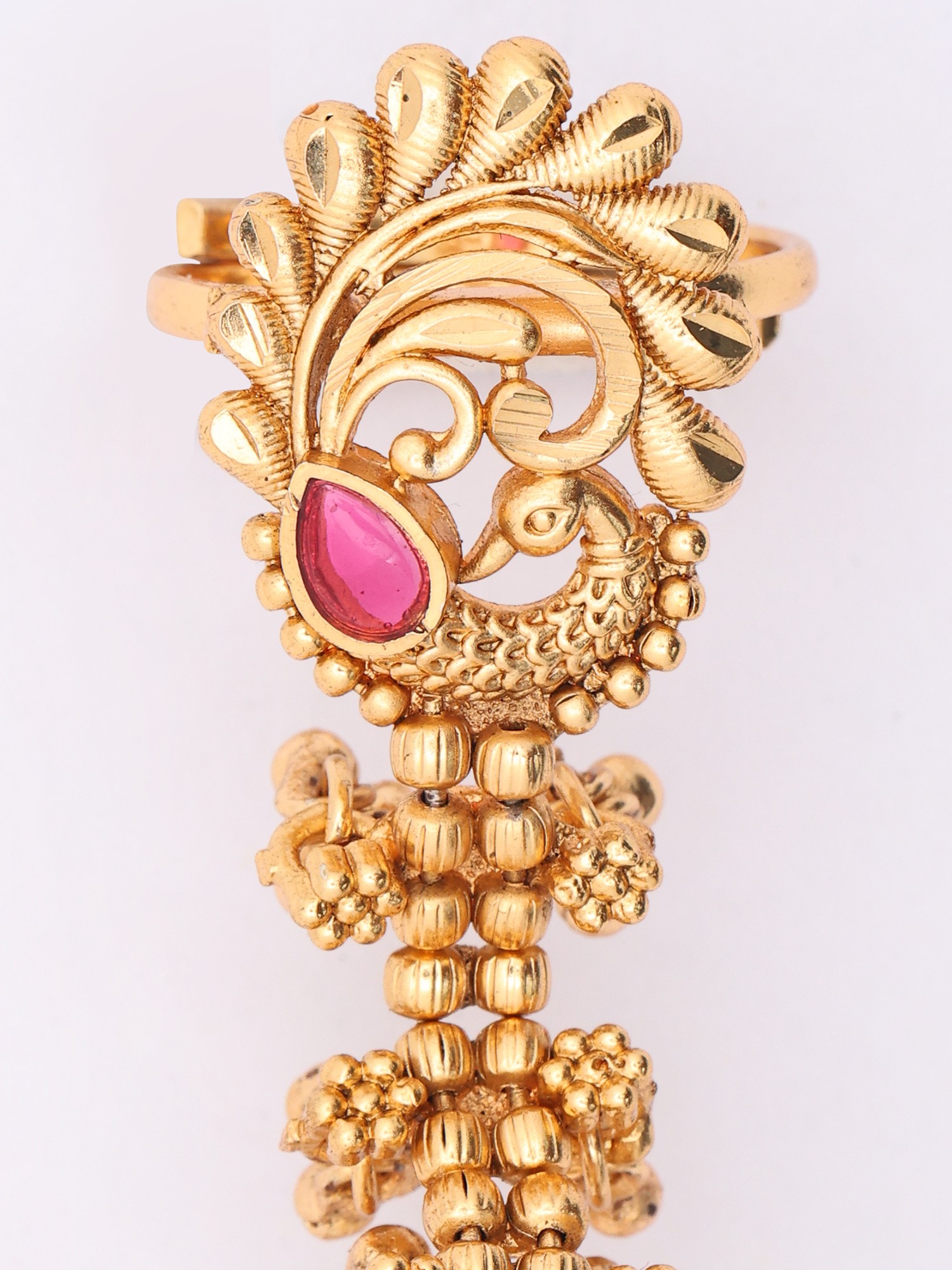 The striking peacock motif, rendered with exquisite detail, forms the centerpiece of this design, complemented by a delicately enameled floral element. Subtle beadwork and tiny, tinkling bells cascade along its length, adding a delightful sense of movement and playful charm. Its impressive height of approximately 2.75 inches and width of about 0.60 inches ensure it commands attention, while its adjustable nature promises a comfortable and secure fit across different fingers.