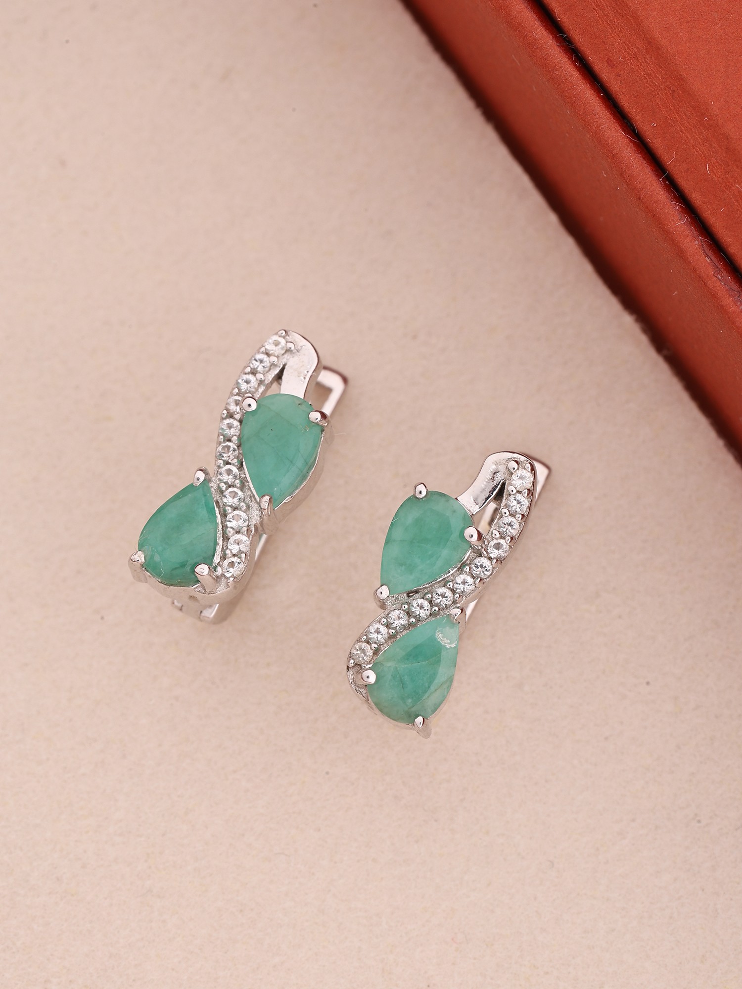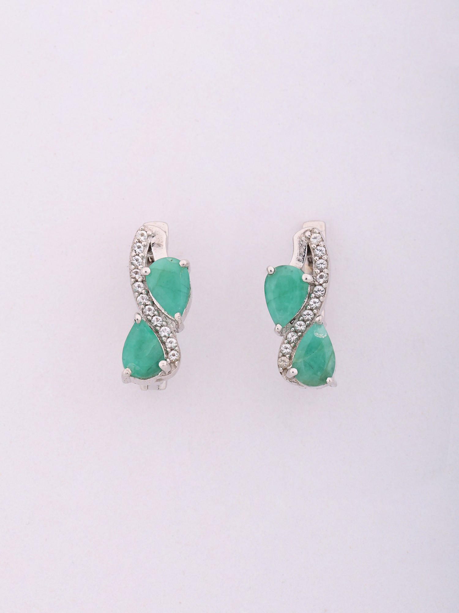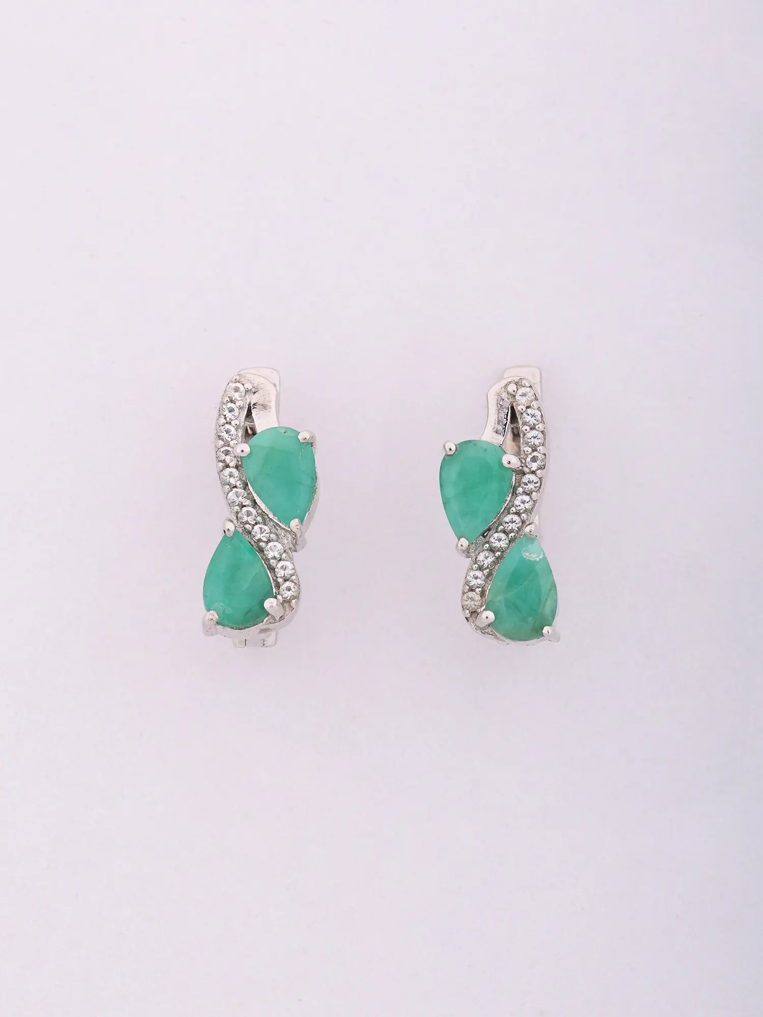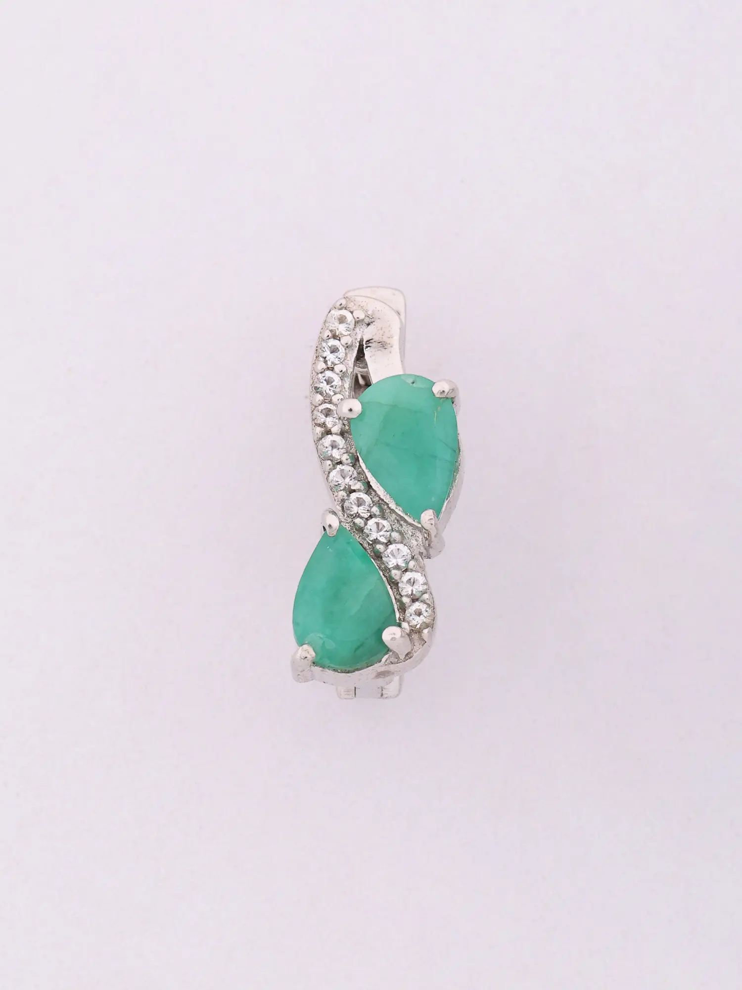 Adorn yourself with a striking visual narrative, where the graceful curves of sterling silver embrace two mesmerizing, pear-shaped emeralds. These verdant jewels are meticulously framed by a delicate tracery of pavé-set stones, adding a subtle sparkle that catches the eye. The overall design, measuring approximately 0.55 inches in height and 0.15 inches in width, offers a substantial yet elegantly proportioned presence.