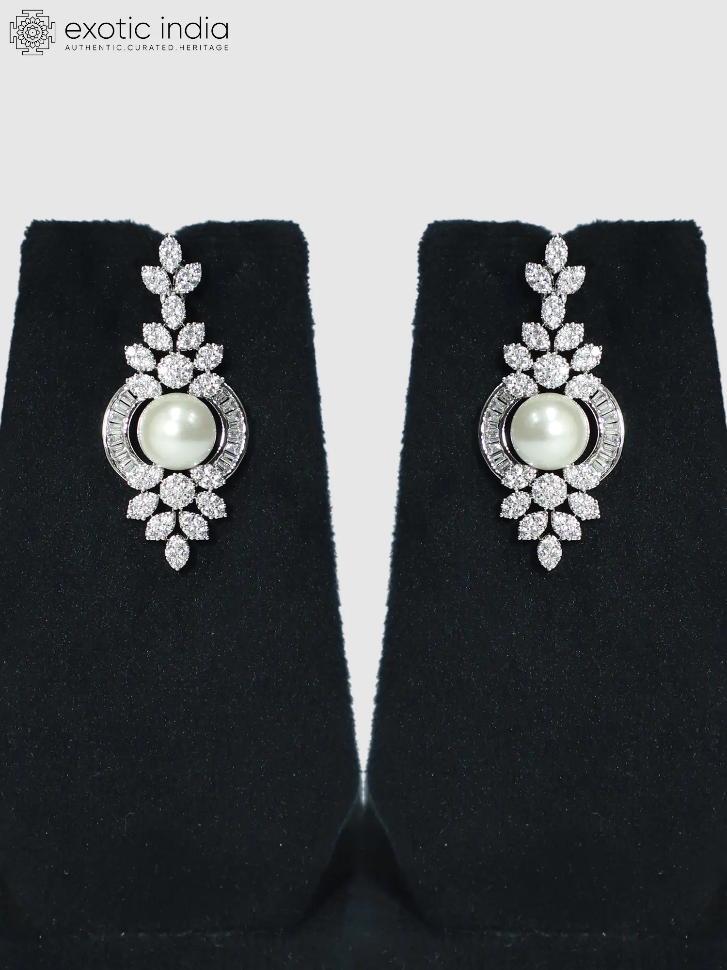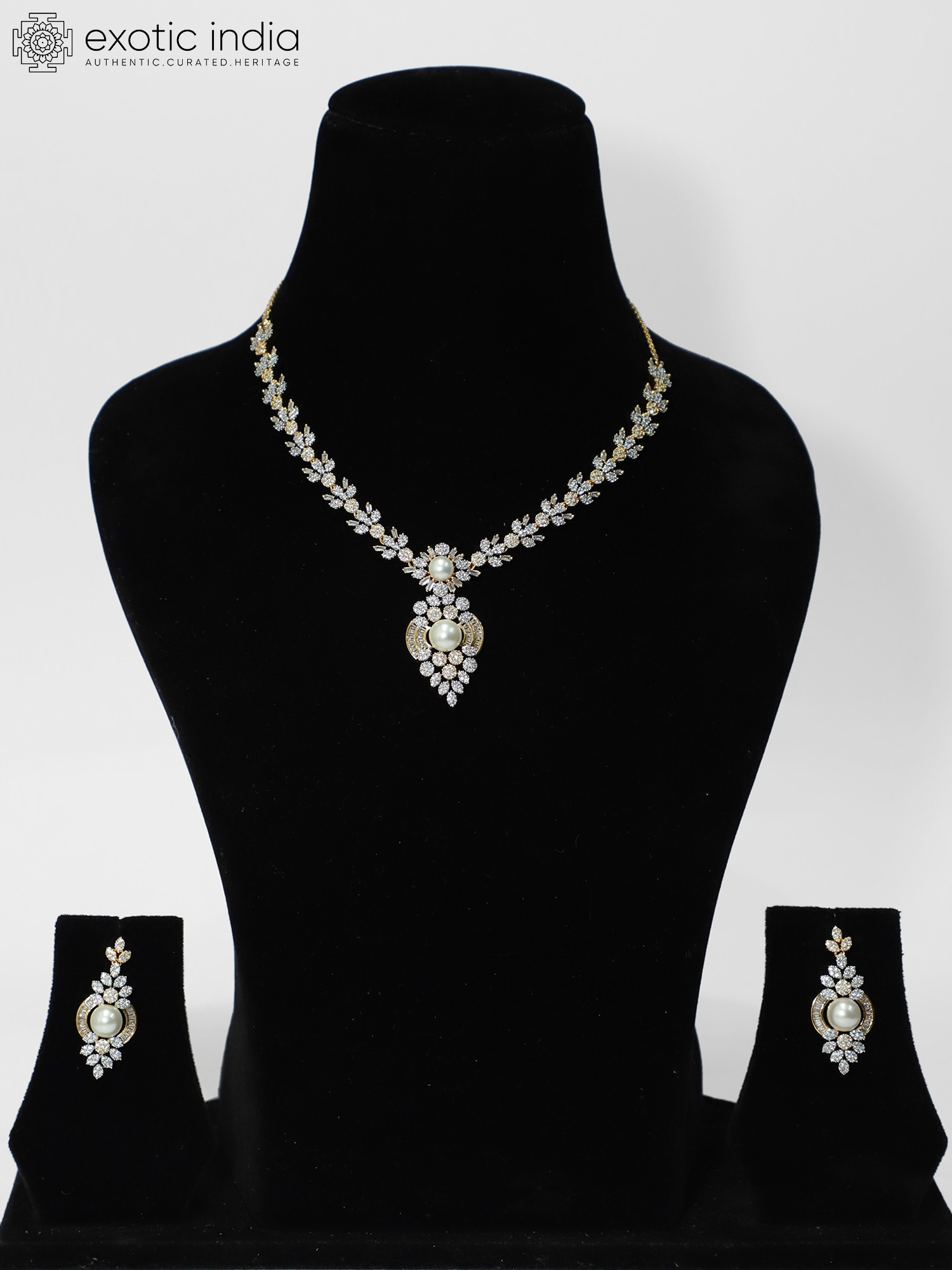 Pearl Embellished Stone Studded American Diamond Necklace Set With Earrings