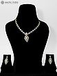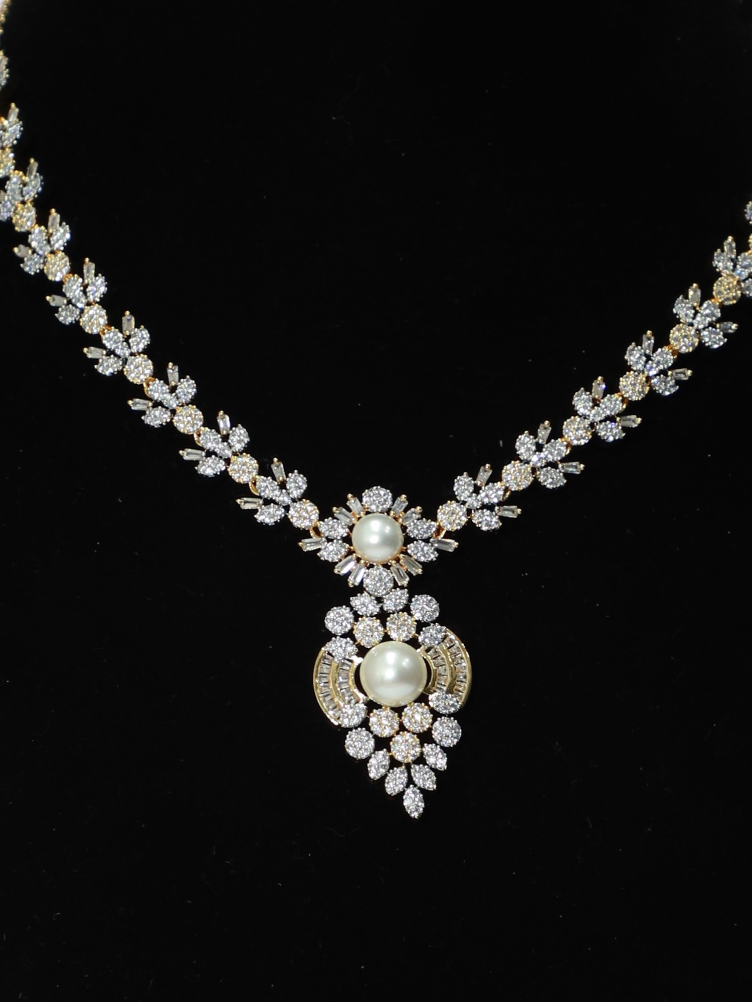Adorn yourself in timeless sophistication with this stunning necklace and earring set. A masterful blend of classic design and contemporary flair, this set is designed to elevate any ensemble, making it perfect for special occasions, formal events, or adding a touch of glamour to your everyday look. The intricate detailing and shimmering stones are sure to capture attention and leave a lasting impression. The necklace is carefully crafted to sit gracefully along the neckline, creating a focal point of undeniable beauty. The delicate chain is adorned with sparkling American Diamonds, meticulously set to catch the light and create a brilliant display. The central pendant features a captivating arrangement of stones, culminating in a lustrous pearl that exudes understated luxury. The pearl adds a touch of classic charm while keeping it suitable for any occasion.
