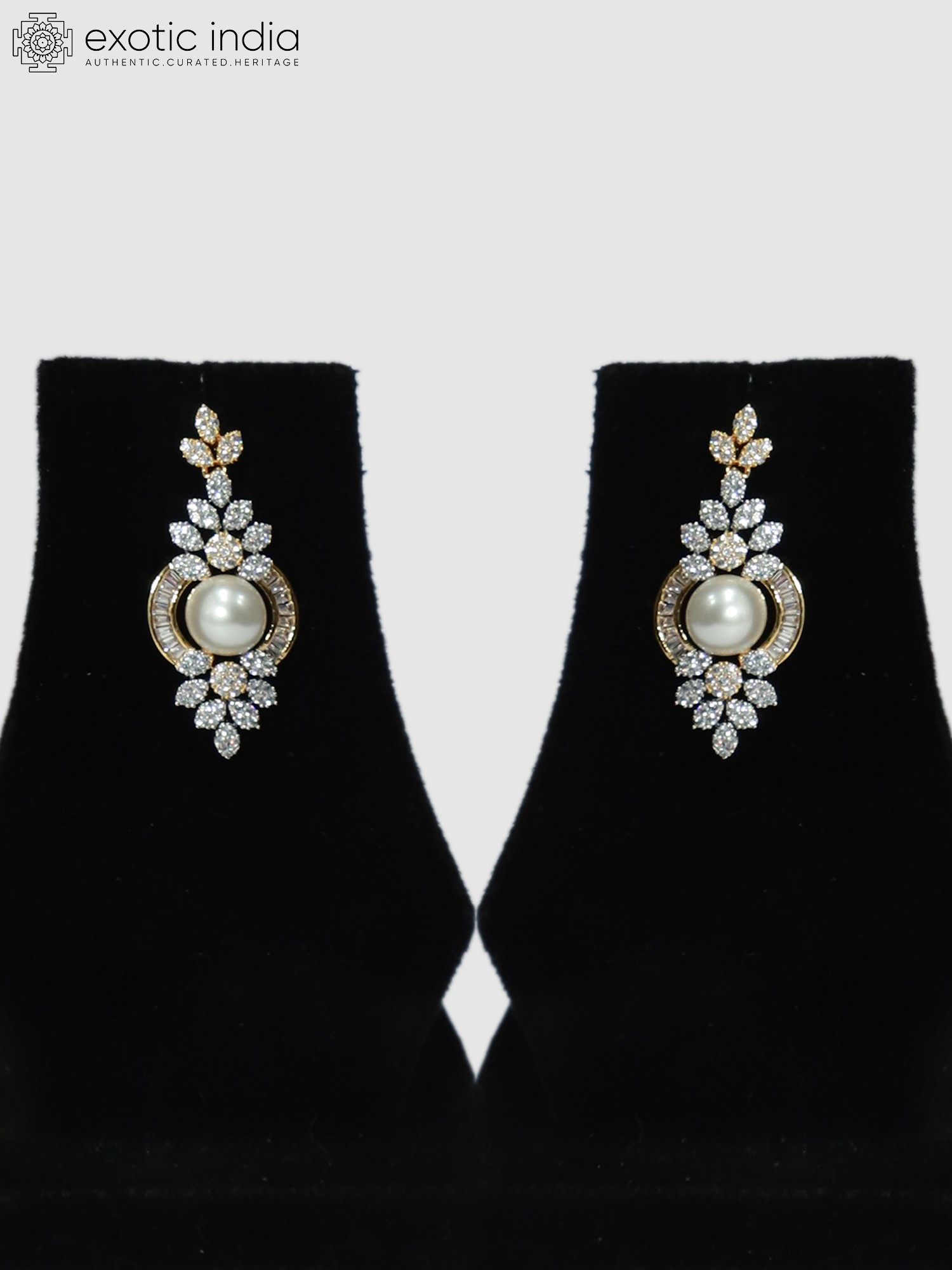 Complementing the necklace are the matching earrings, designed to mirror the elegance and sophistication of the pendant. These earrings dangle delicately, catching the light with every movement. The exquisite arrangement of American Diamonds and the central pearl creates a harmonious balance, enhancing the overall appeal of the set. Each element is thoughtfully designed to ensure maximum brilliance and visual impact. At 1.5 inches in height and 0.6 inches in width, the earrings offer enough length to catch everyone's eye.