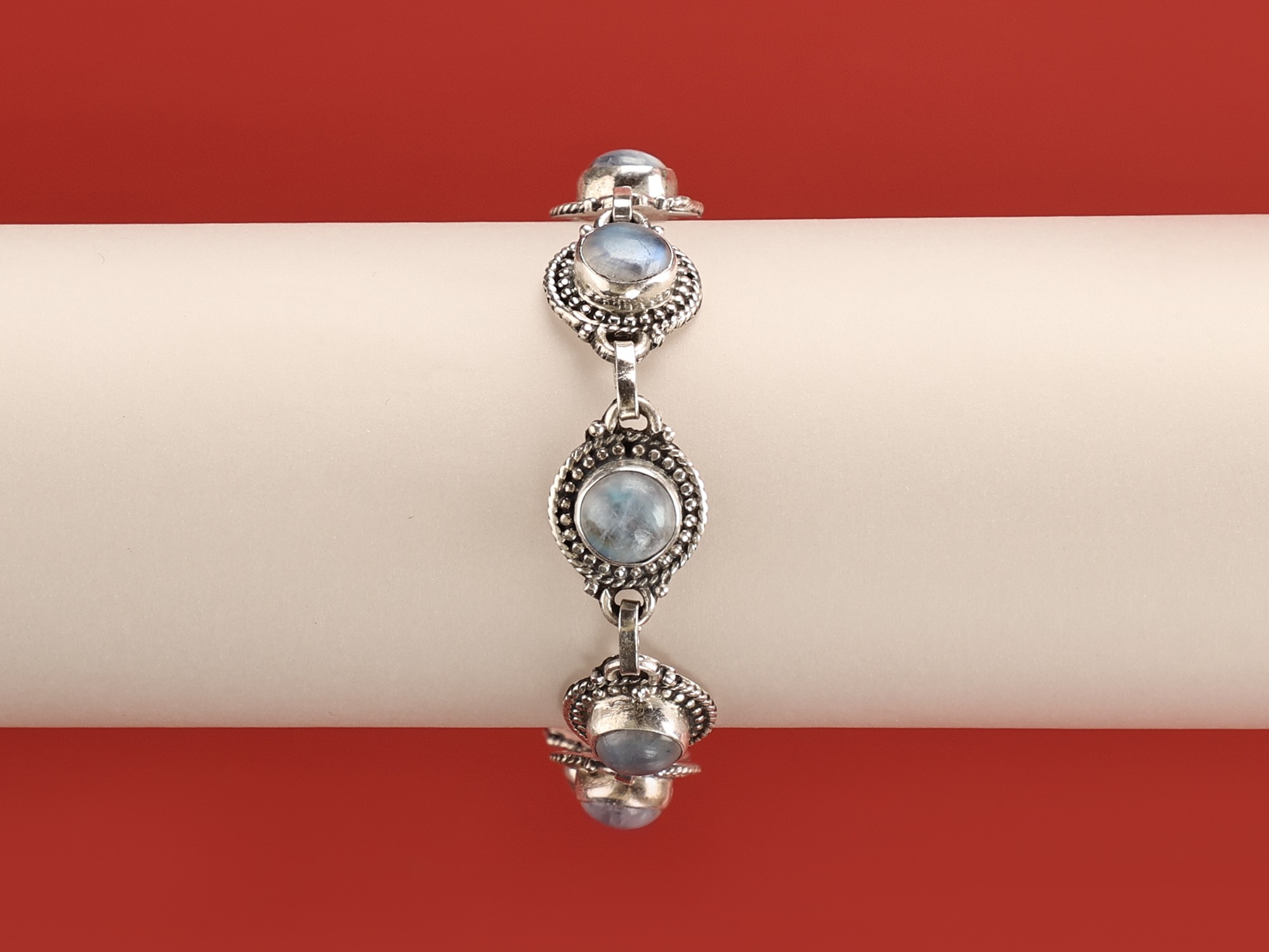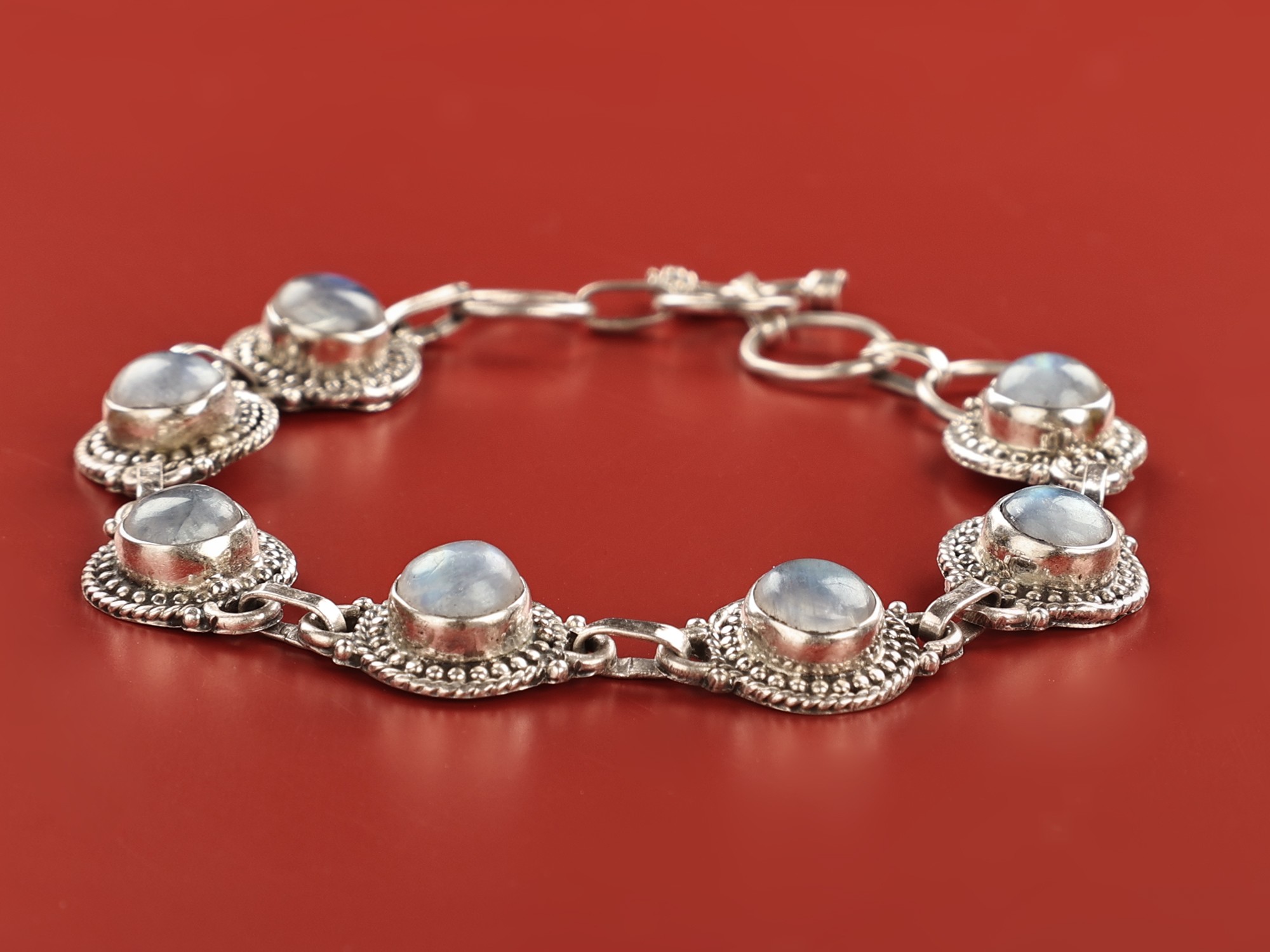 Crafted from high-quality sterling silver, this bracelet boasts exceptional durability and shine. The sterling silver is carefully polished to achieve a brilliant luster that enhances the beauty of the Rainbow Moonstones. The intricate detailing of the bezels and chain links showcases the exceptional skill and artistry involved in its creation. This attention to detail guarantees a bracelet that is not only visually stunning but also built to last, becoming a cherished piece of jewelry you can enjoy for years to come. The polished silver complements the moonstones' soft luminosity, creating a balanced and harmonious visual effect.