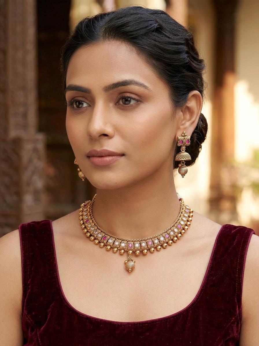 This exquisite necklace and earrings set offers a perfect blend of classic charm and contemporary style. Crafted with meticulous attention to detail, the design features alternating pink and white stones, adding a touch of delicate color to the intricate gold-tone brasswork. The overall effect is both sophisticated and eye-catching, making it an ideal accessory for special occasions or to elevate everyday looks. The necklace showcases a graceful curve, designed to sit comfortably and elegantly around the neckline. Small gold-tone beads create a beautiful textured border, enhancing the visual appeal and adding to its refined aesthetic. A solitary, drop-like pendant completes the necklace, adding a subtle focal point.