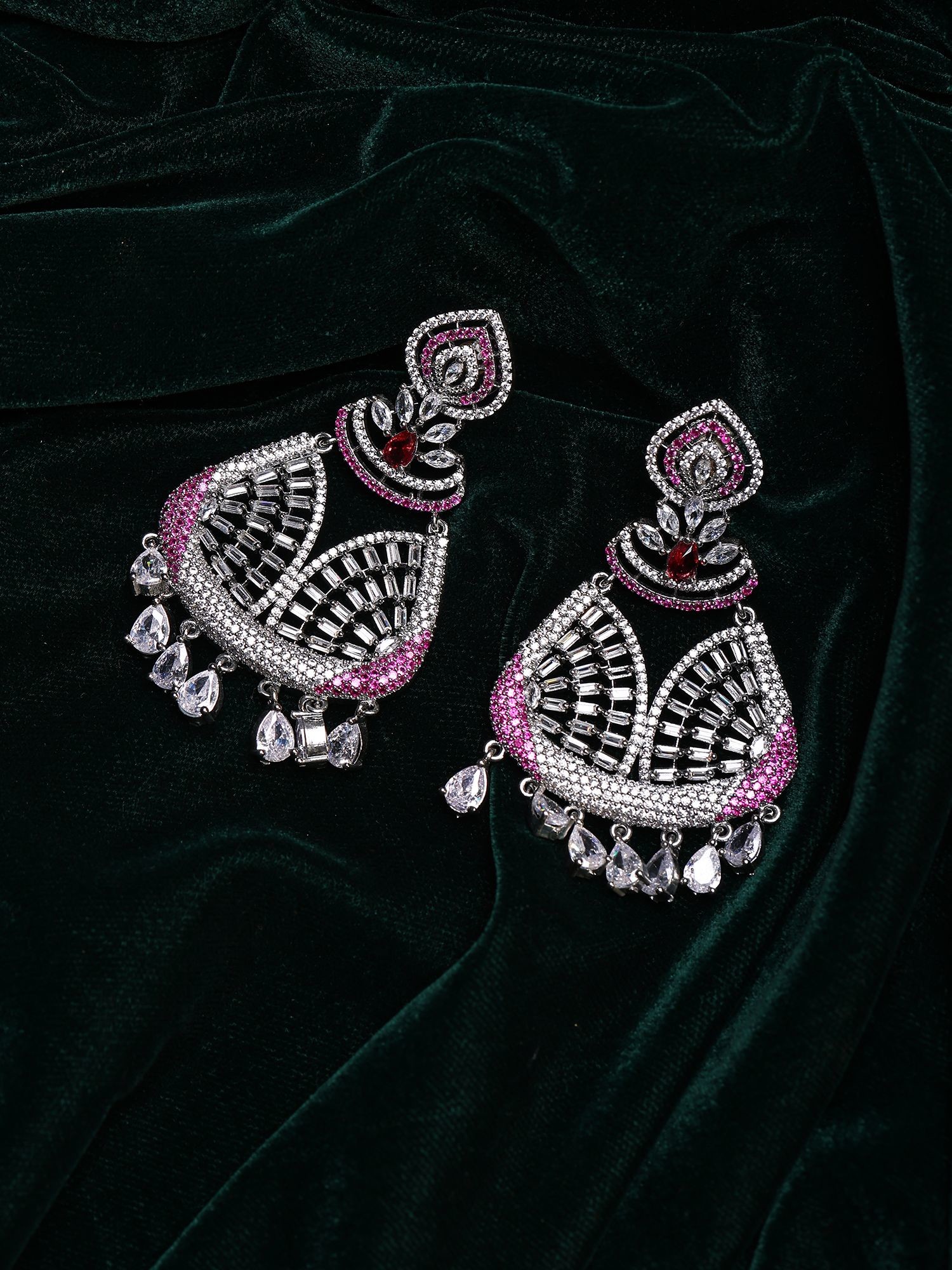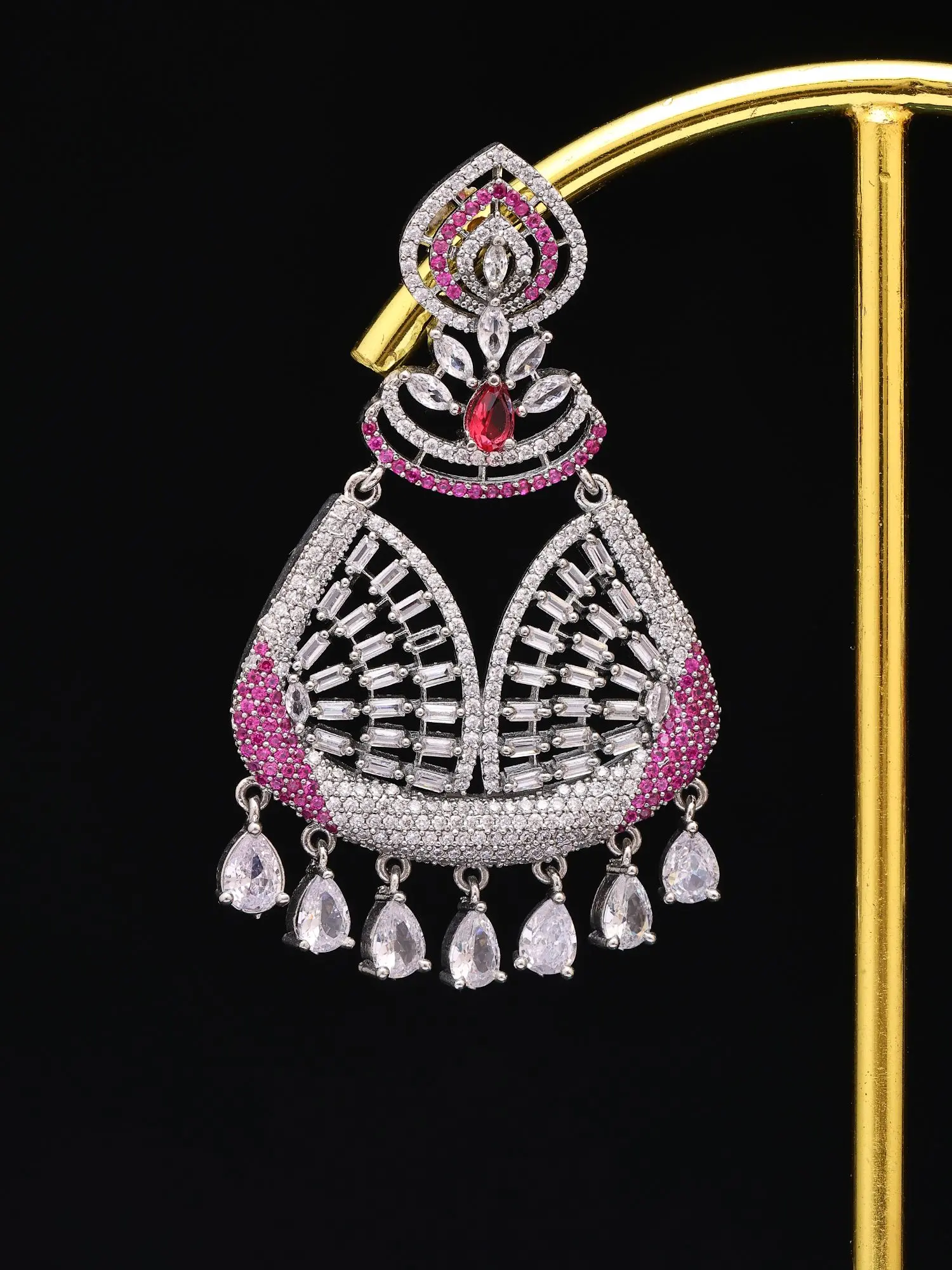 Intricate detailing with pear-shaped and baguette-cut stones, complemented by a ruby-red accent.