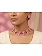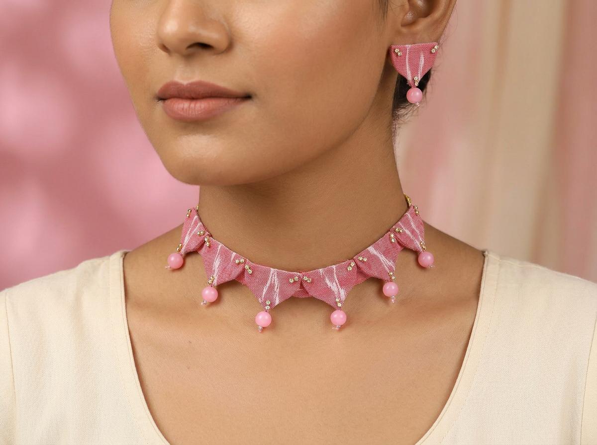 The choker necklace measures 1.25 inches in height, providing a comfortable and flattering fit. The earrings match the necklace's exquisite design, with dimensions of 1.25 inches in height and 1 inch in width. This balanced design ensures that the jewelry set is both eye-catching and proportionate, creating a harmonious overall look. The subtle interplay of the pink Sambalpuri fabric, delicate beads, and sparkling stones creates a sense of refined elegance, perfectly suited for the modern woman who appreciates both tradition and contemporary style. This set is an ideal gift for yourself or a loved one seeking unique and high-quality handcrafted jewelry.