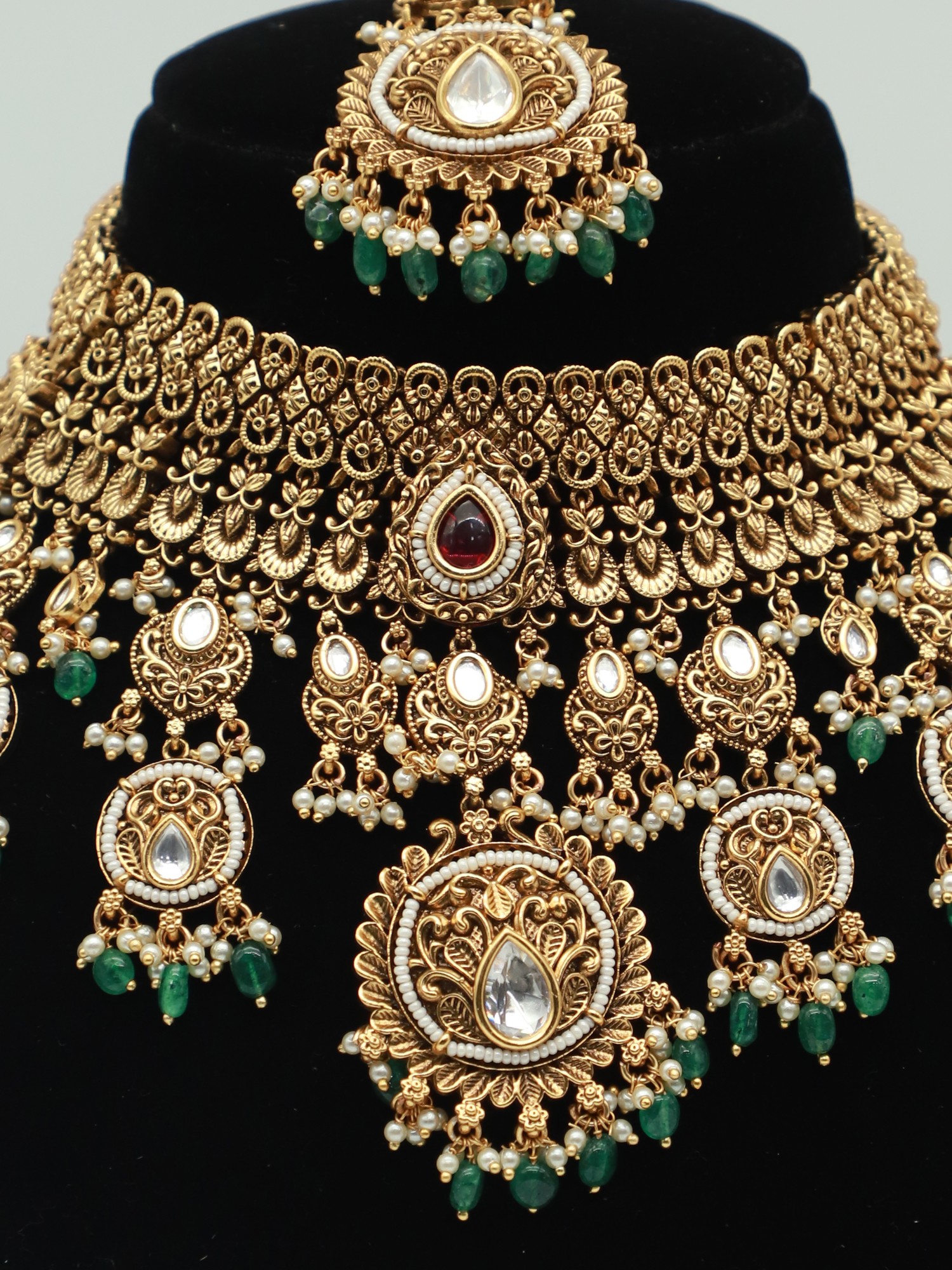 The necklace features an elaborate carving pattern that exudes timeless charm. Intricate detailing adorns every surface, creating a captivating visual texture. The cascading design adds movement and depth, drawing the eye to the stunning arrangement of decorative elements. Subtle accents, such as the delicately placed beads, enhance the overall sophistication. The accompanying earrings echo the necklace's intricate carving and complement its design beautifully. They are perfectly balanced in size and weight, ensuring comfortable wear throughout the day or evening. The graceful silhouette adds a touch of refinement to any ensemble. Completing the set is the Mangtika, a traditional forehead ornament that adds a regal touch. Its design mirrors the necklace and earrings, creating a harmonious and complete look. It sits gracefully on the forehead, accentuating the wearer's features.