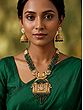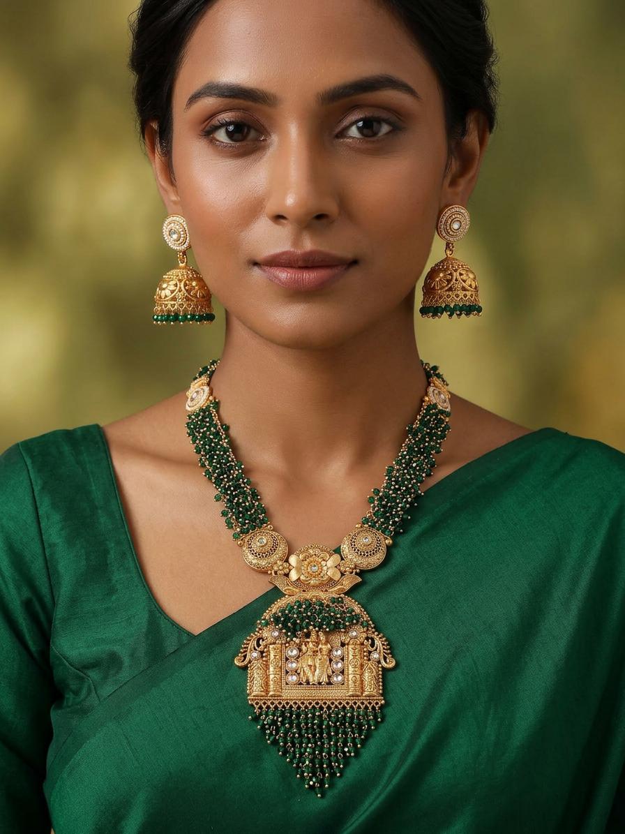 Every detail of this necklace and earring set has been meticulously crafted to ensure superior quality. The high-quality brass construction promises durability and a long-lasting shine. The vibrant green beads are carefully strung, adding depth and texture to the design. The intricate detailing on the temple-style pendant and jhumka earrings is a testament to the artisan's skill and dedication, creating a piece that's as visually stunning as it is durable. The polished gold finish enhances the overall look, ensuring it remains the focal point of your style. The attention to detail in every element makes this a truly exceptional piece of jewelry.