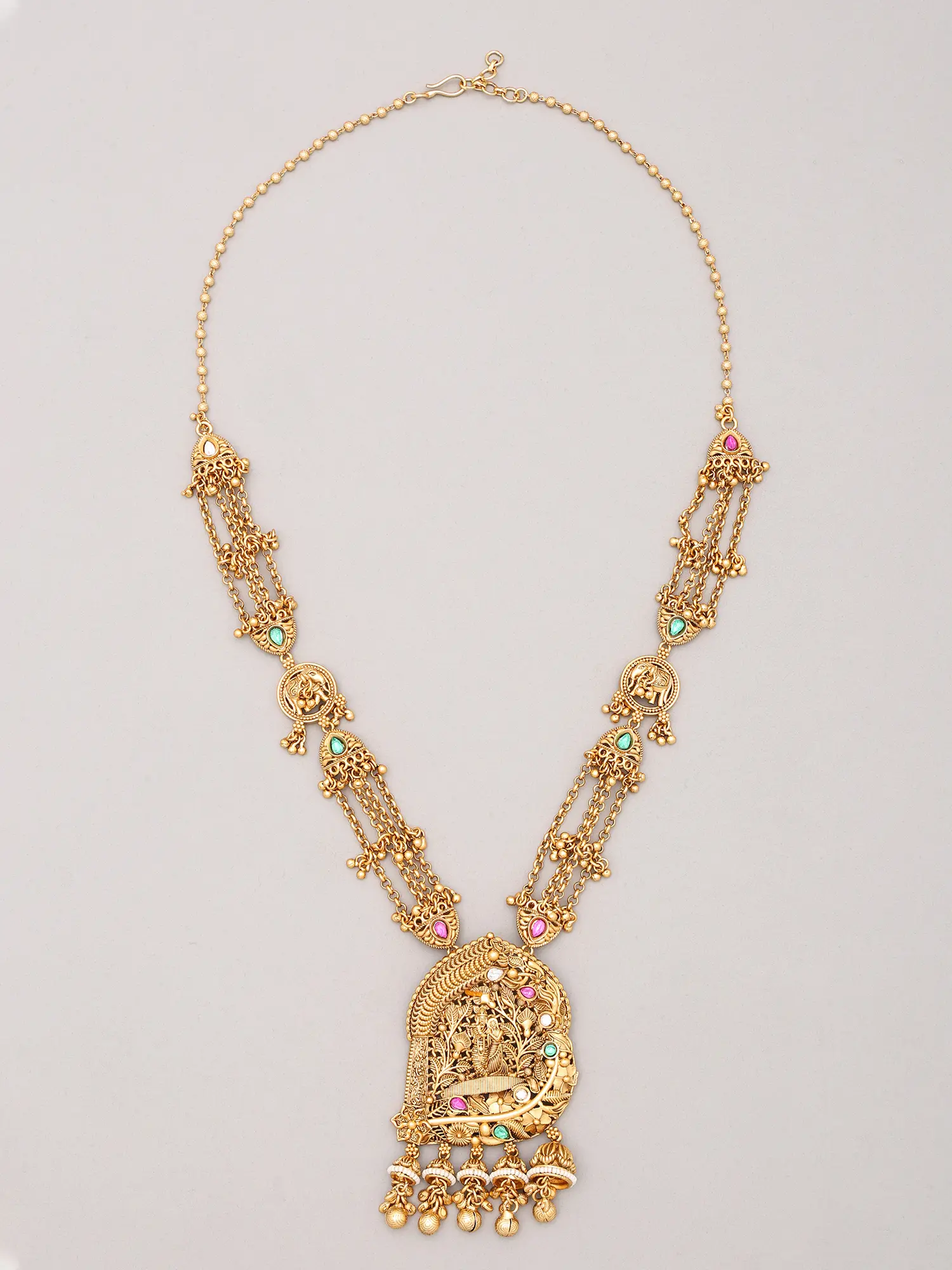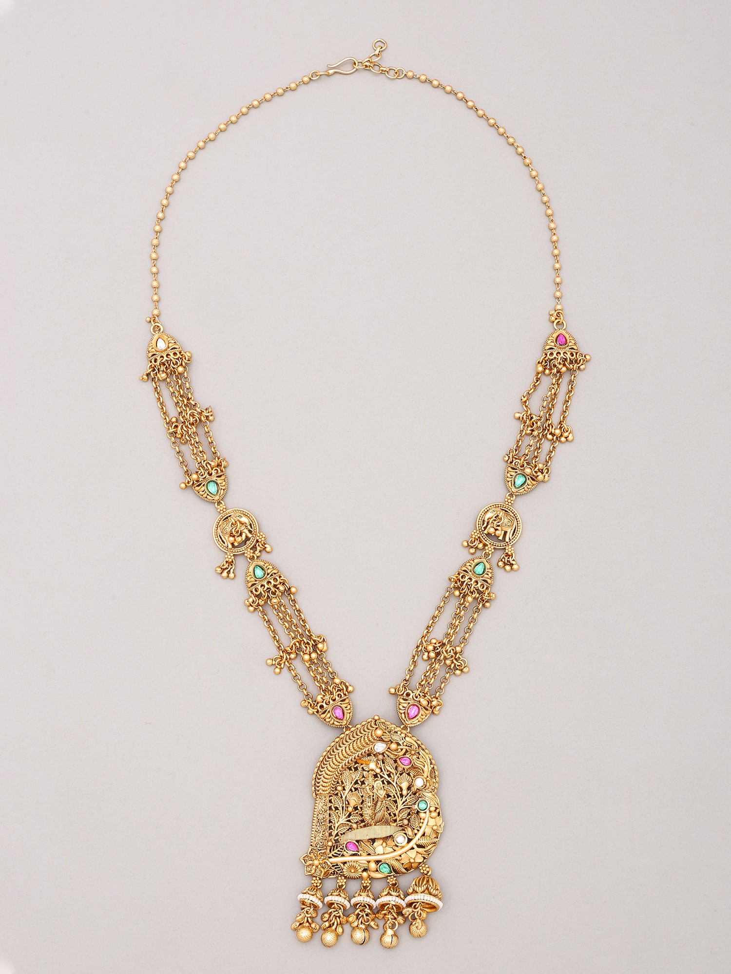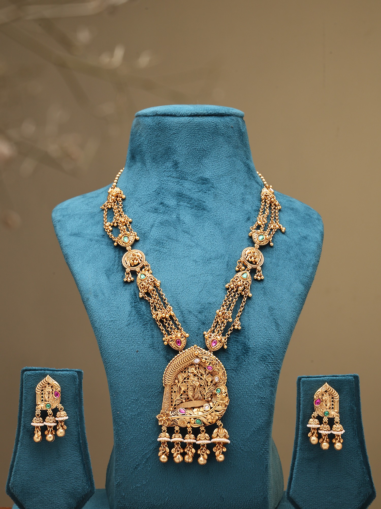 Adorn yourself with a testament to divine artistry, a piece that whispers tales of devotion and eternal love. This magnificent ensemble, featuring a temple-inspired Haram necklace and meticulously crafted earrings, is designed to capture the essence of sacred narratives, making you the radiant center of any occasion. It is more than mere adornment; it is an heirloom that connects you to centuries of spiritual heritage.