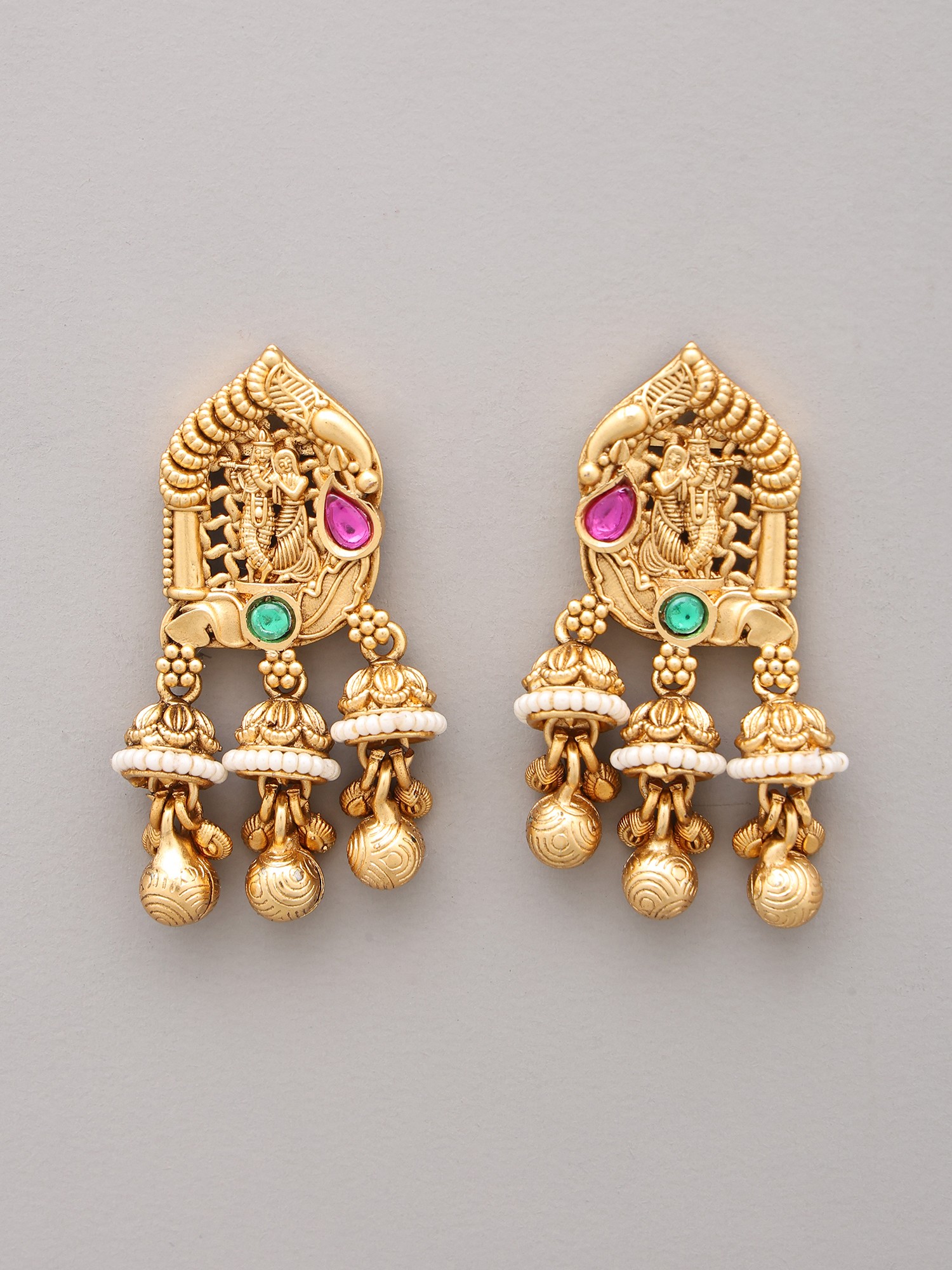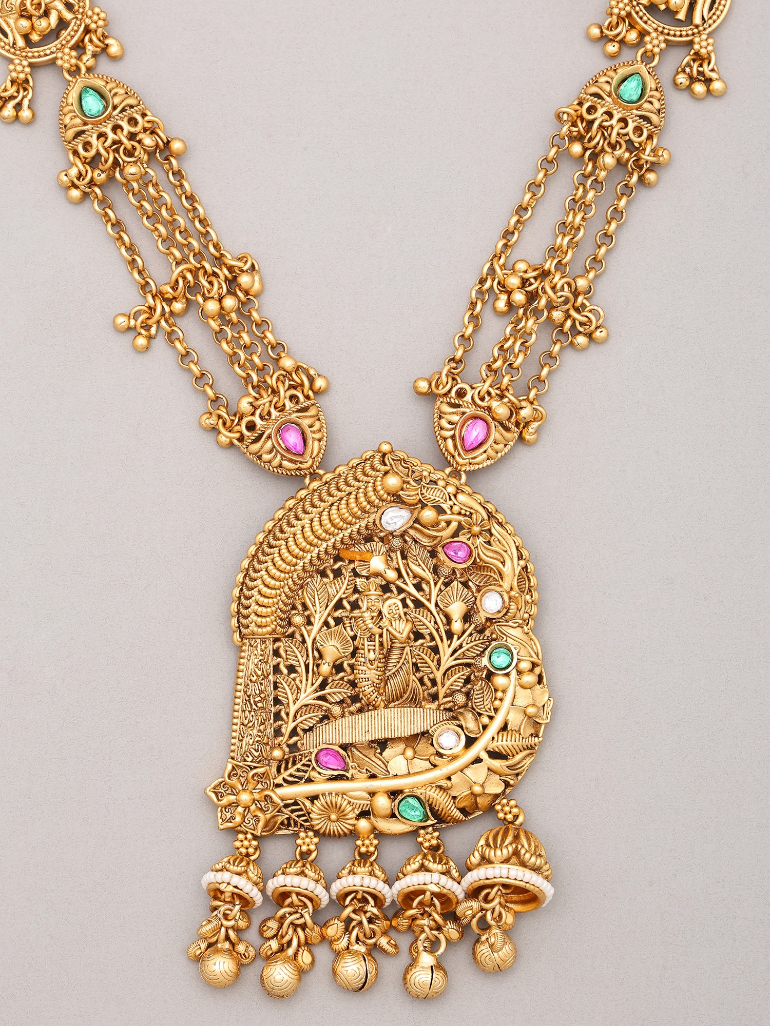 This design draws inspiration from the iconic temple art of South India, often depicting deities in moments of divine grace. The central panel, a miniature tableau, evokes the timeless love story of Radha and Krishna, a profound symbol of devotion and spiritual union. Wearing this set allows you to carry a piece of this rich cultural and religious tapestry, connecting you to a legacy of artistic expression and spiritual significance.