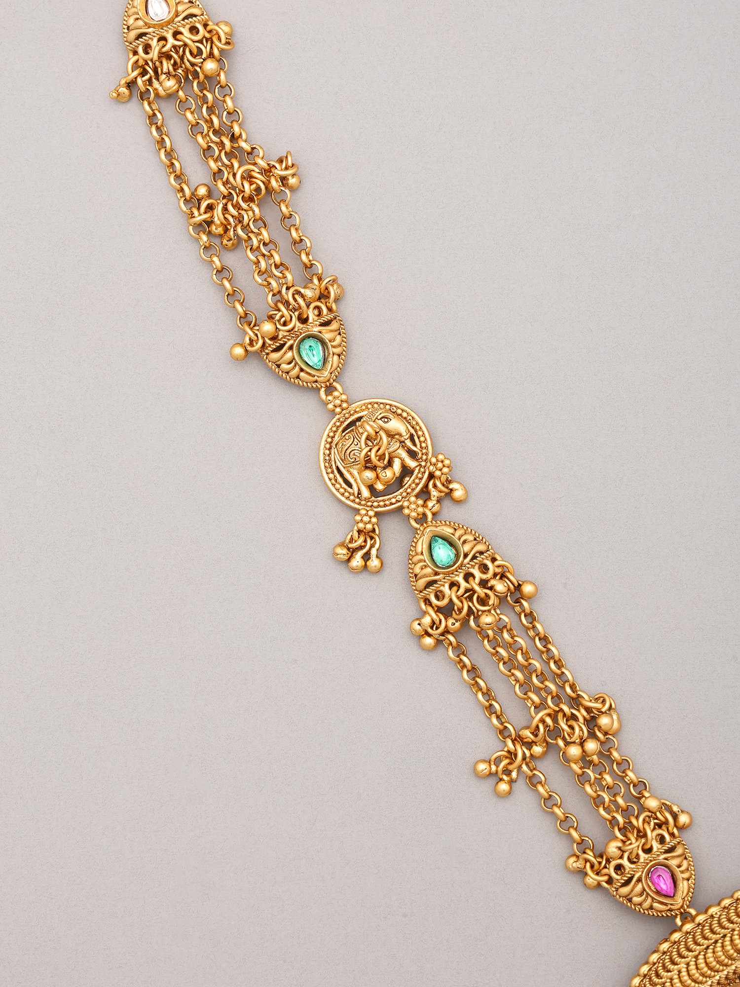 The Haram necklace, with its commanding 14.75-inch height, drapes elegantly, drawing the eye to its central motif. Delicately suspended Ghungroo charms adorn the chain, offering a subtle, melodious whisper with every movement. The accompanying earrings, each a graceful 1.75 inches in height and 0.60 inches wide, mirror the necklace's exquisite craftsmanship. Vibrant, precisely set gemstones add a touch of color and brilliance, harmonizing perfectly with the warm gleam of the brass.