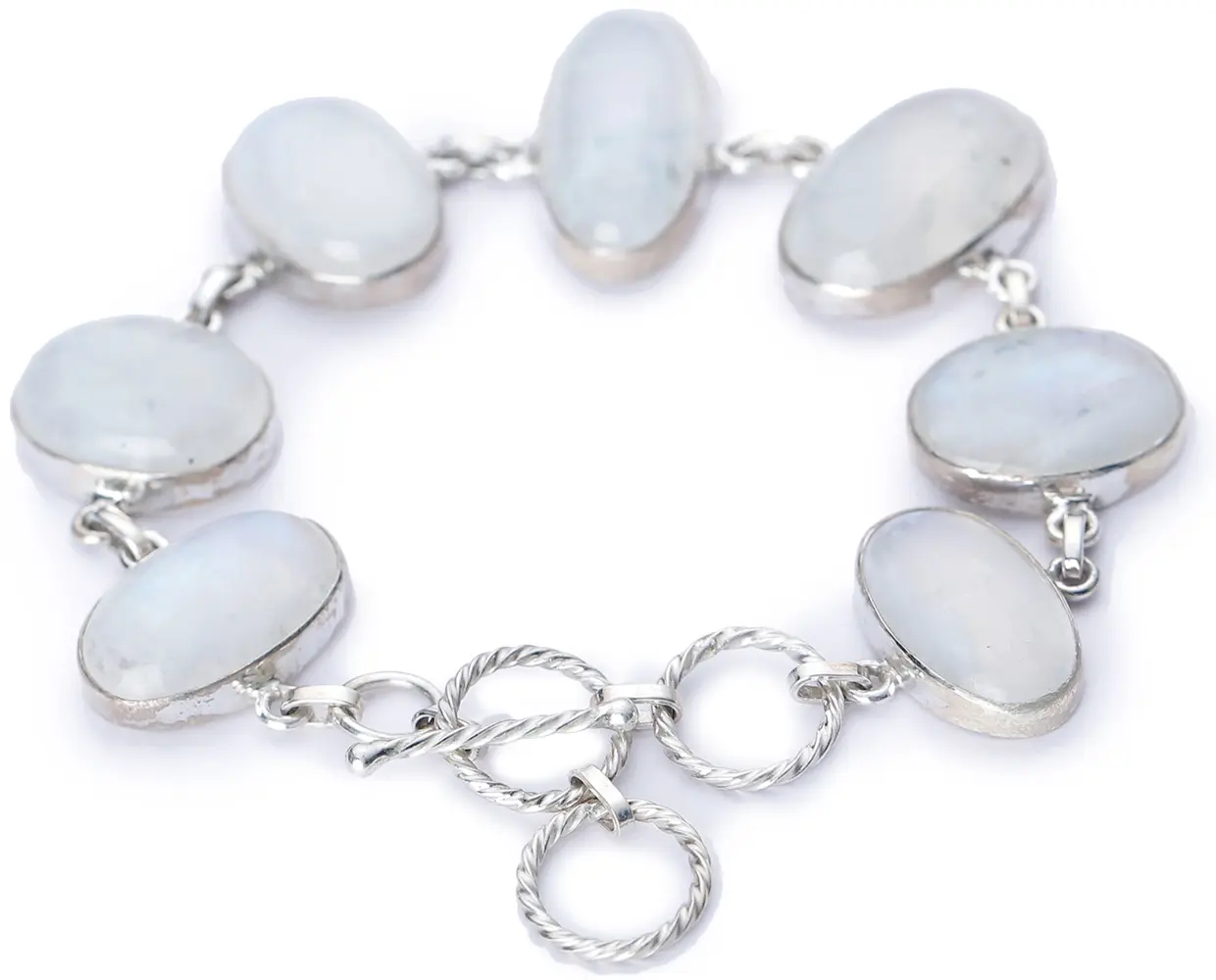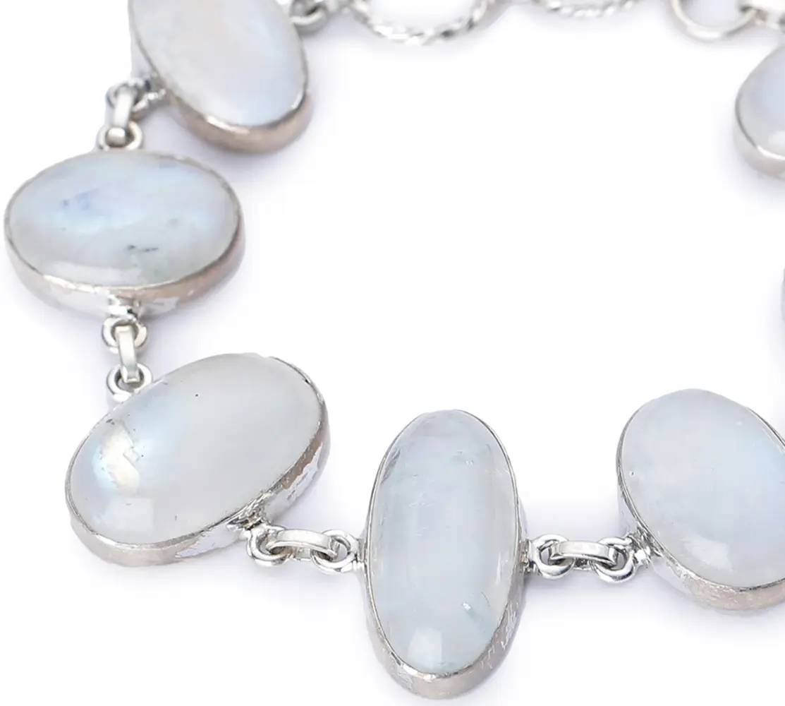 Adorn your wrist with the ethereal beauty of this exquisite sterling silver bracelet, showcasing the captivating allure of rainbow moonstone. Each oval-cut cabochon gemstone is meticulously set, allowing its natural luminescence and subtle play of color to shine through. The milky translucence of the moonstones, often graced with a captivating blue or white adularescence, evokes the enchanting glow of moonlight, making this bracelet a truly mesmerizing piece.