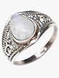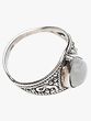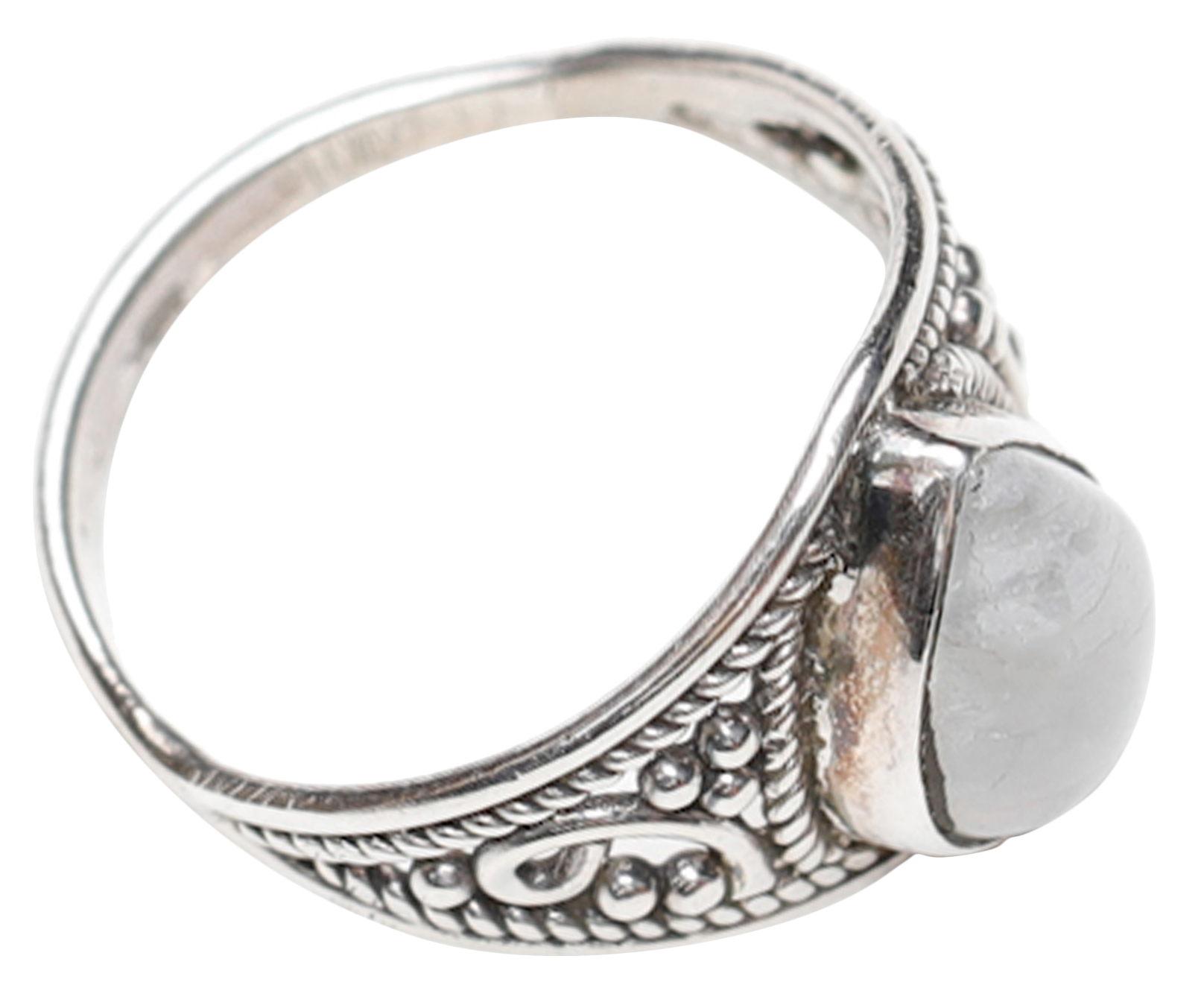The beauty of the rainbow moonstone is expertly cradled within a band of lustrous sterling silver. This precious metal not only offers a timeless and sophisticated appeal but also provides a durable and hypoallergenic foundation for the gemstone. The sterling silver band is intricately detailed with a vintage-inspired design, featuring a delicate rope-like texture along the edges and subtle, swirling filigree patterns that add depth and character. This meticulous detailing showcases exceptional artisan craftsmanship, transforming a simple ring into a wearable work of art. The silver is polished to a high shine, enhancing the luminosity of the moonstone and creating a striking contrast. –––––––––––––––––––