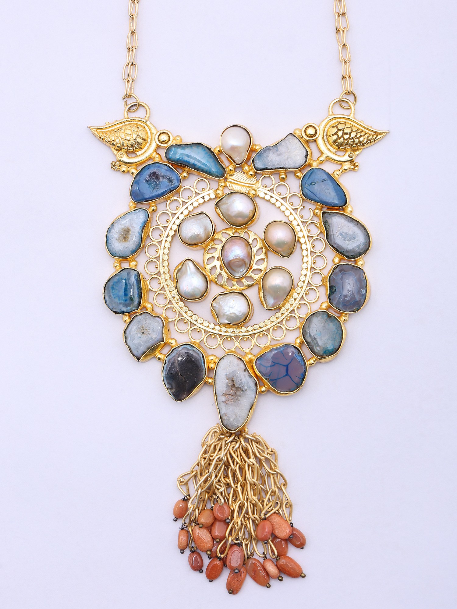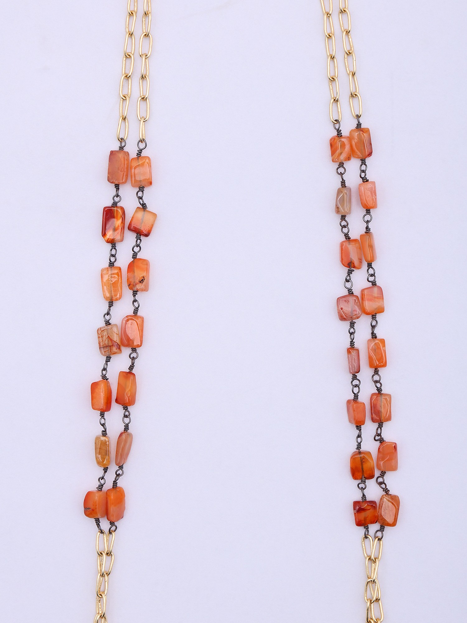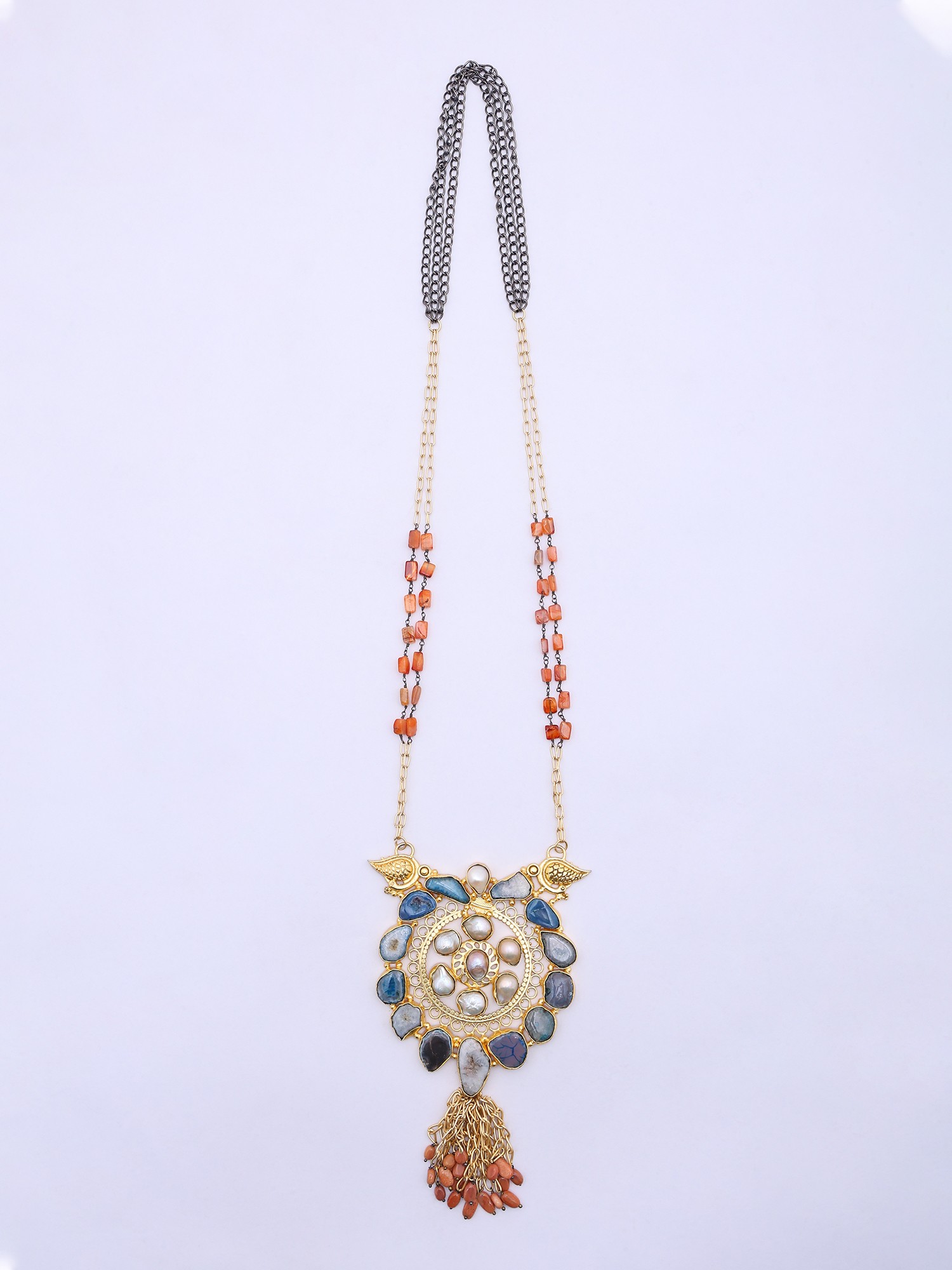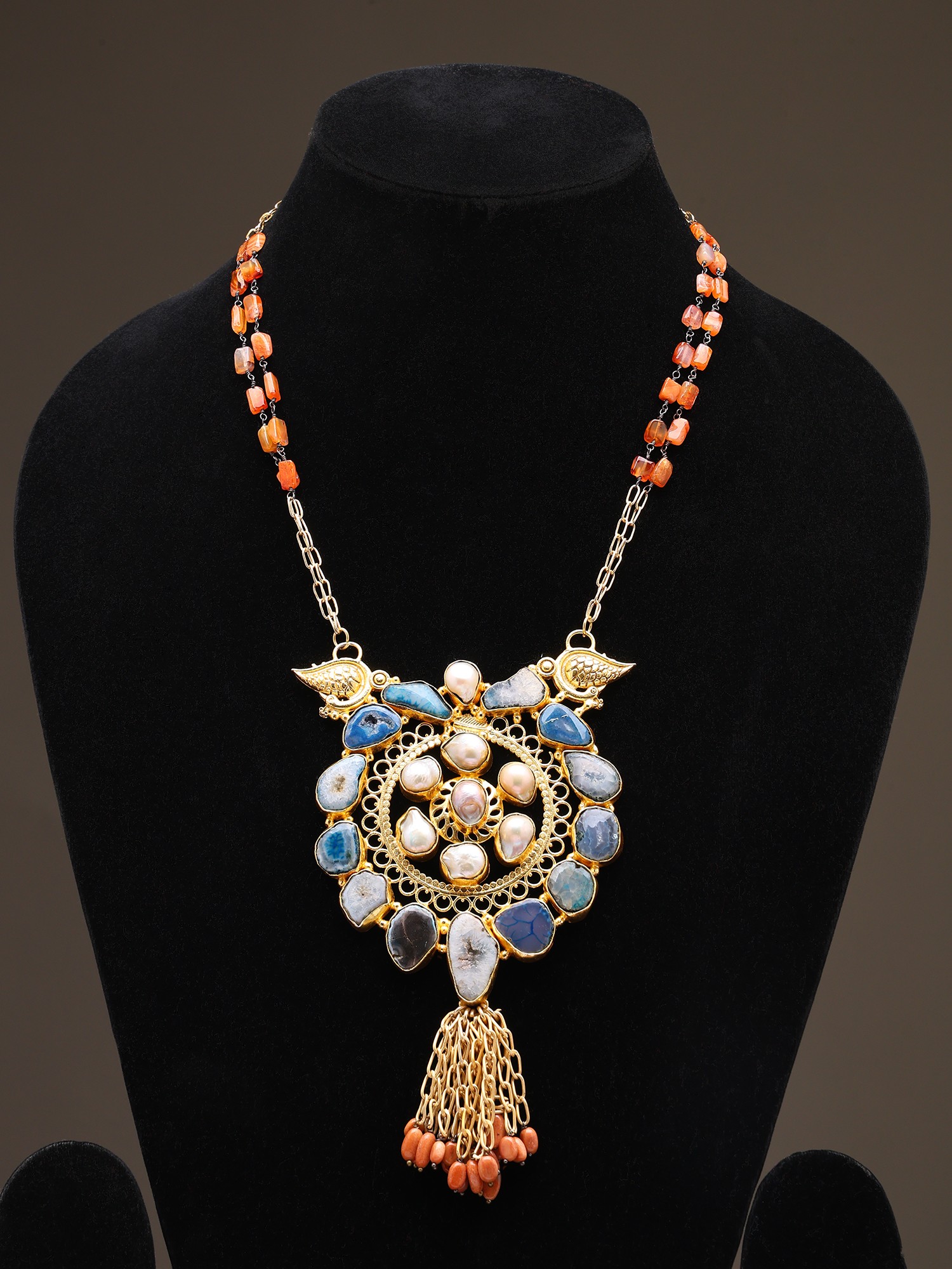 Raw-Cut Style Cabochon Stone-Studded Long Pendant Necklace