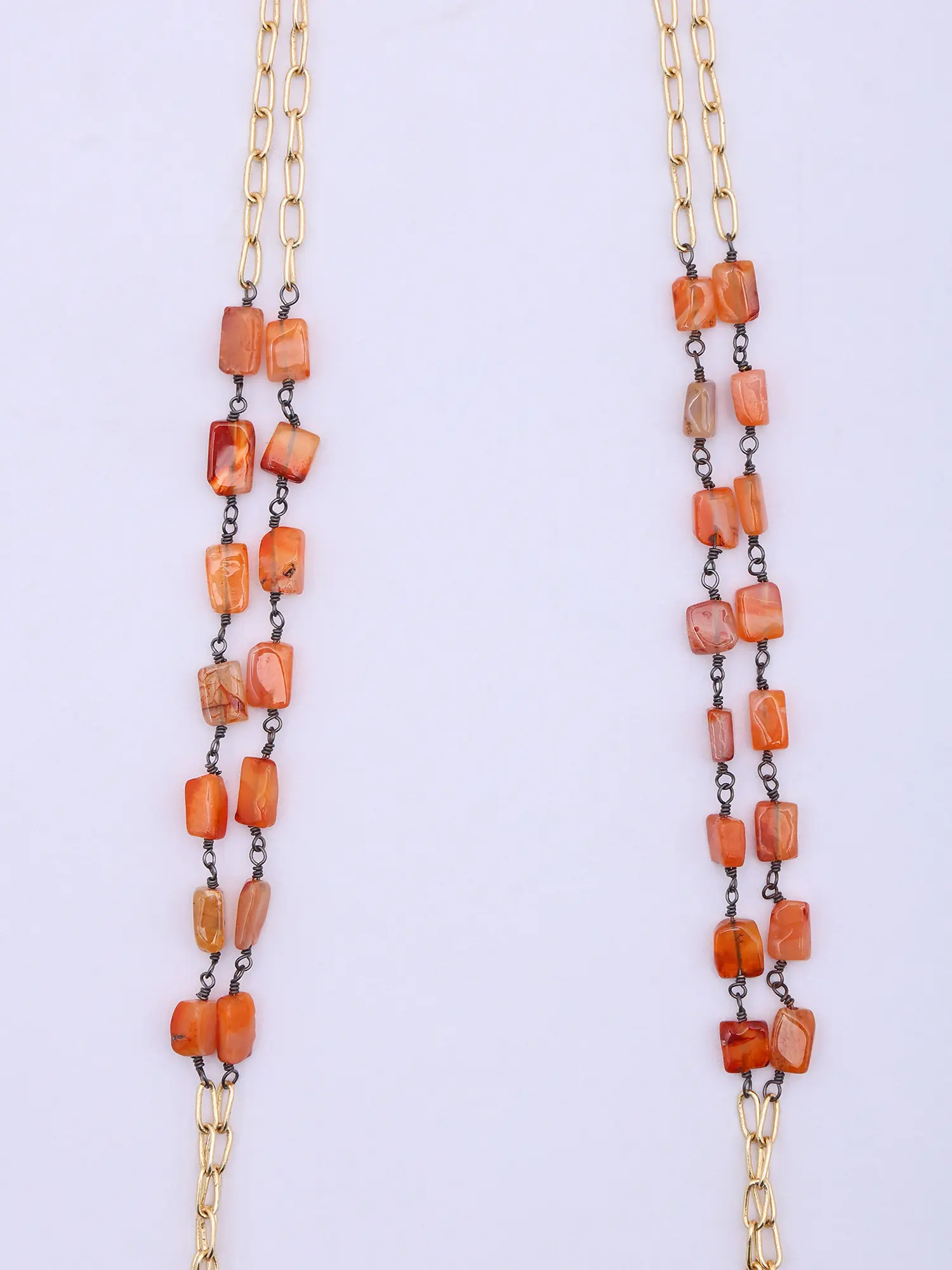 The necklace chain is crafted with alternating orange carnelian-like stones and black beads.