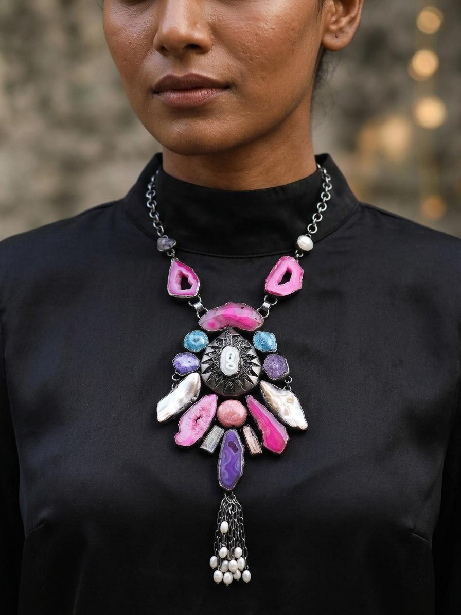 Adorn yourself with an extraordinary piece that captures the essence of raw, natural artistry. This captivating creation is designed to be the focal point of any ensemble, instantly elevating your presence with its unique design and vibrant gemstone medley. It promises to be a conversation starter, a testament to your discerning taste for the exceptional.