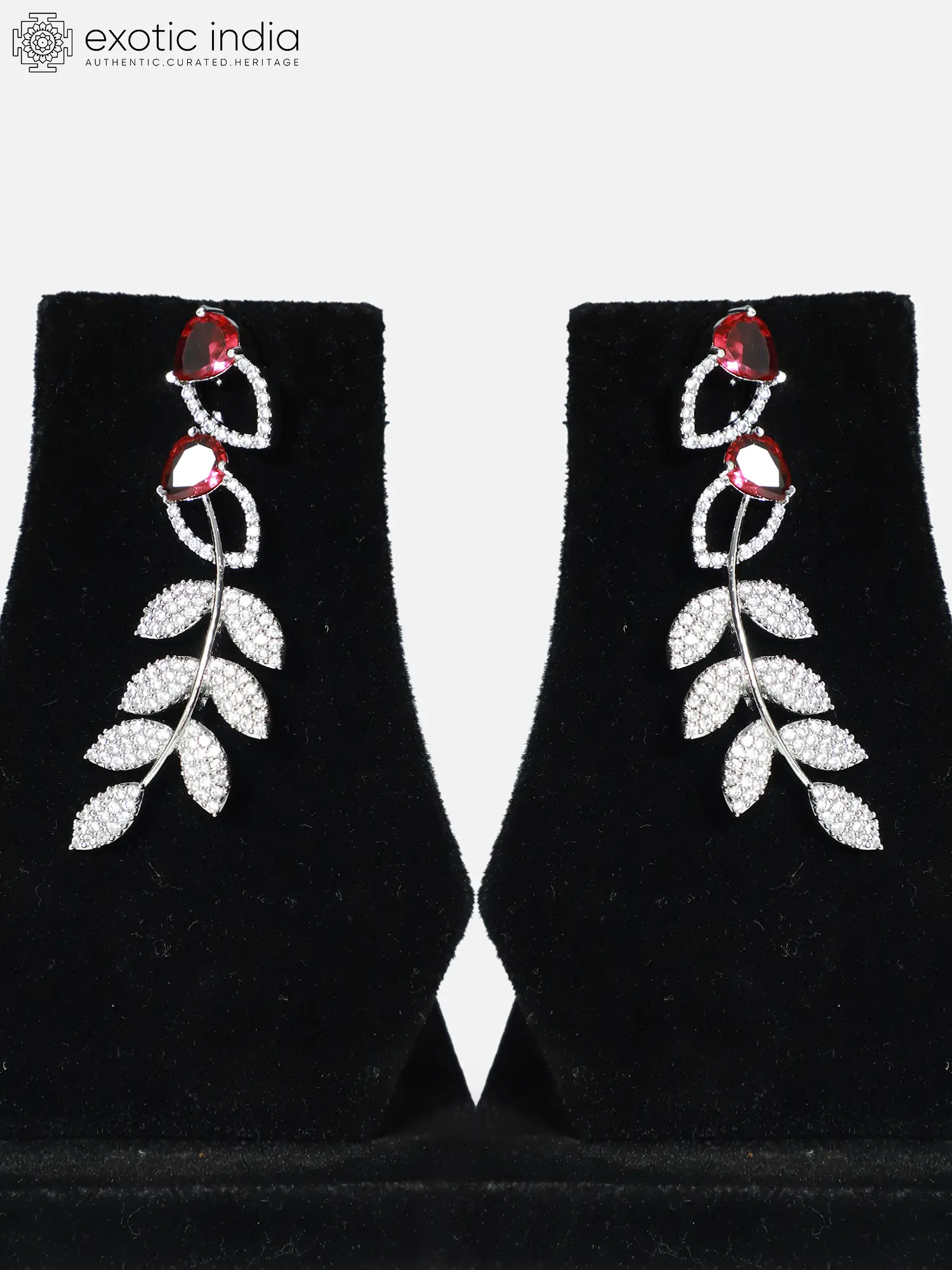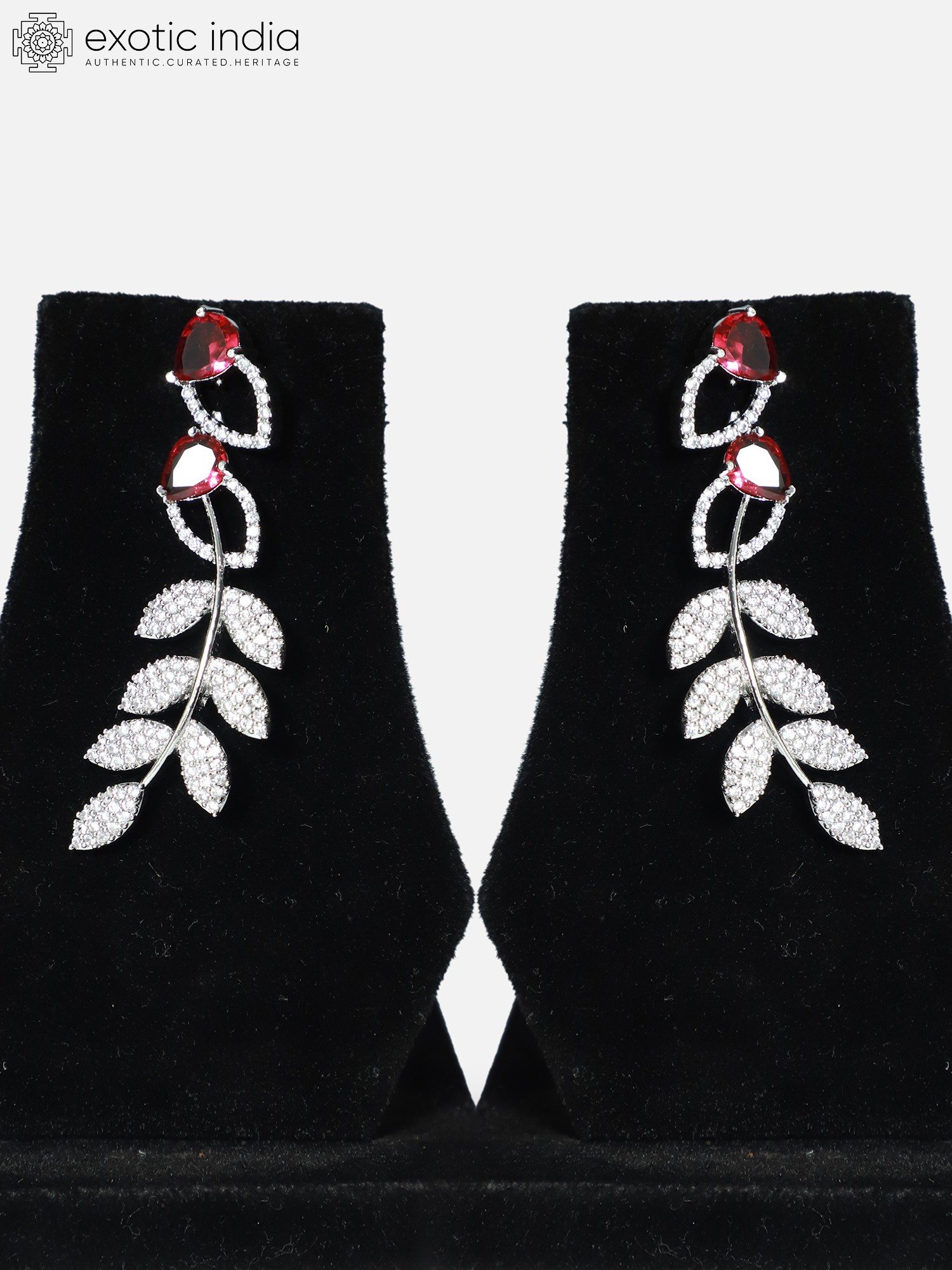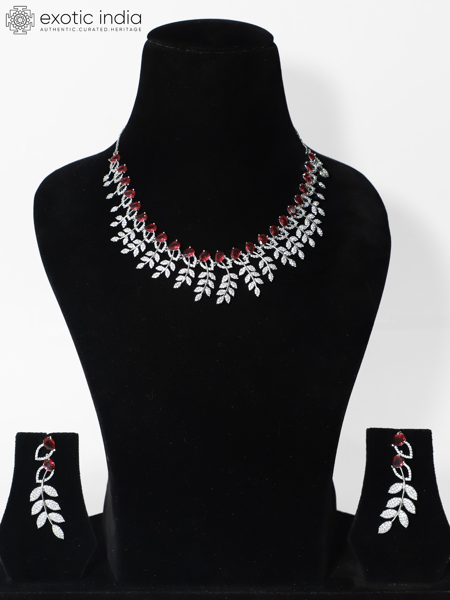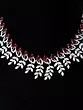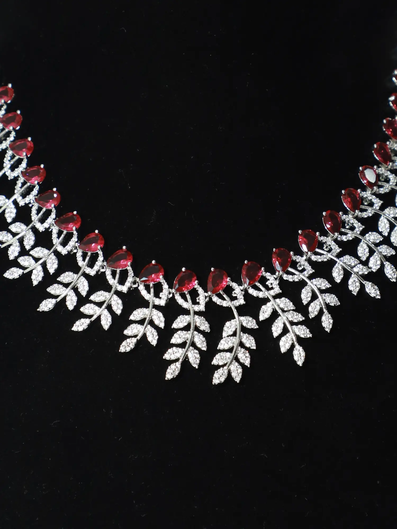 The necklace features a carefully curated arrangement of leaf motifs, each meticulously studded with sparkling American Diamonds. The vibrant red stones provide a striking contrast, catching the light and adding a pop of color. The arrangement of leaf motifs creates a visually pleasing design, evoking nature's beauty in a refined manner.