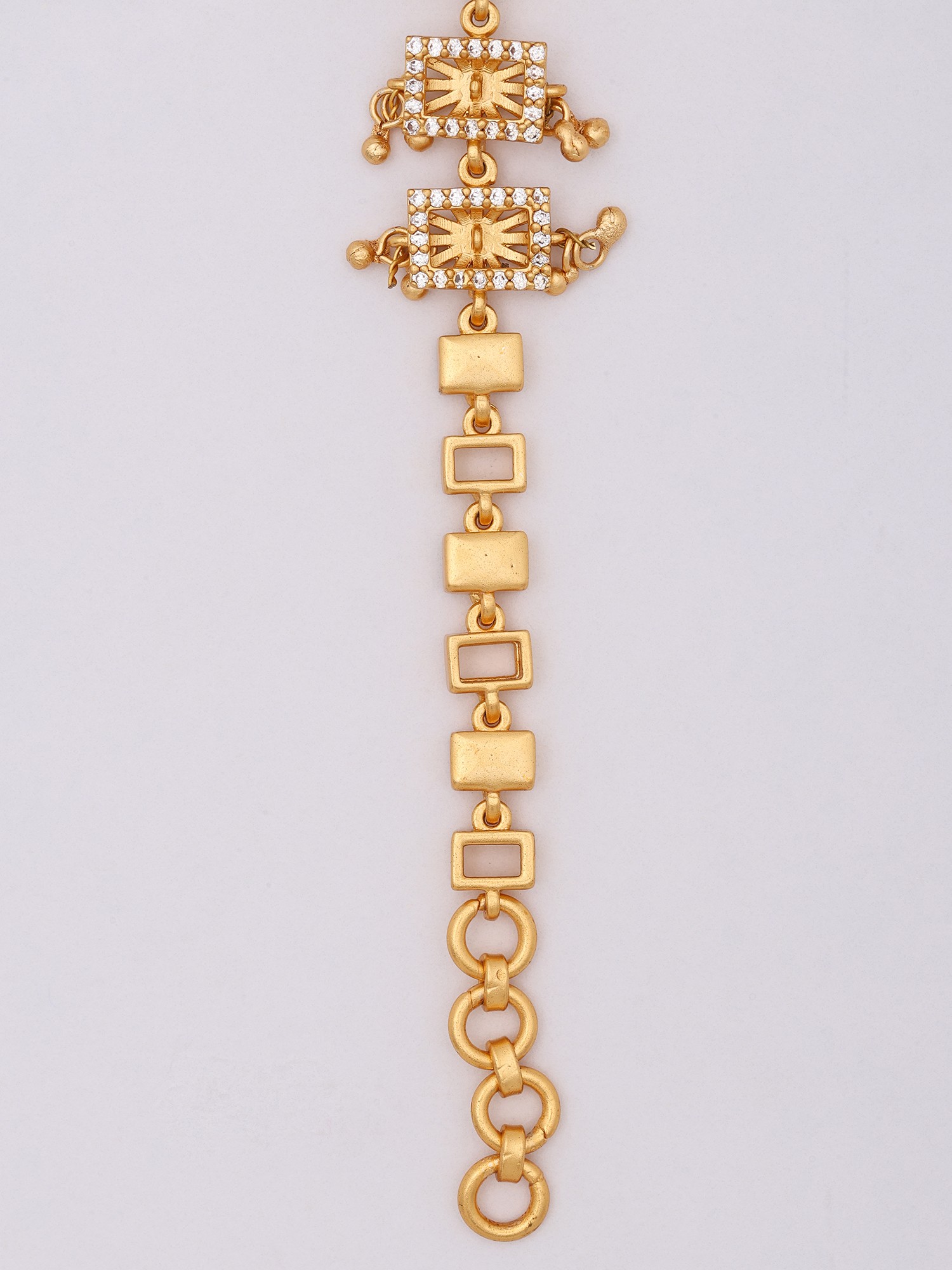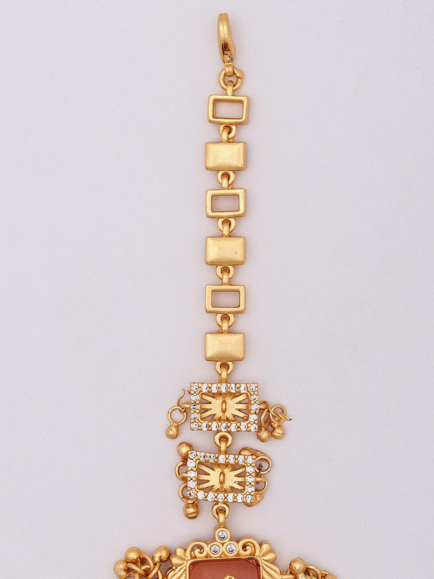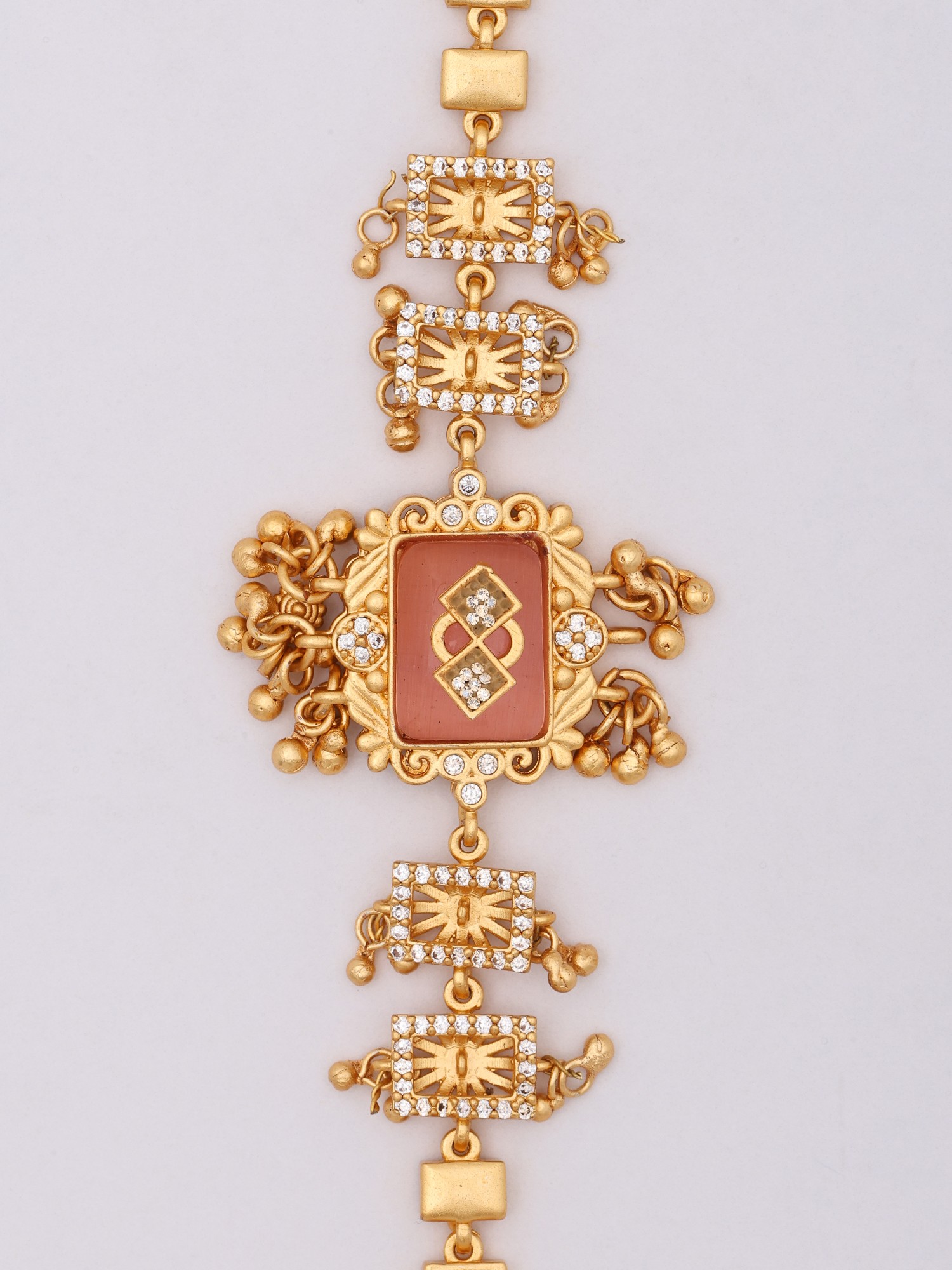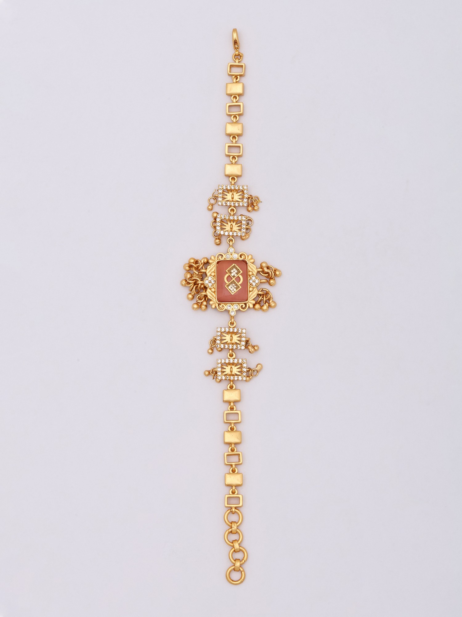 The central motif features a rich, warm-toned stone framed by delicate, hand-set crystalline accents. These sparkling stones are thoughtfully arranged within geometric borders, creating a captivating interplay of light and shadow. The adjustable chain, formed from elegantly interlocking links, offers a comfortable and secure fit, allowing this statement piece to grace wrists of various sizes with a width of 6.05 inches and a height of 1.20 inches at its widest point.
