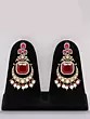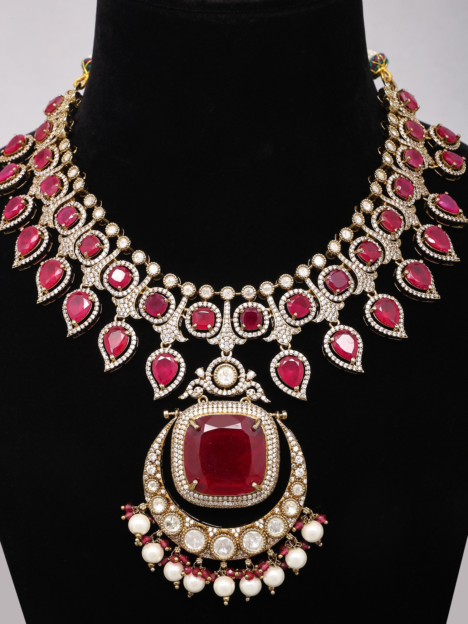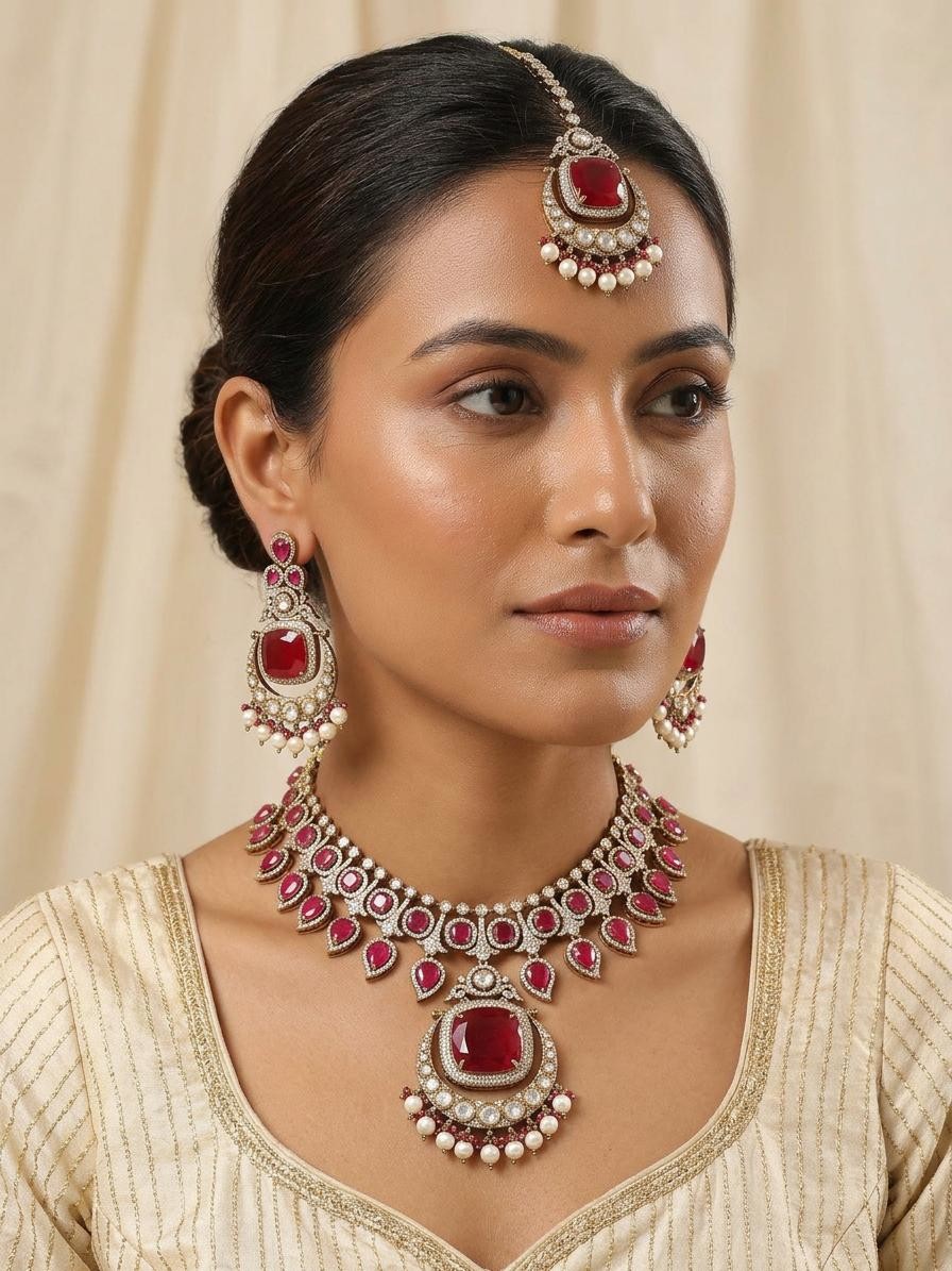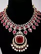 Features a striking necklace adorned with vibrant red Kundan stones.