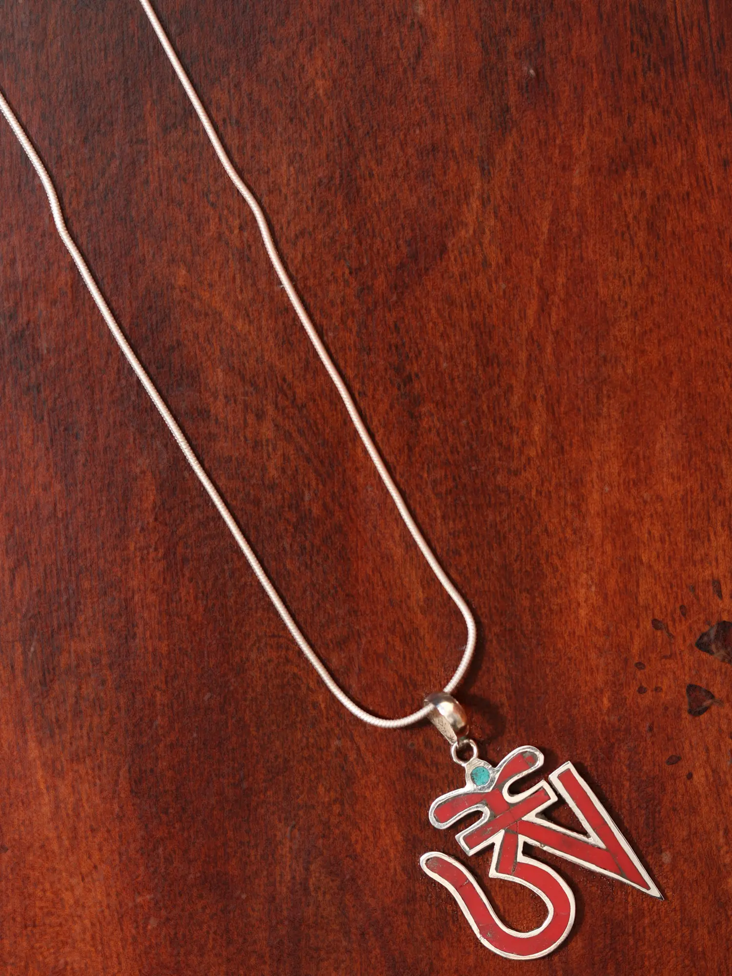 The Tibetan Om Pendant is believed to allow us to connect with our spiritual energy. Nowadays, many people wear the Om sign as jewelry to bring optimism into their lives. This Red Tibetan Om (Aum) Inlay Pendant from Nepal is a stunning fusion of spirituality and craftsmanship. The frame for the inlay work is made of silver and further beautified with red inlay work. The sterling silver setting enhances the pendant's durability and luster, while the meticulous inlay technique adds a touch of cultural richness.