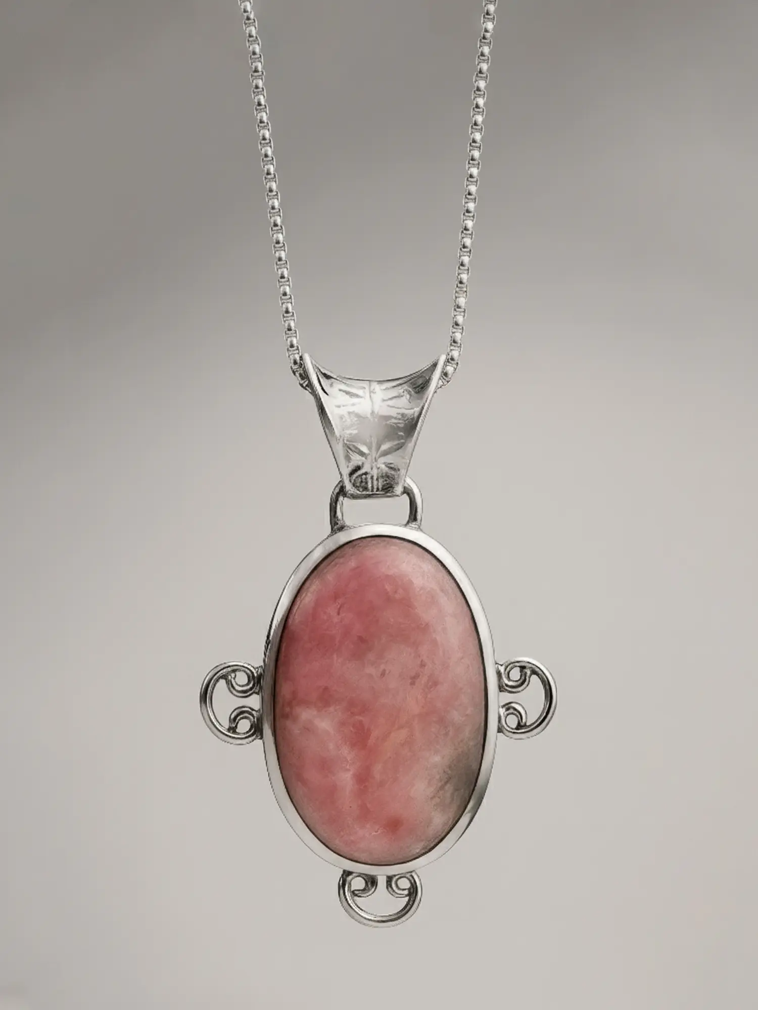 The remarkable rhodochrosite, with its captivating swirls of pink and hints of earthy tones, is presented in an elegant oval cut, measuring approximately 1.7 inches in height and 1.2 inches in width. This size ensures a noticeable yet refined presence, making it a versatile statement piece. Delicate filigree work adorns the bail, adding a touch of intricate beauty that complements the organic flow of the stone.