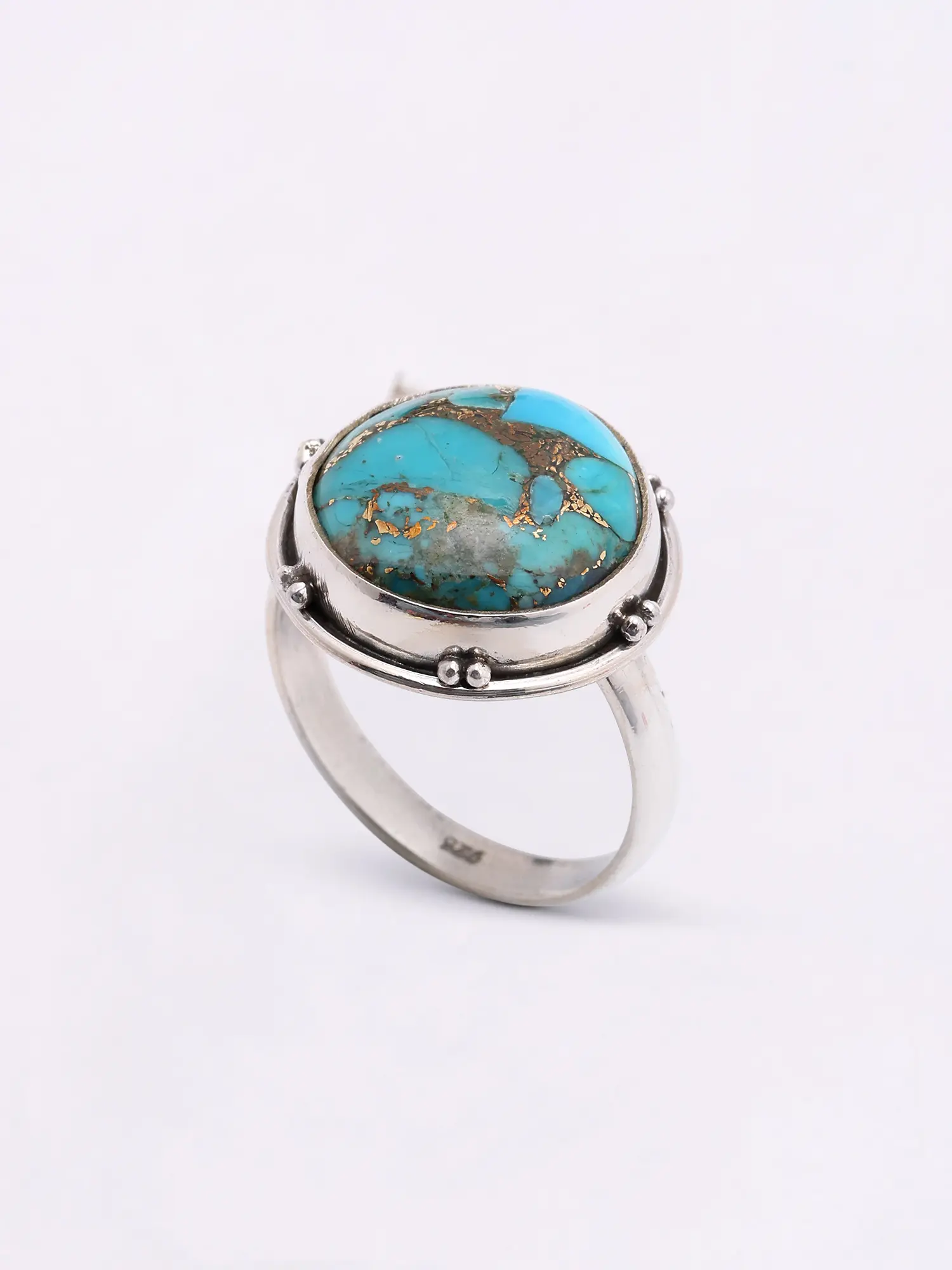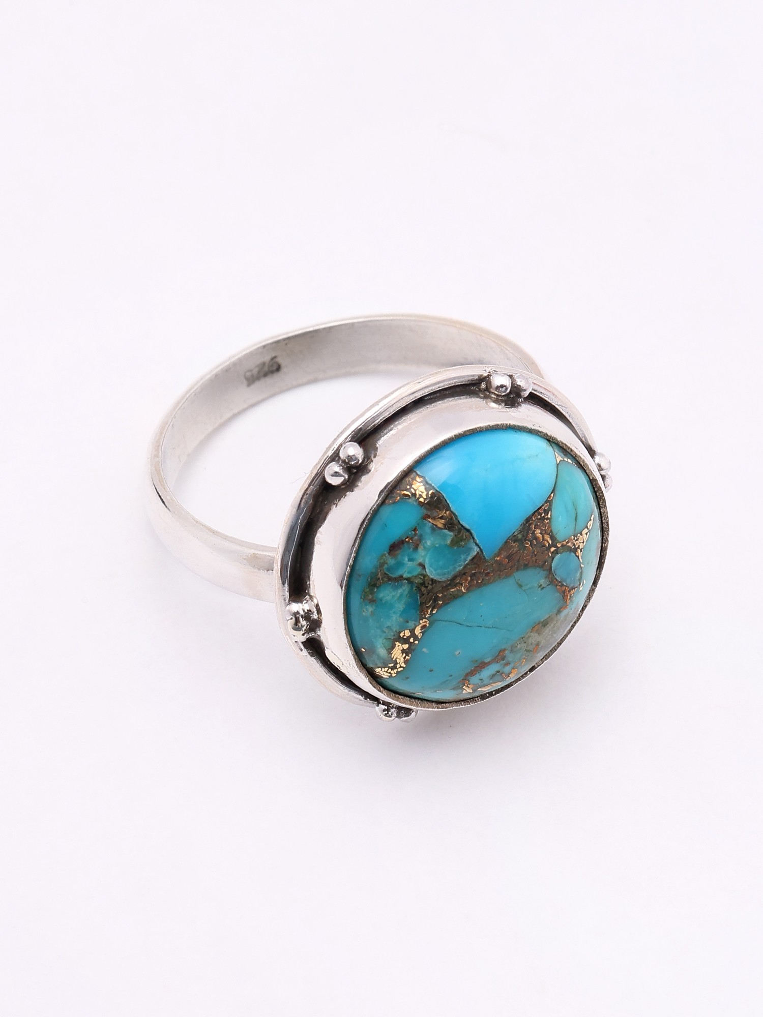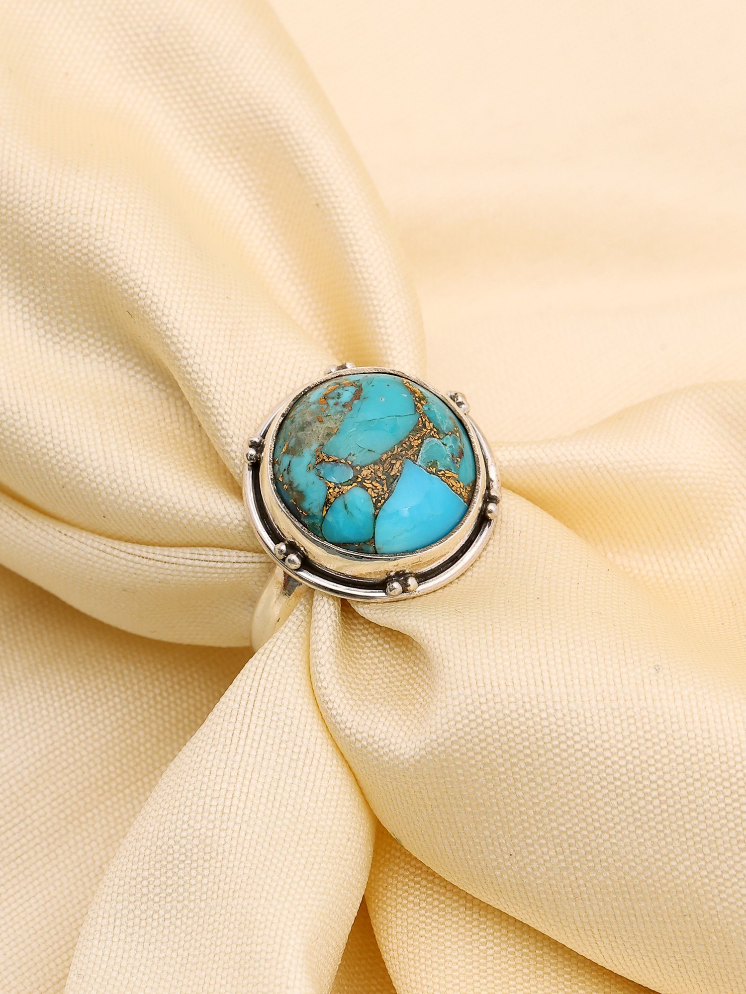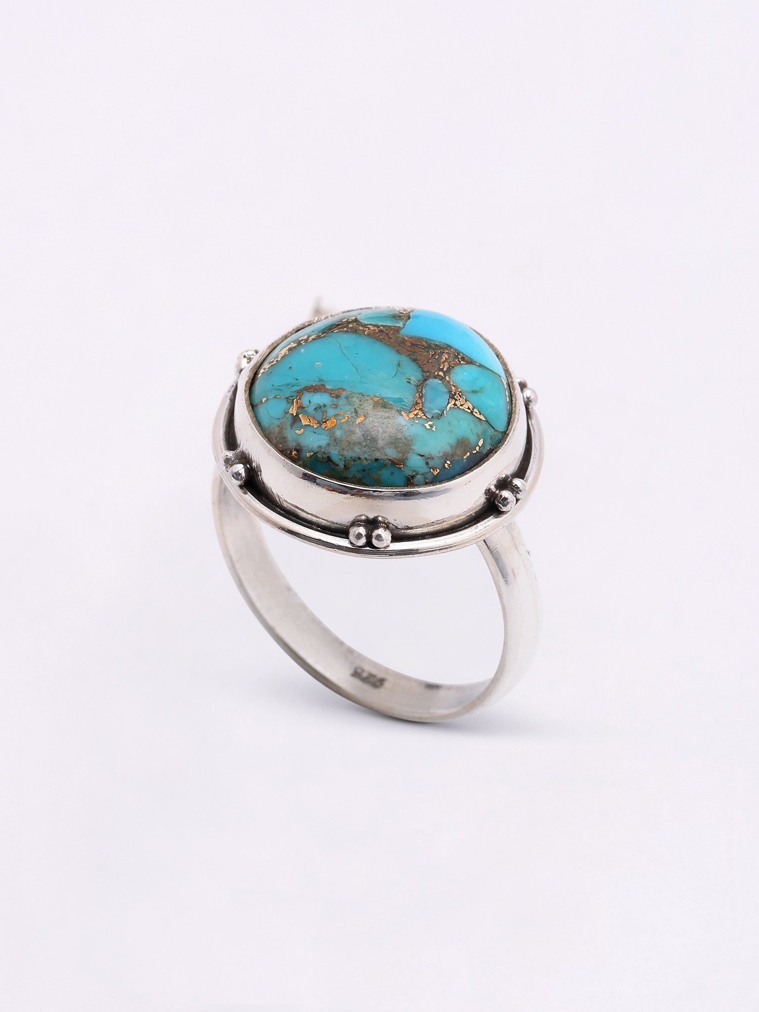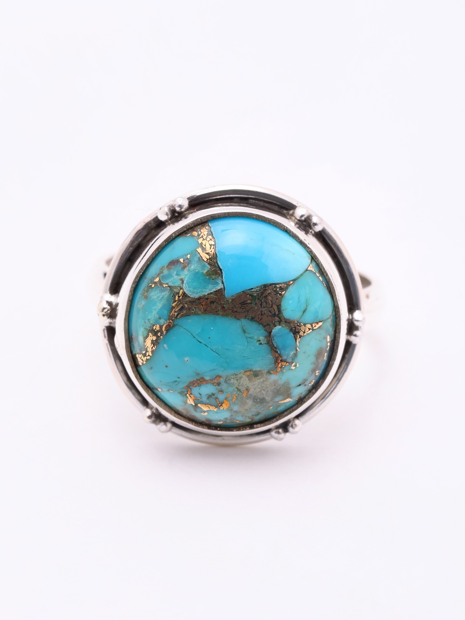 This ring is more than just an accessory; it's a piece of wearable art that can effortlessly transition from casual to formal occasions. Wear it to add a pop of color and intrigue to your everyday denim and a crisp white shirt, or let it be the crowning jewel of your evening ensemble. The natural beauty of the copper turquoise pairs wonderfully with a variety of colors, making it an incredibly versatile addition to any jewelry collection. It's a piece that speaks of adventure, freedom, and a deep connection to the natural world.