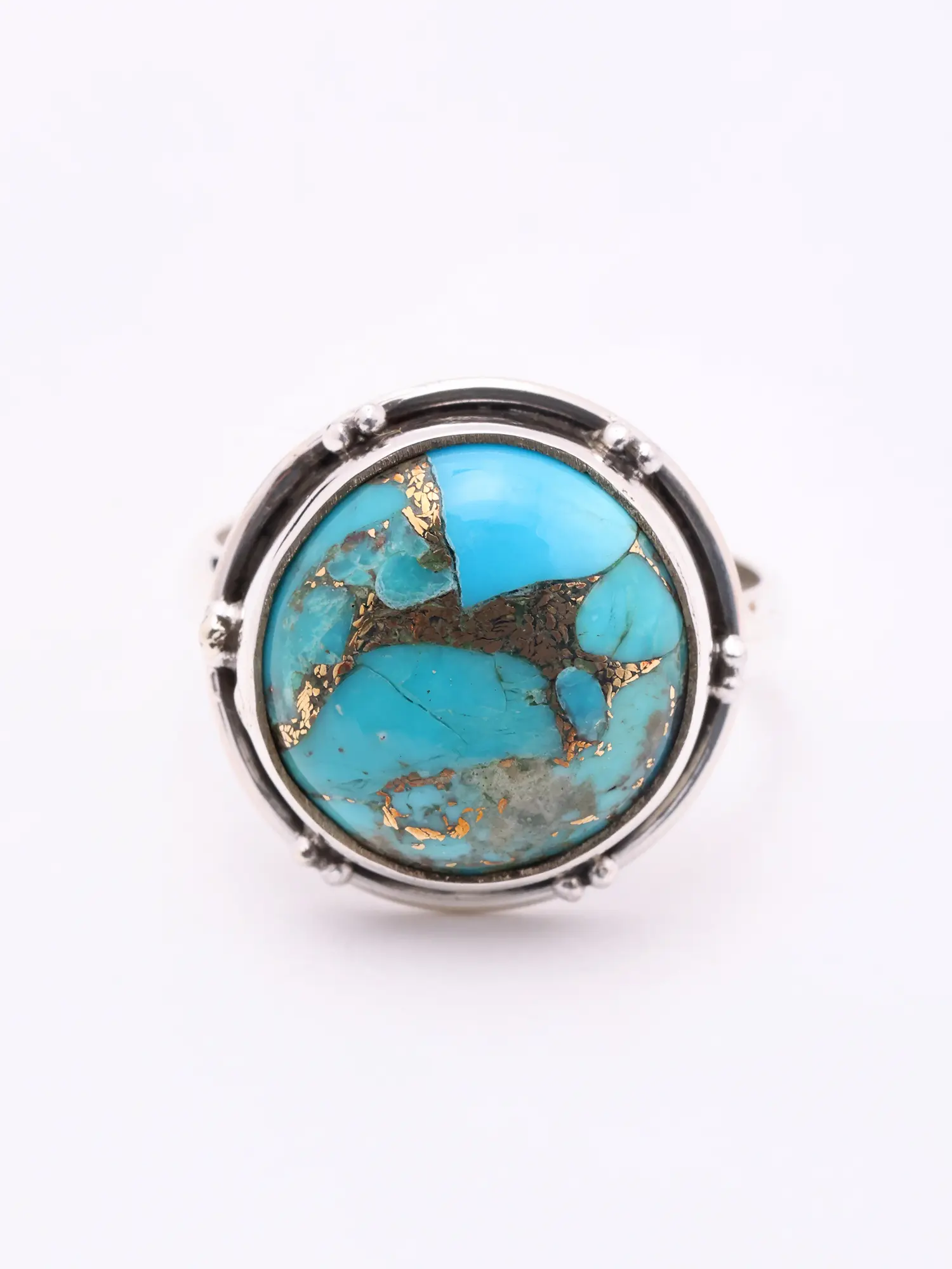 Embrace the captivating beauty of the desert sky and the rich veins of the earth with this exquisite ring. At its heart lies a breathtaking copper turquoise gemstone, a natural marvel boasting a vibrant mosaic of cerulean blues and earthy copper tones. Each piece of copper turquoise is utterly unique, a testament to nature's artistry, ensuring your ring is a one-of-a-kind statement of personal style. The stone's smooth, polished surface reflects light beautifully, drawing the eye to its intricate matrix of golden-brown webbing, reminiscent of ancient maps or starlit constellations.