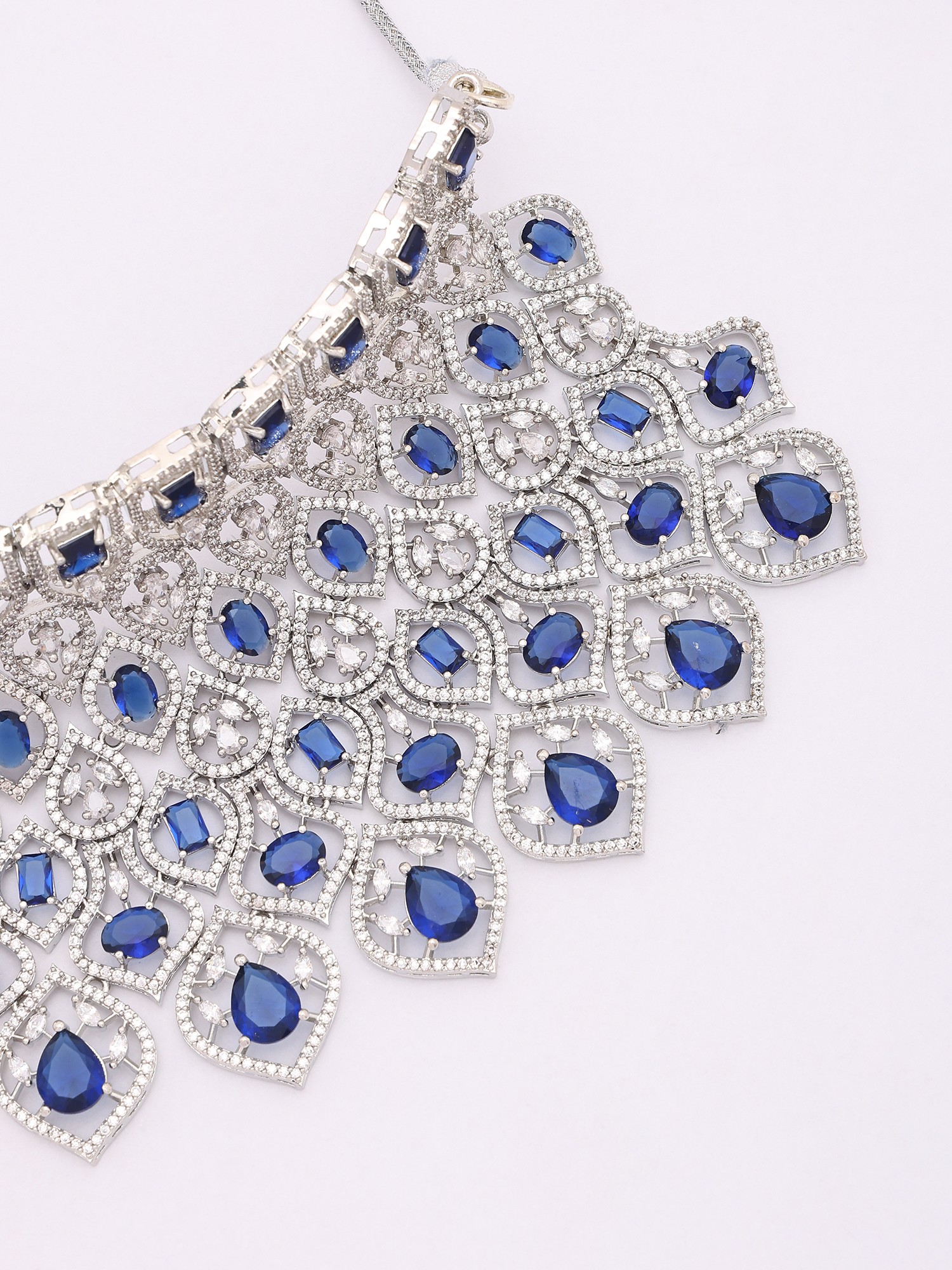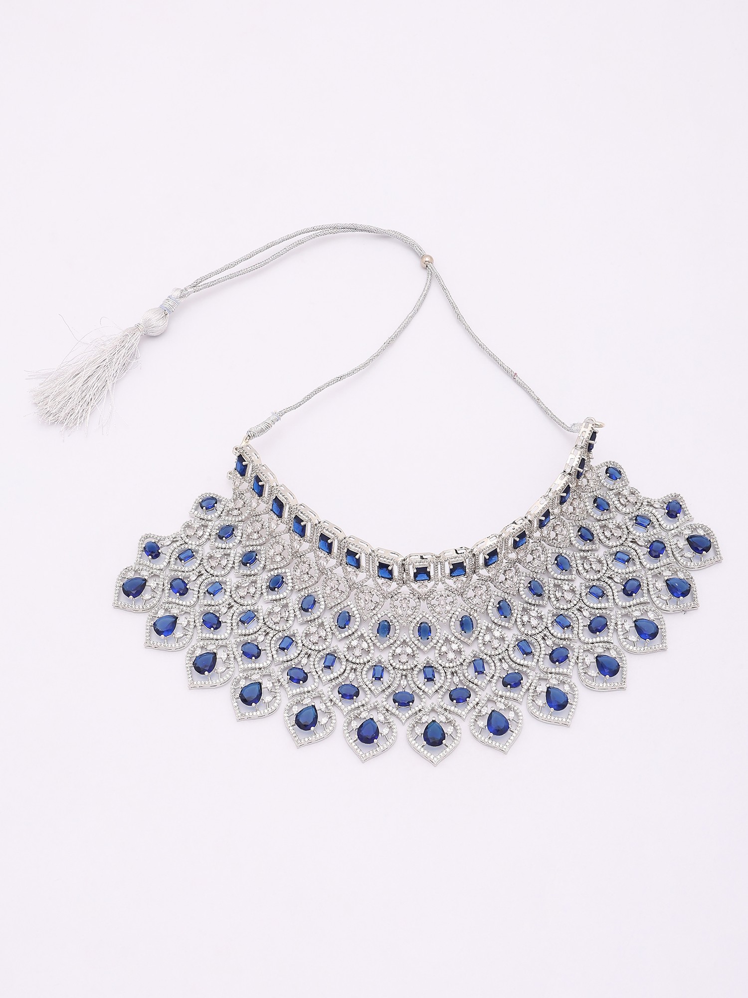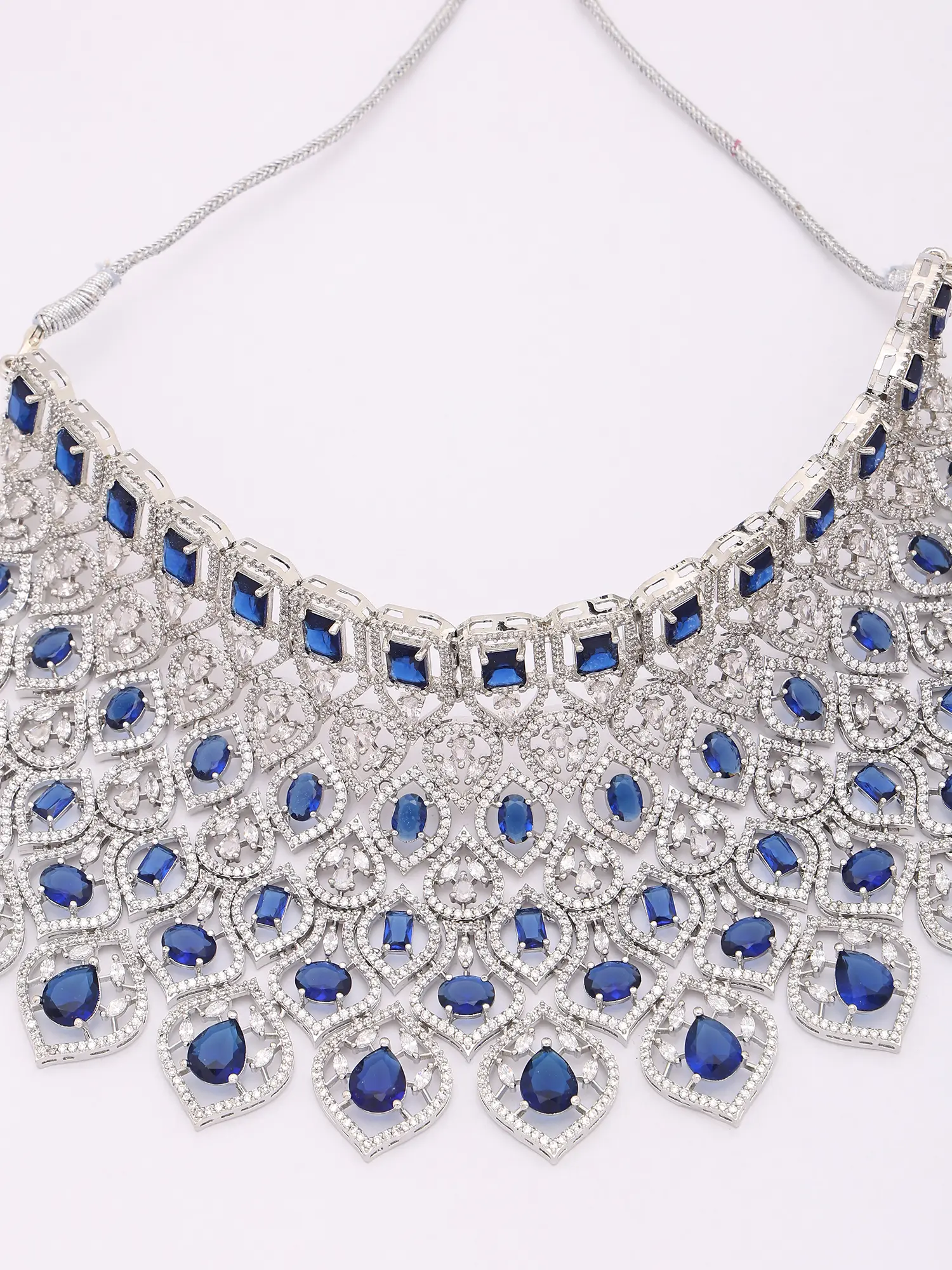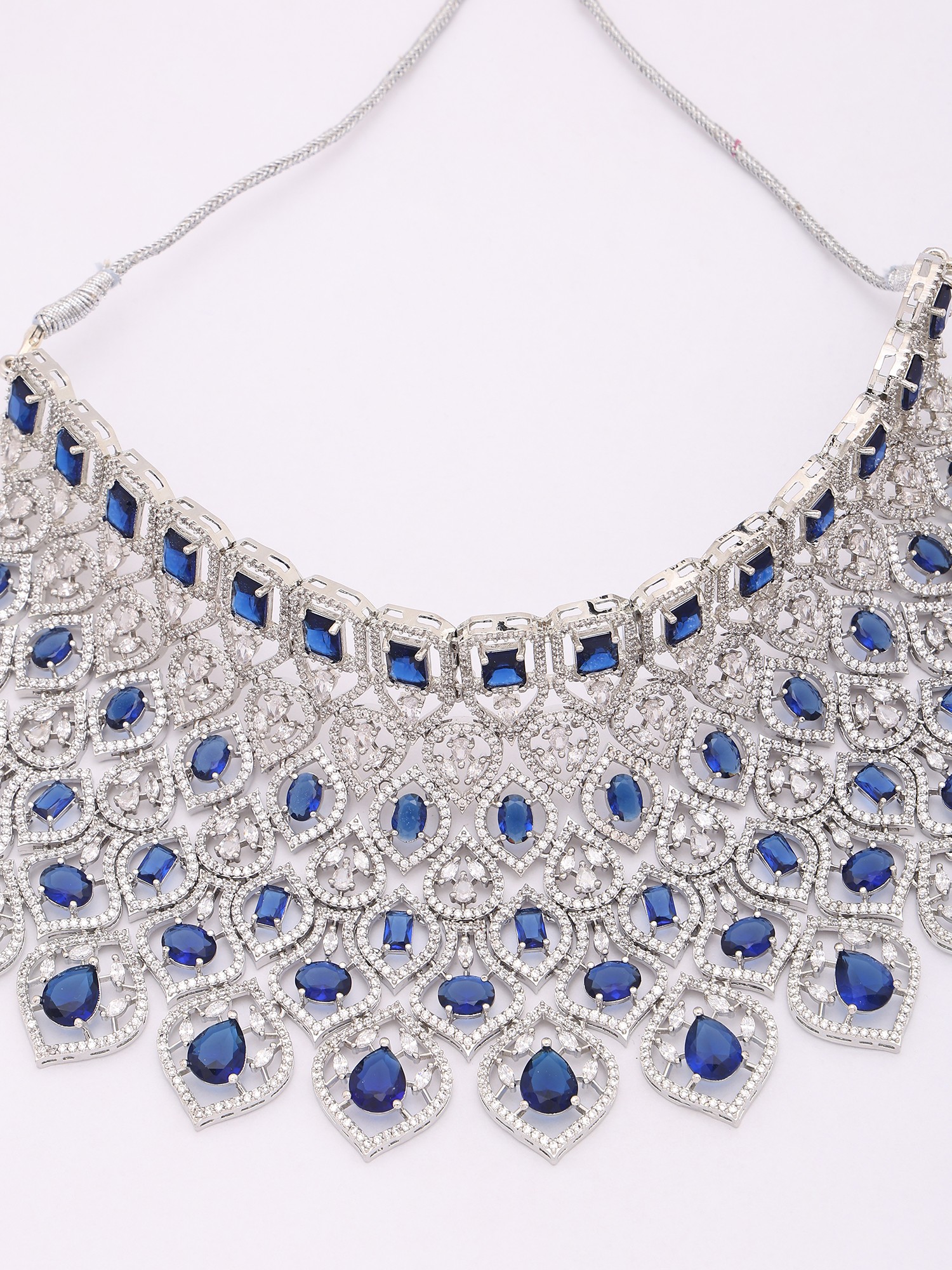Features a dazzling display of royal blue American diamonds, intricately set in a luxurious bridal necklace.