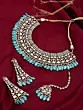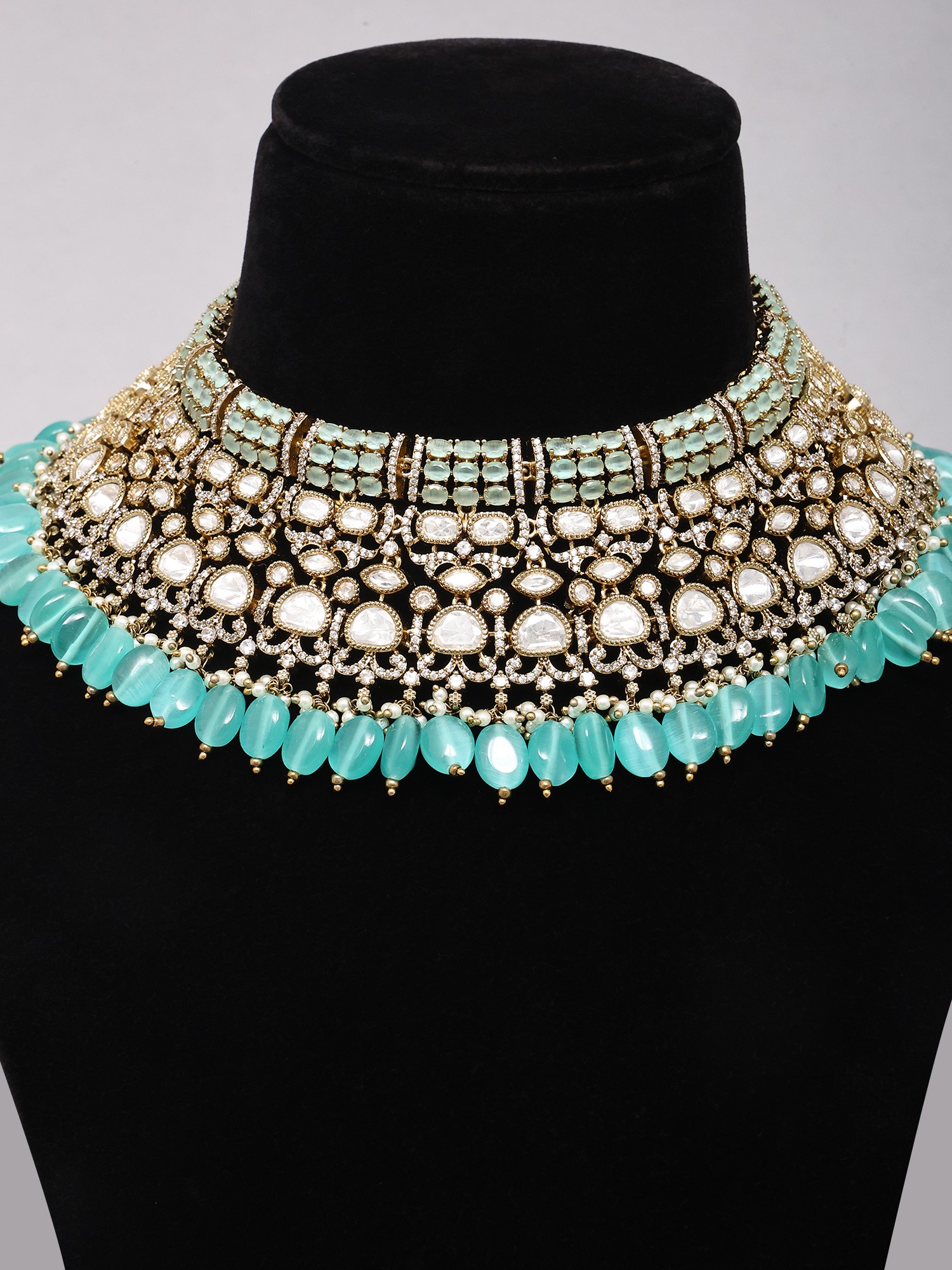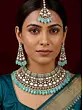 Features a striking choker necklace adorned with intricate Kundan work and vibrant sea green drop stones.