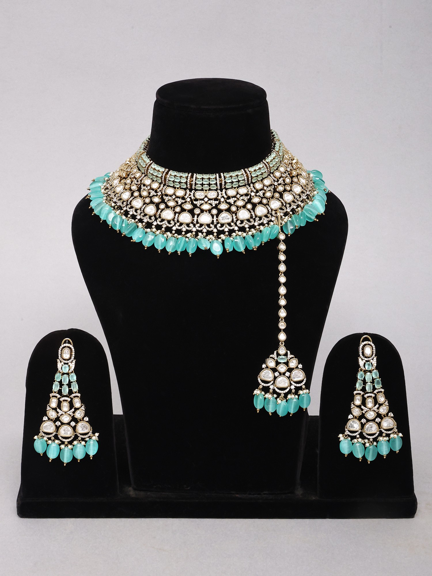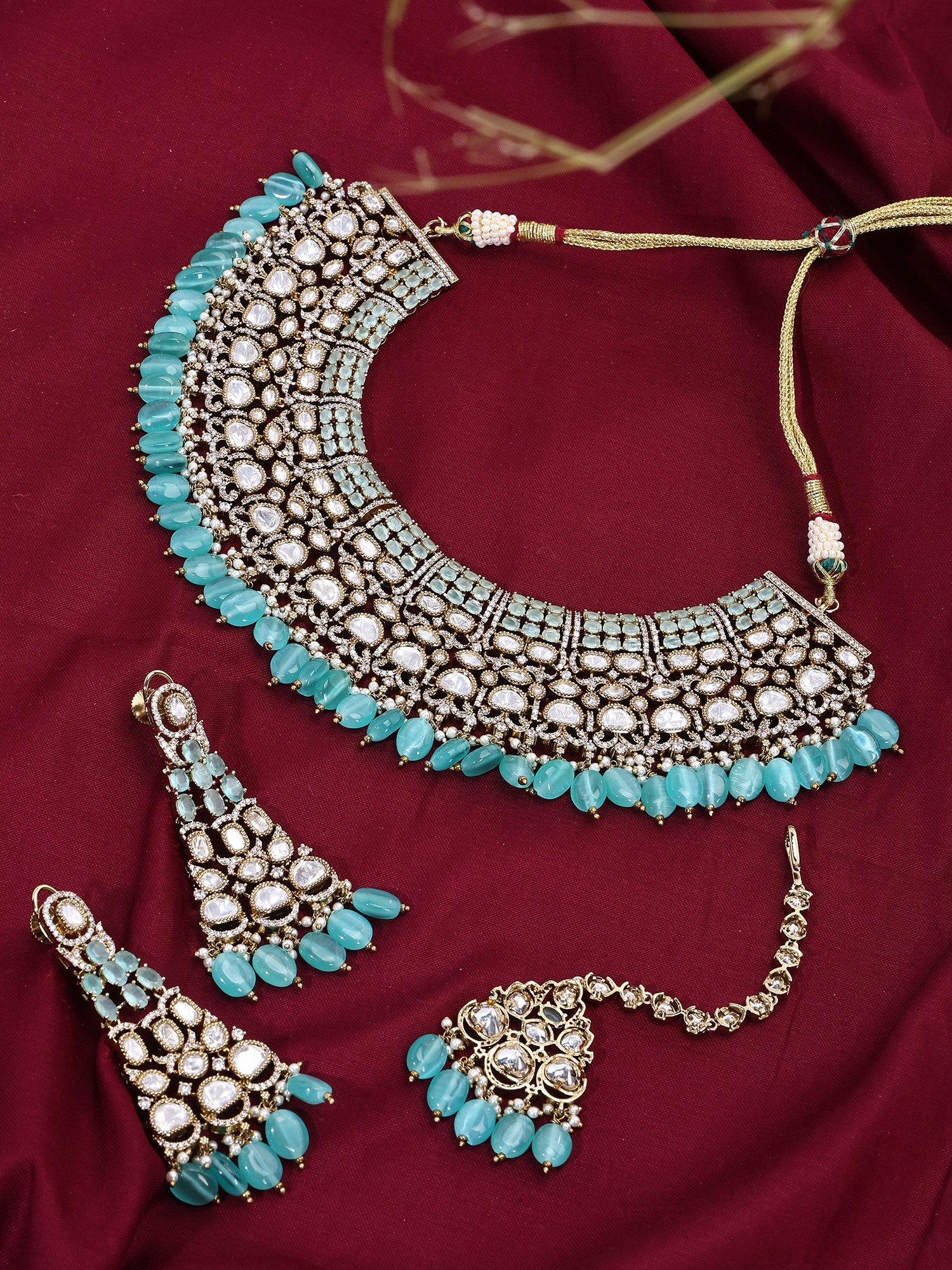Sea Green Drop Kundan Bridal Choker Necklace Set with Long Earrings and Maang Tikka