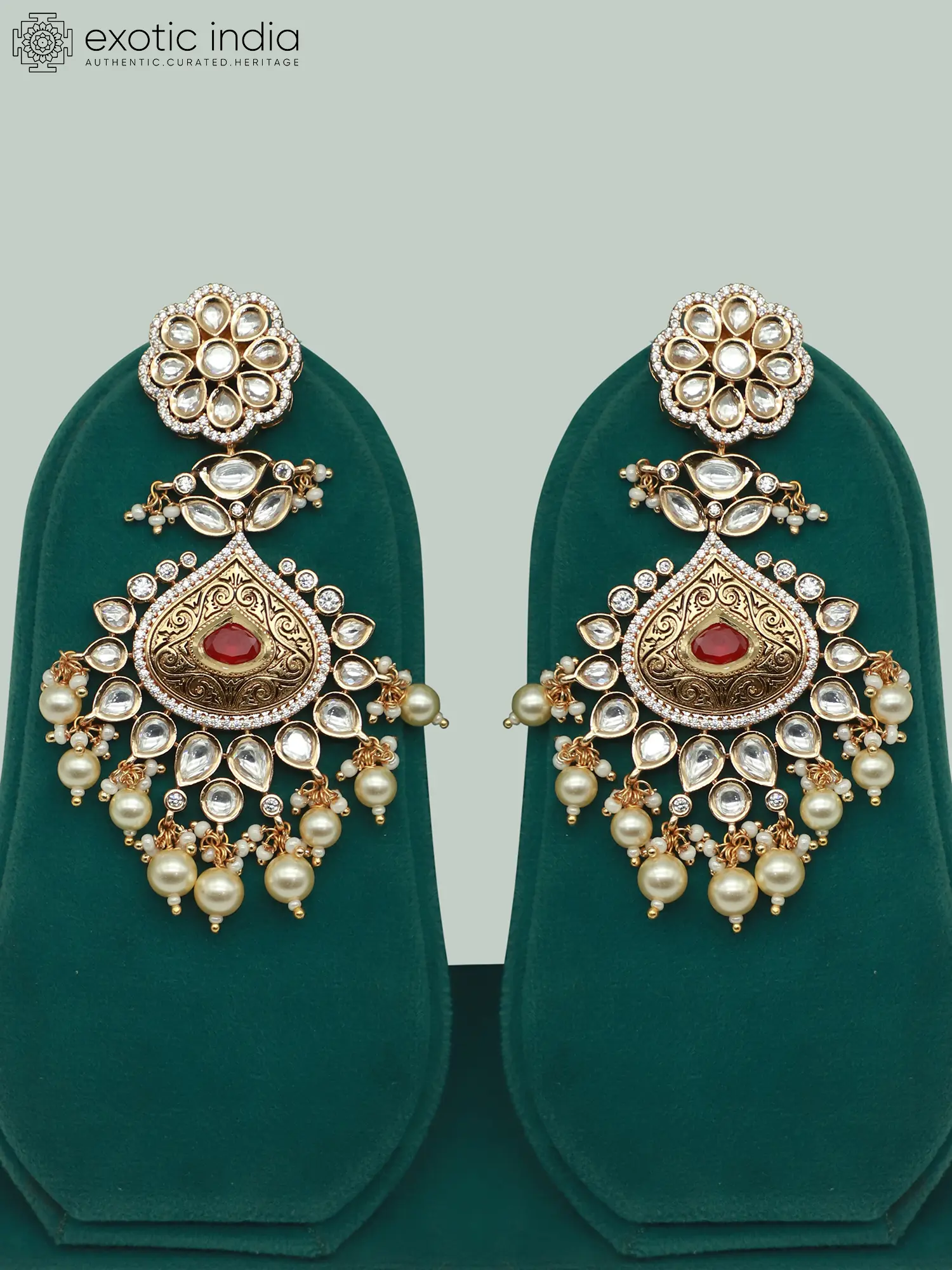 The necklace showcases a breathtaking array of Kundan stones, each meticulously set to capture and reflect light. The stones are arranged in an elaborate pattern, creating a cascading effect that draws the eye. Delicate pearls enhance the overall design, providing a touch of soft elegance and enhancing the luster of the Kundan stones. The centerpiece showcases a refined arrangement of precious beads, adding vibrant color and depth to the design. Crafted from brass, this set promises durability and timelessness. The skillful craftsmanship ensures that each piece is not just jewelry, but a work of art designed to be cherished for years to come.
