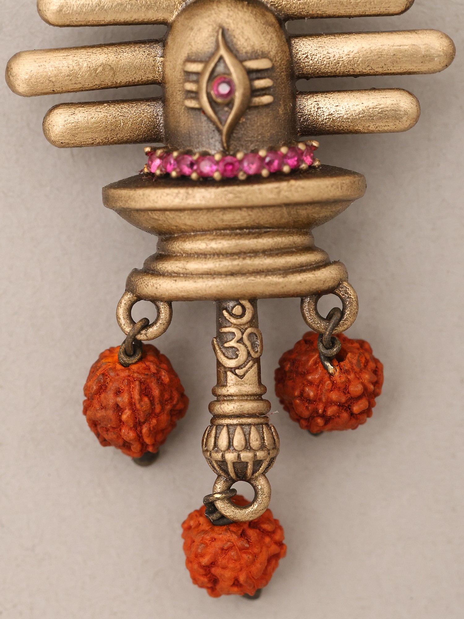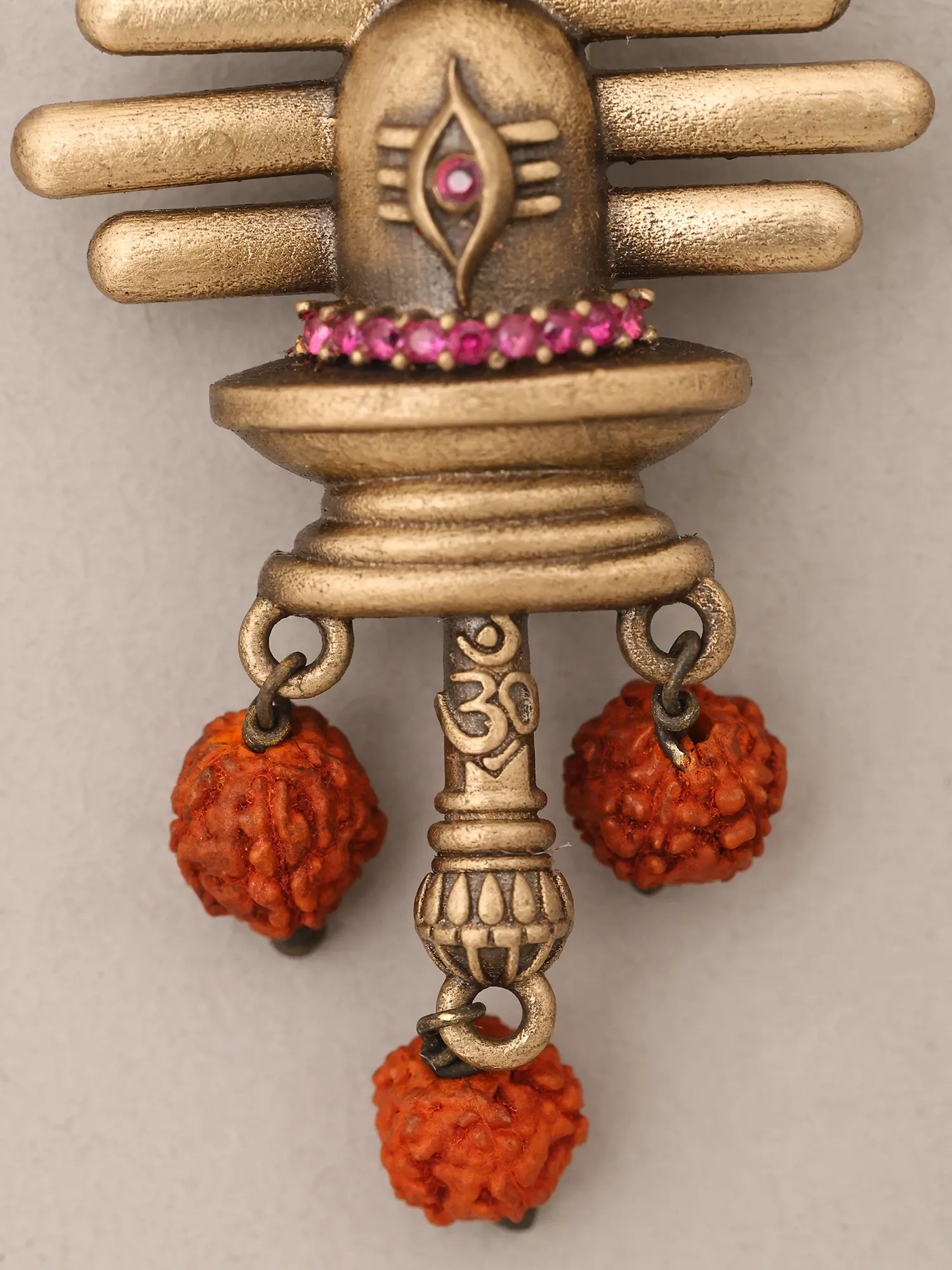 Standing at 2.45 inches in height with a width of 1 inch, this accessory features a commanding yet balanced presence. The majestic Trishul crest is perfectly complemented by the serene form of the Lingam, intricately detailed with a band of vibrant pink stones. Delicate Rudraksha beads, symbolizing divine protection and spiritual growth, add a further layer of authentic charm and tactile appeal.